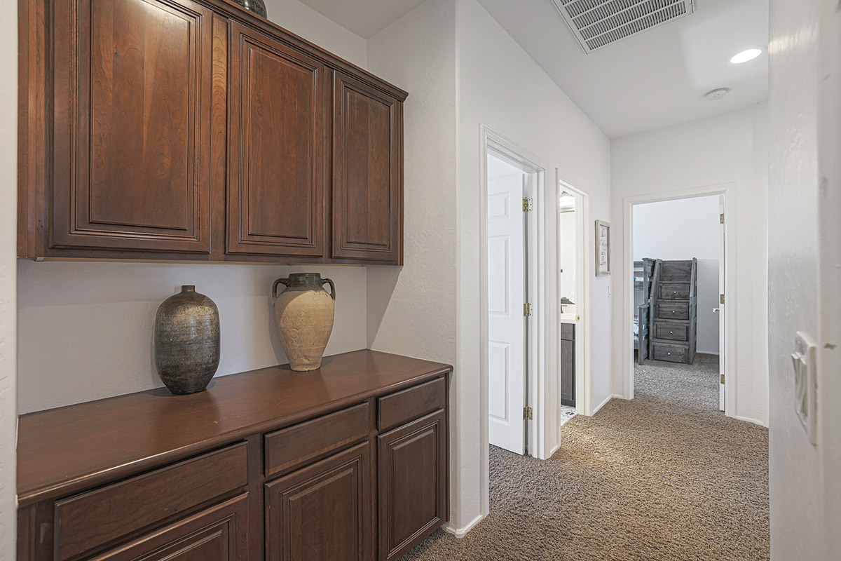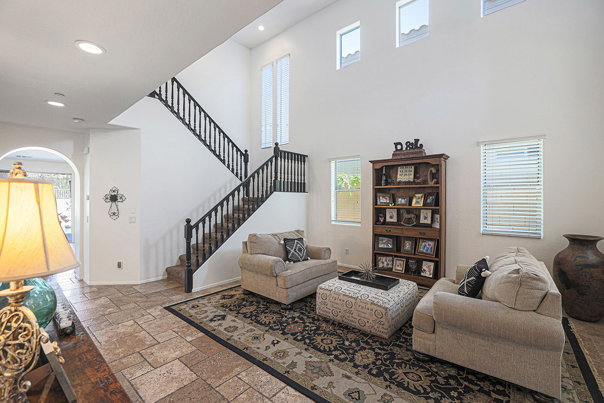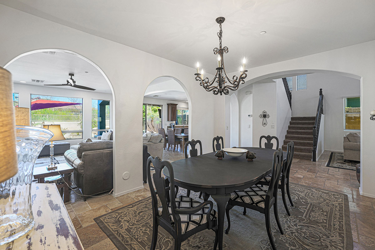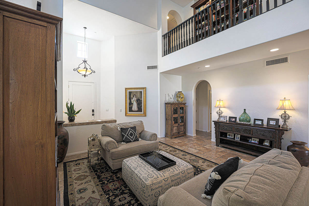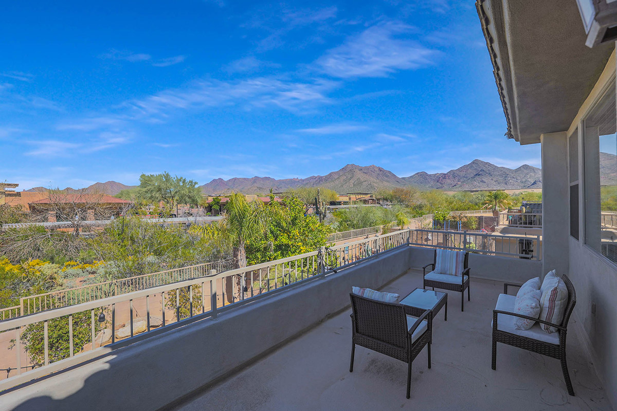 Upon entry you are greeted by the grand staircase which leads to the upstairs, overlooking the living room below from the loft and the built-in library shelves. Continuing upstairs, the master suite has views of McDowell Mountains from the picture windows as well as the private balcony. The master bath was recently remodeled with a spa-like feel featuring a large centerpiece freestanding tub, accent floor tile, double vanities, built-in linen cabinet, walk-in shower with frameless glass surround, private water closet and a walk-in closet. The other end of the upstairs features three additional bedrooms, a large laundry with cabinets and a remodeled hall bath with on trend finishes.