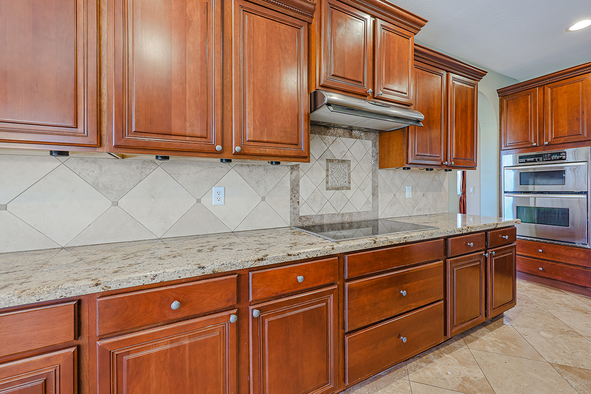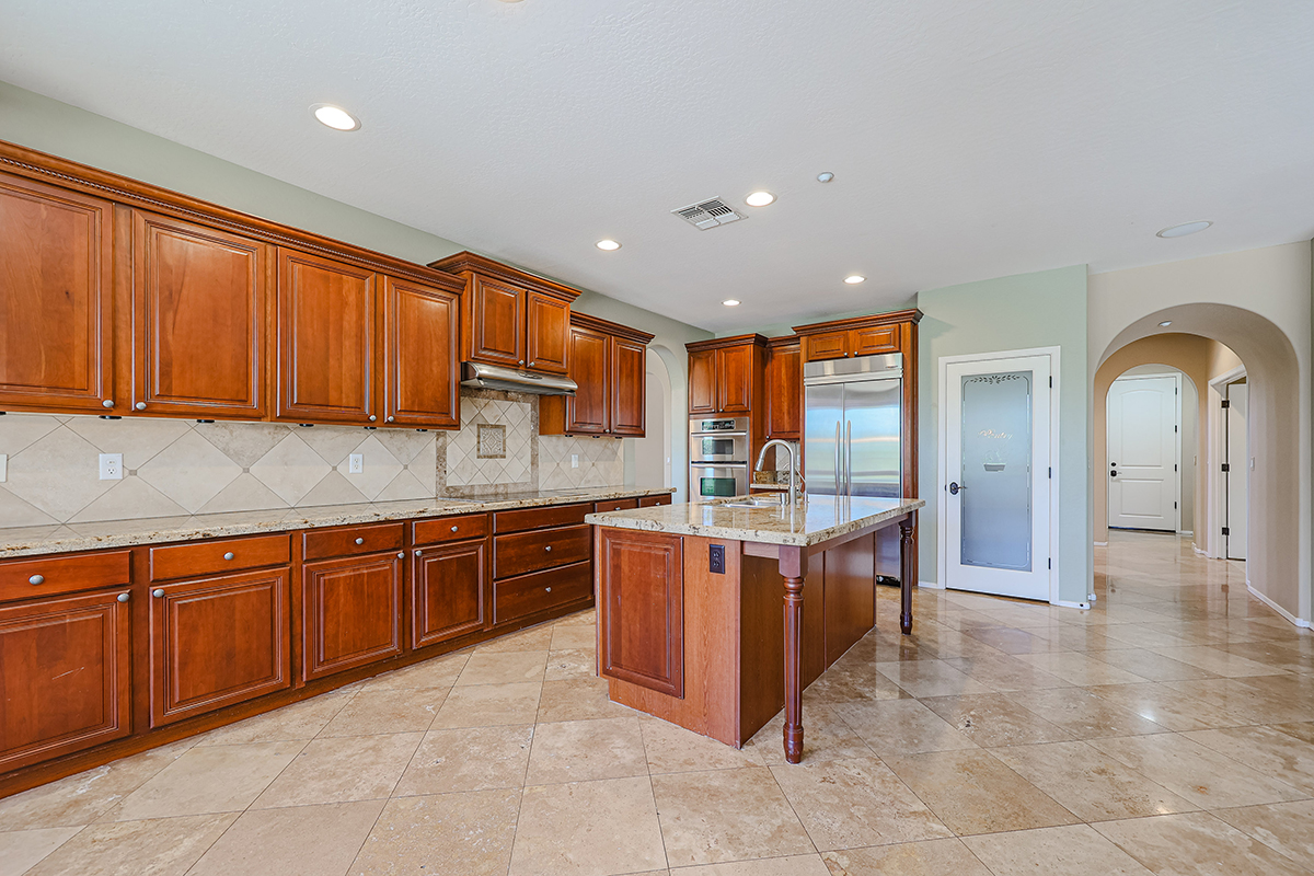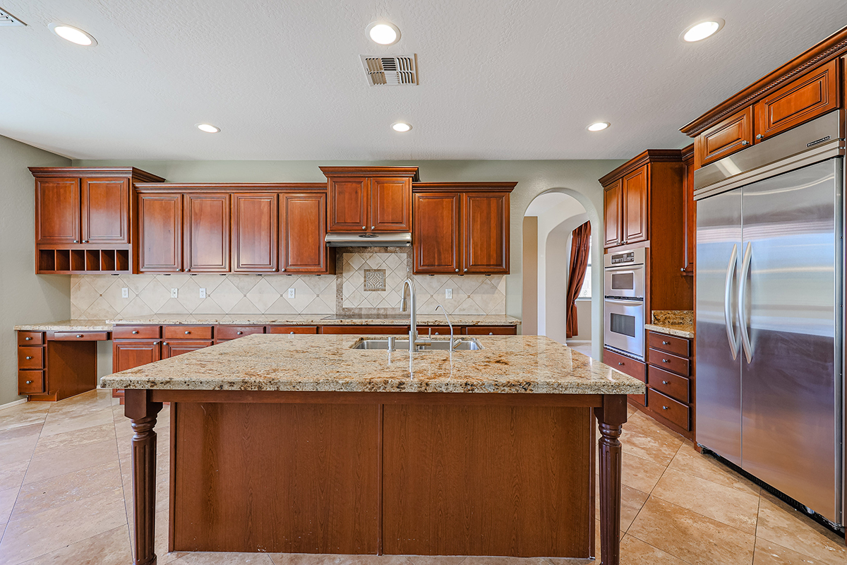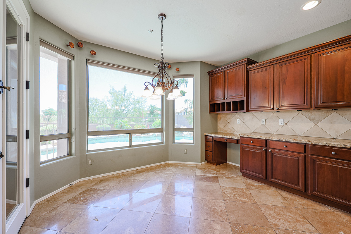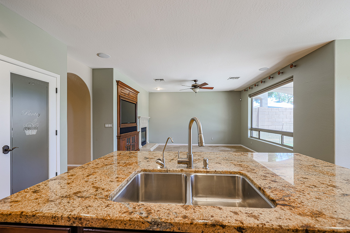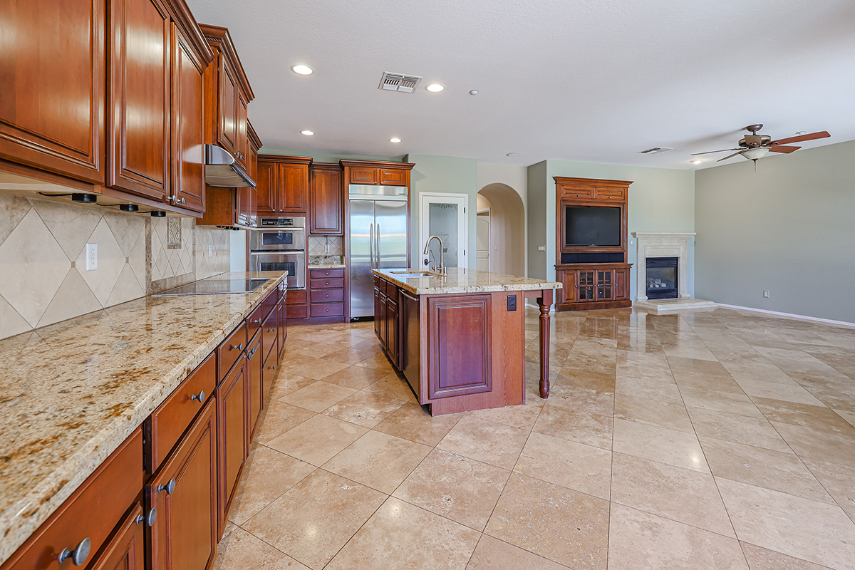 The kitchen has ample countertop and cabinet space with stainless steel appliances, breakfast nook, walk-in pantry, center island with seating, built-in desk, all open to the family room with fireplace and built-in TV and surround sound.