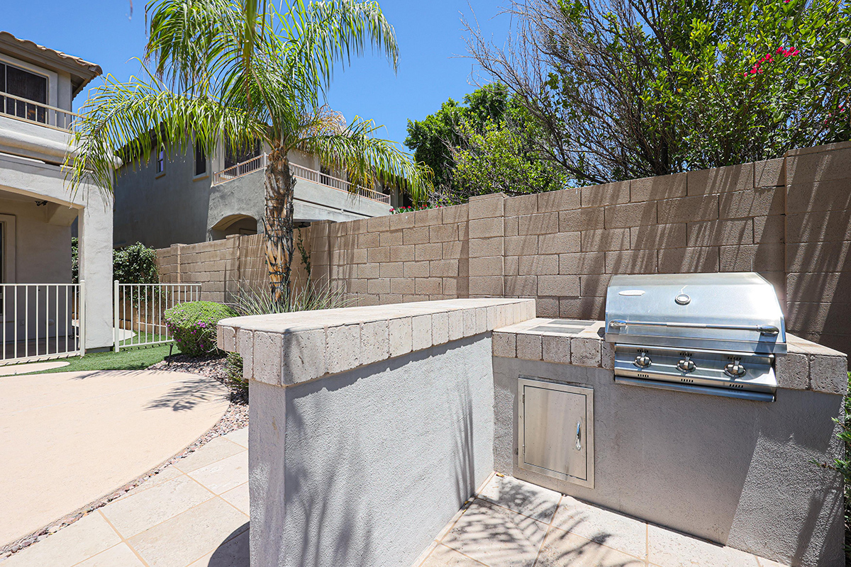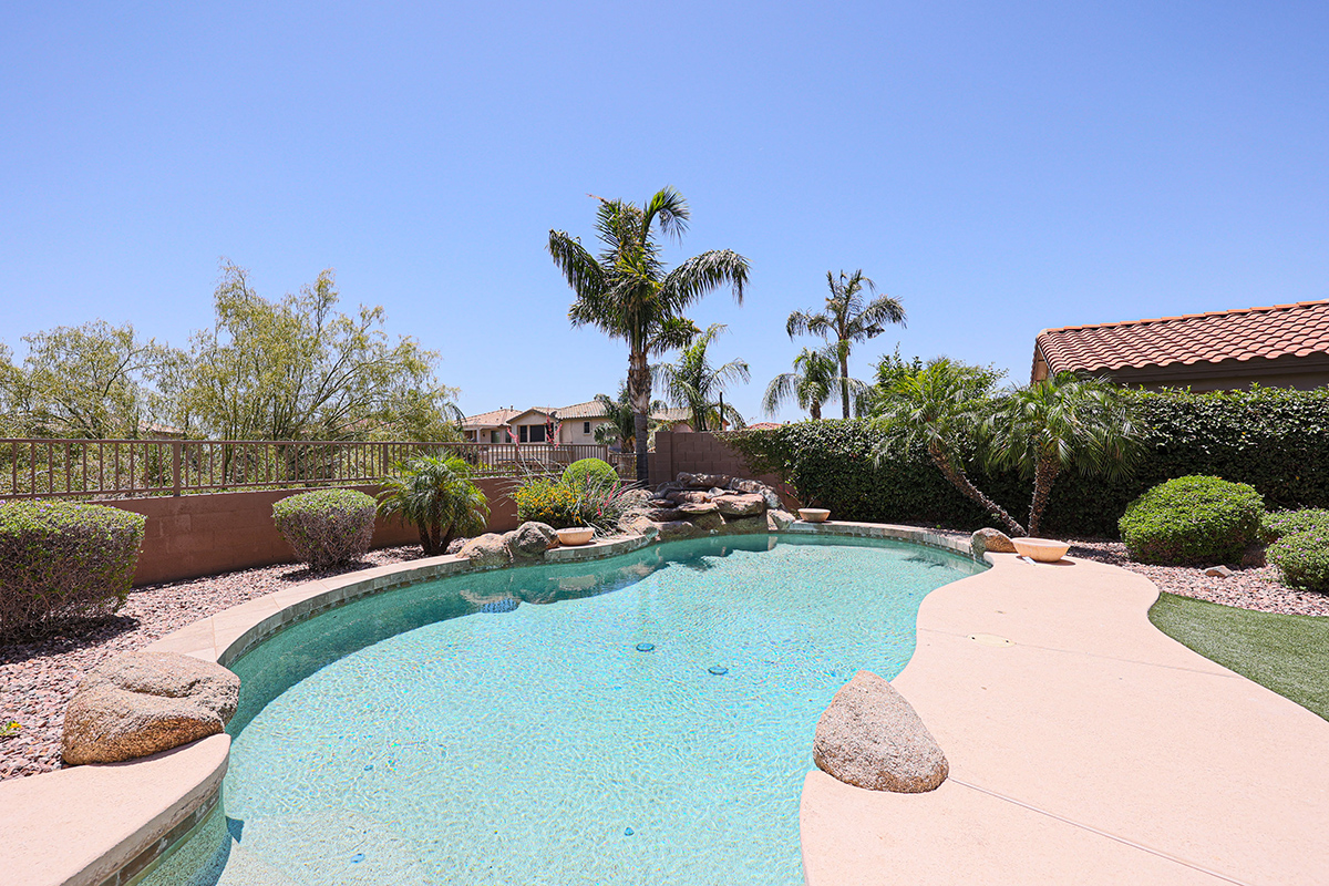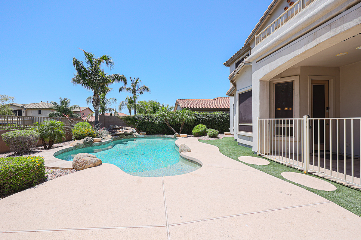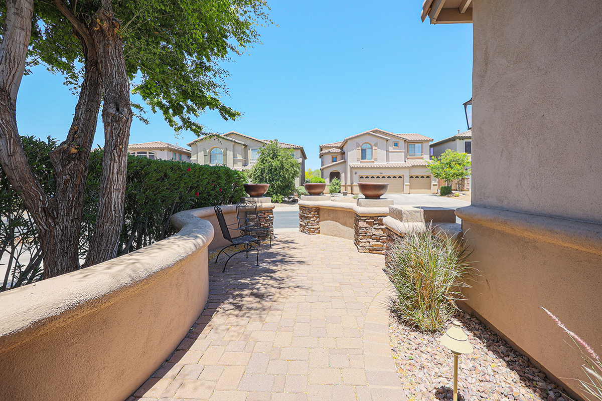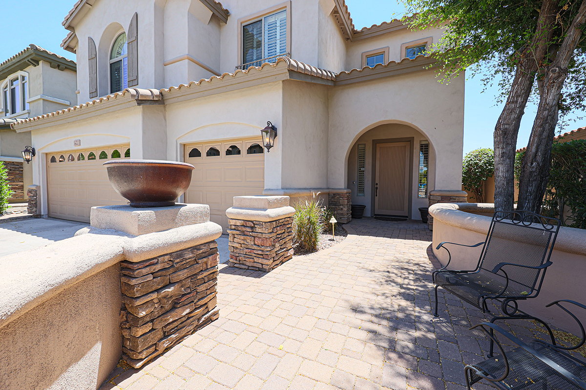 The backyard features a pool with water feature, artificial turf, built-in barbecue with countertop seating, and backs to the open area space for a private feel. Rent includes the pool and landscaping services for easy maintenance. The classic finishes throughout have a timeless feel. Tile floors, water softener, master bedroom private balcony, plenty of storage and a three car garage.