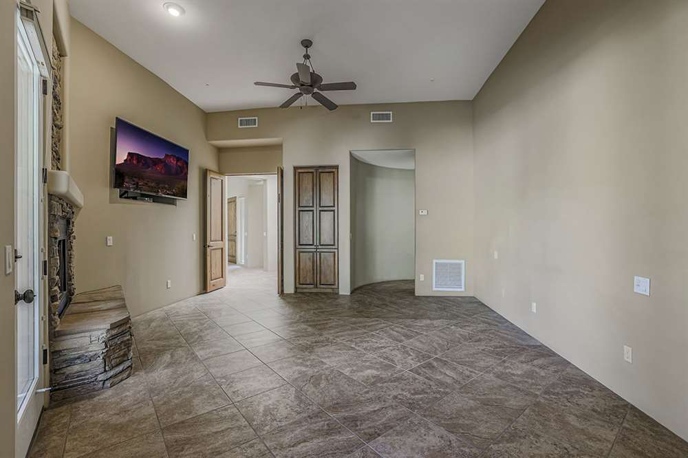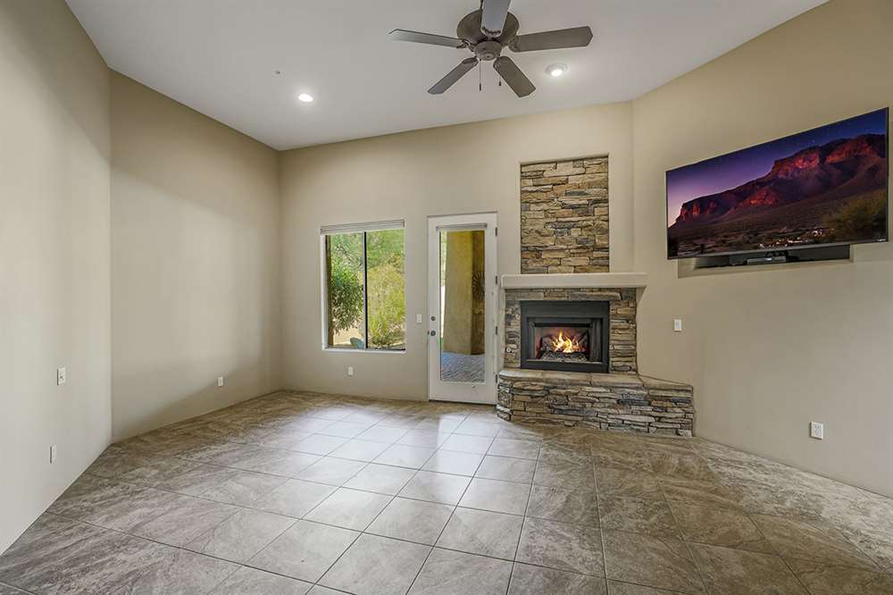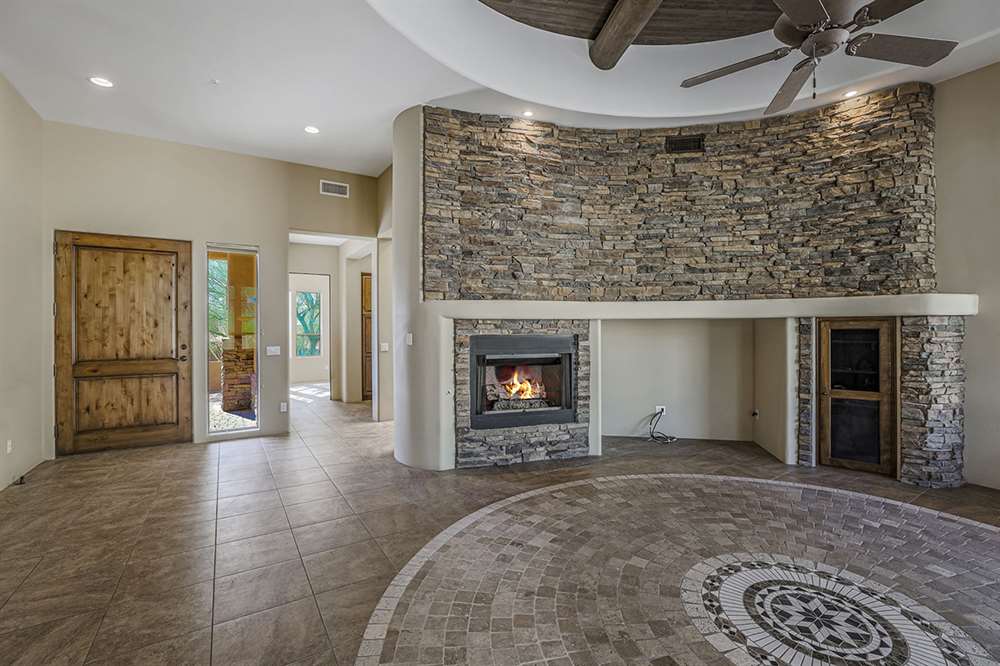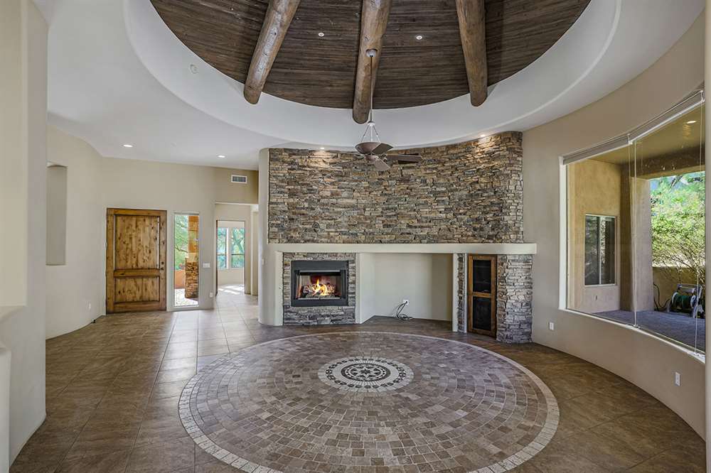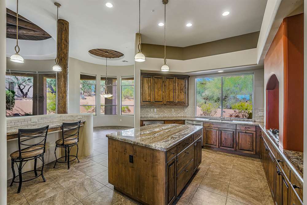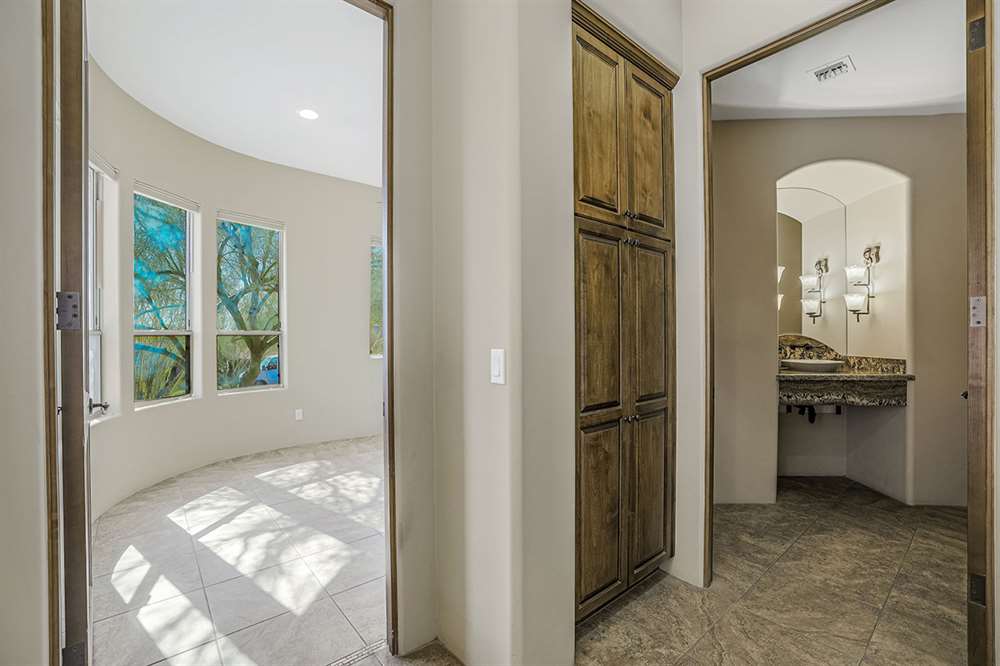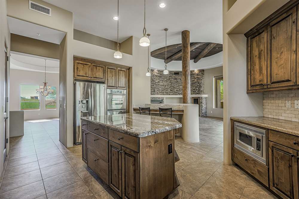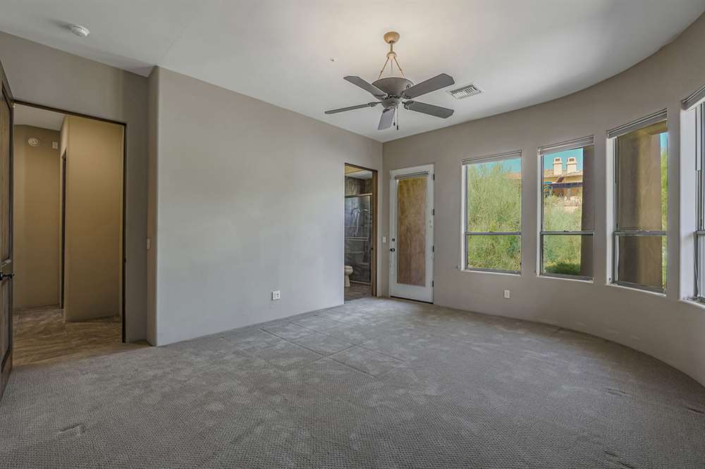 The soft southwestern styling can be found in the use of stacked stone, sand finish stucco, hand carved wood beams, richly stained custom cabinetry and wood doors, and smooth finish interior walls found throughout the property. The master bedroom features a fireplace, exterior patio access, and a large master suite with separate shower and soaking tub, ample cabinetry, dual sinks, and a walk-in closet.