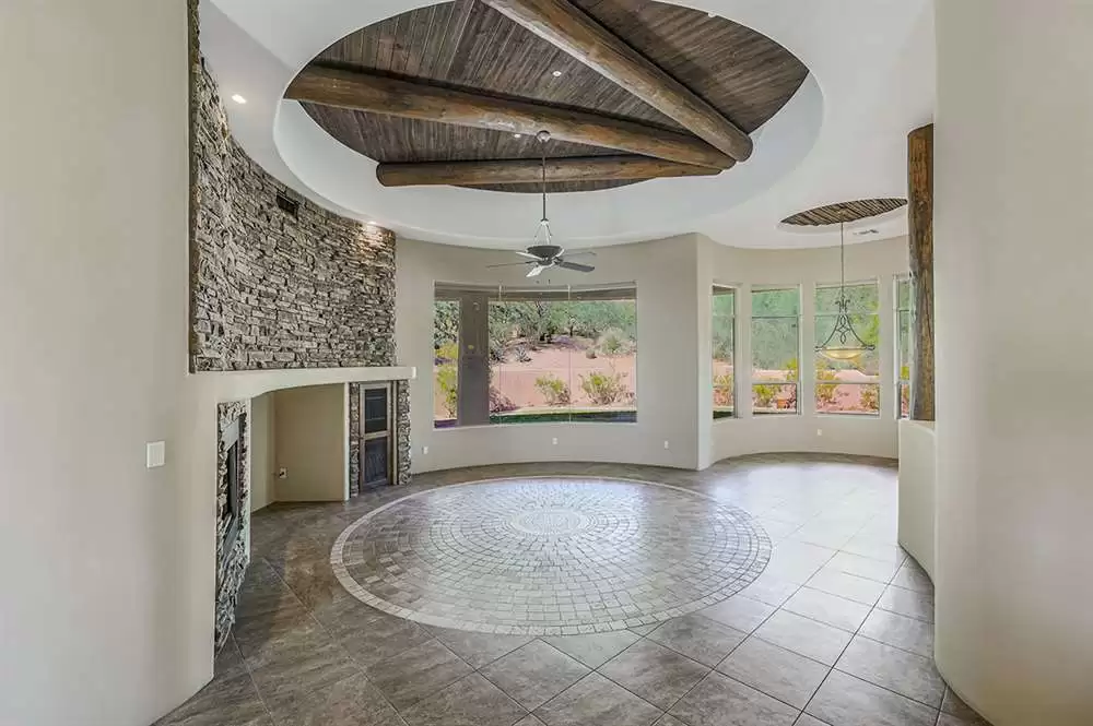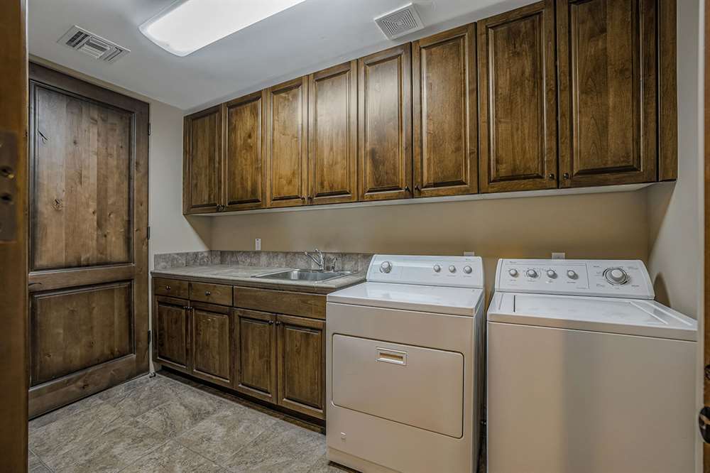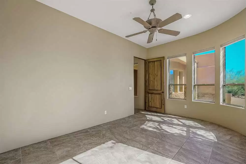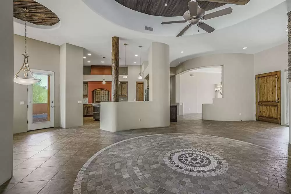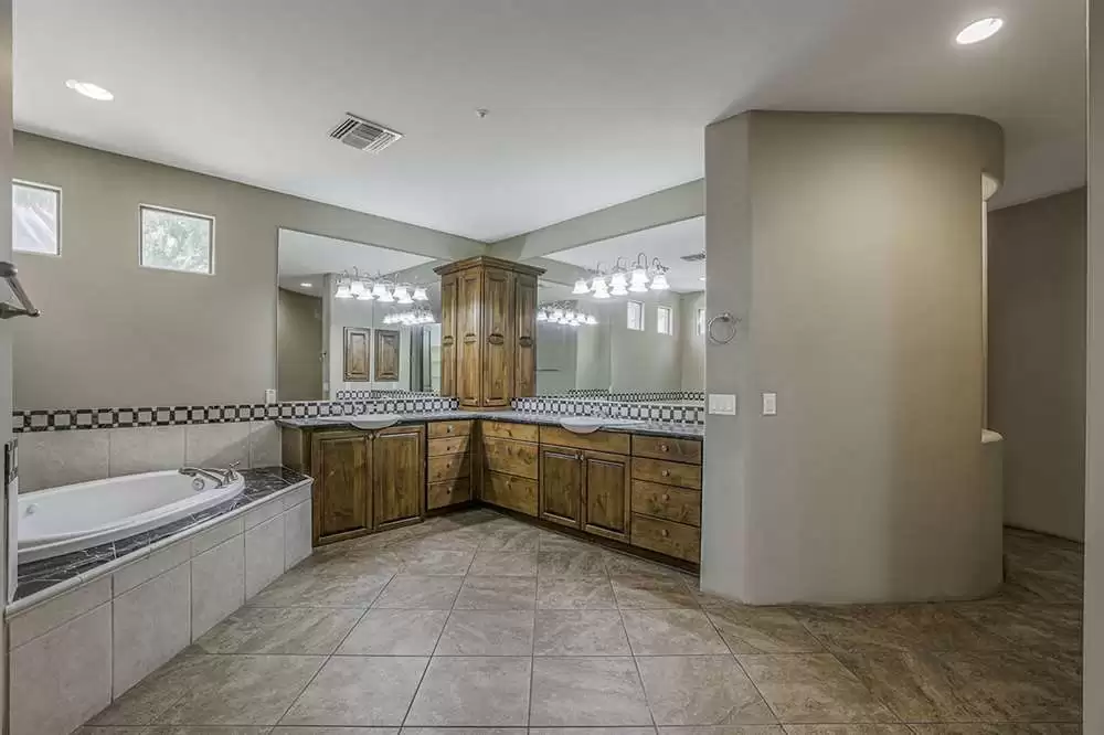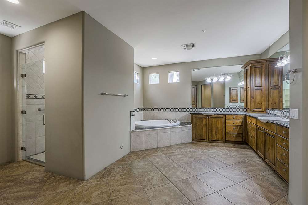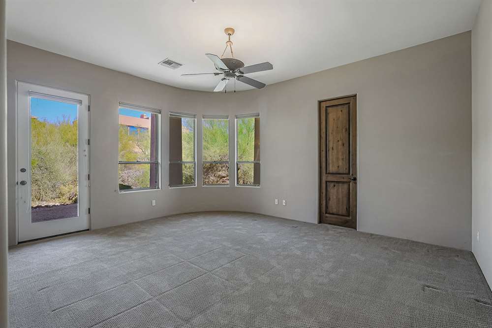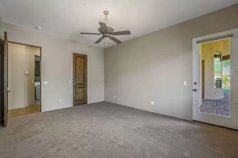 The soft southwestern styling can be found in the use of stacked stone, sand finish stucco, hand carved wood beams, richly stained custom cabinetry and wood doors, and smooth finish interior walls found throughout the property. The master bedroom features a fireplace, exterior patio access, and a large master suite with separate shower and soaking tub, ample cabinetry, dual sinks, and a walk-in closet.