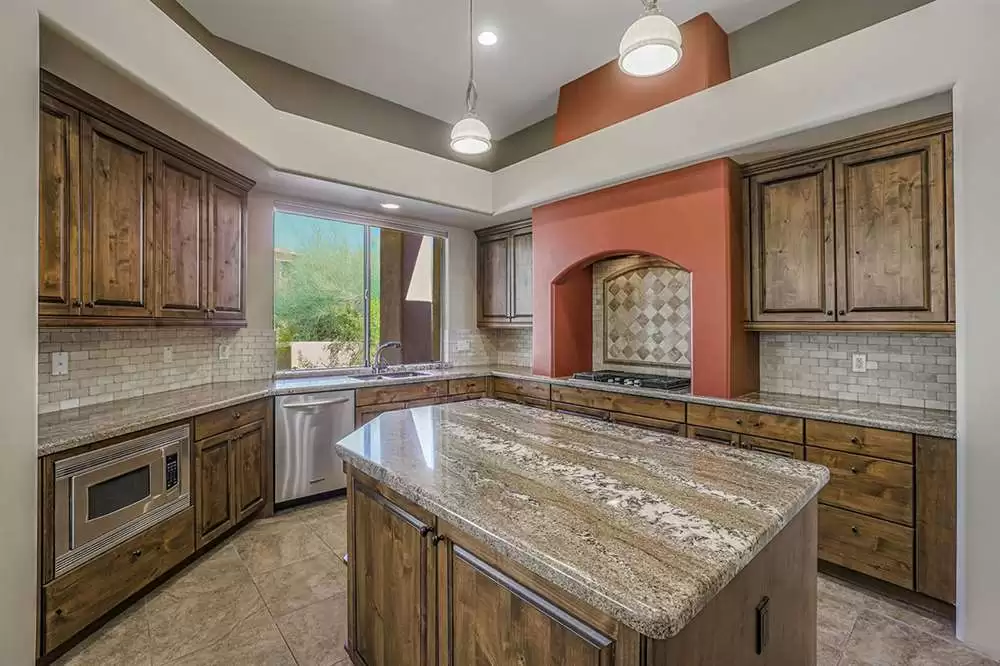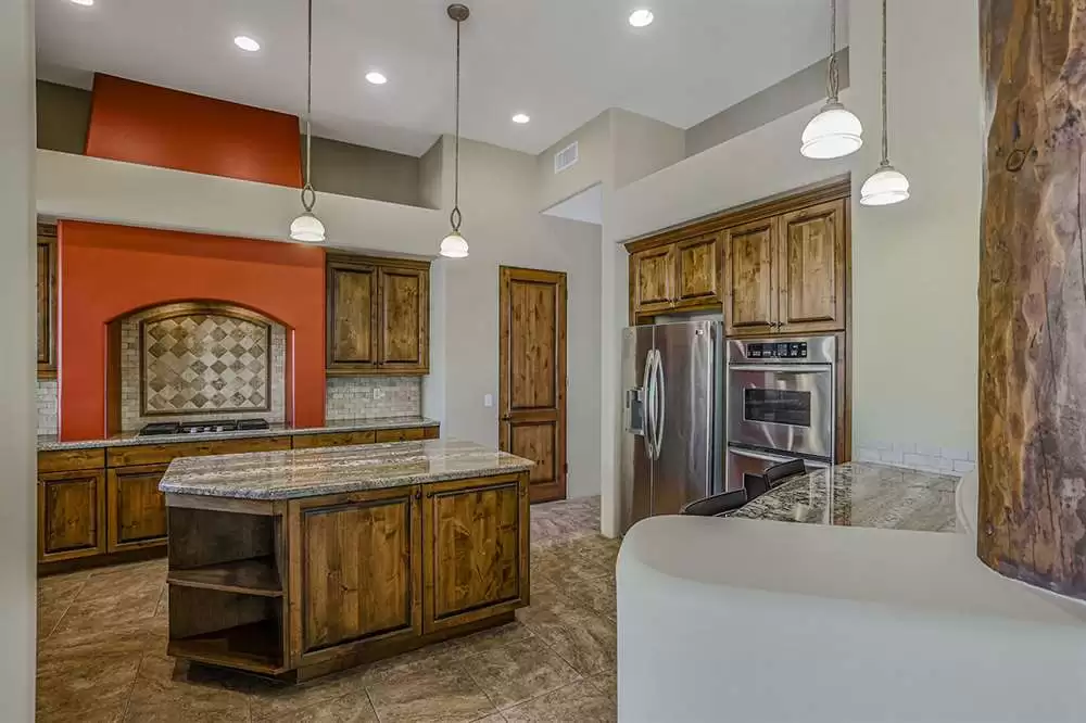 The kitchen is across from the formal dining room with stainless steel appliances including gas cooktop, double ovens, center prep island, built-in bar counter and seating, granite counters, tile backsplash and a wonderfully framed hood vent.