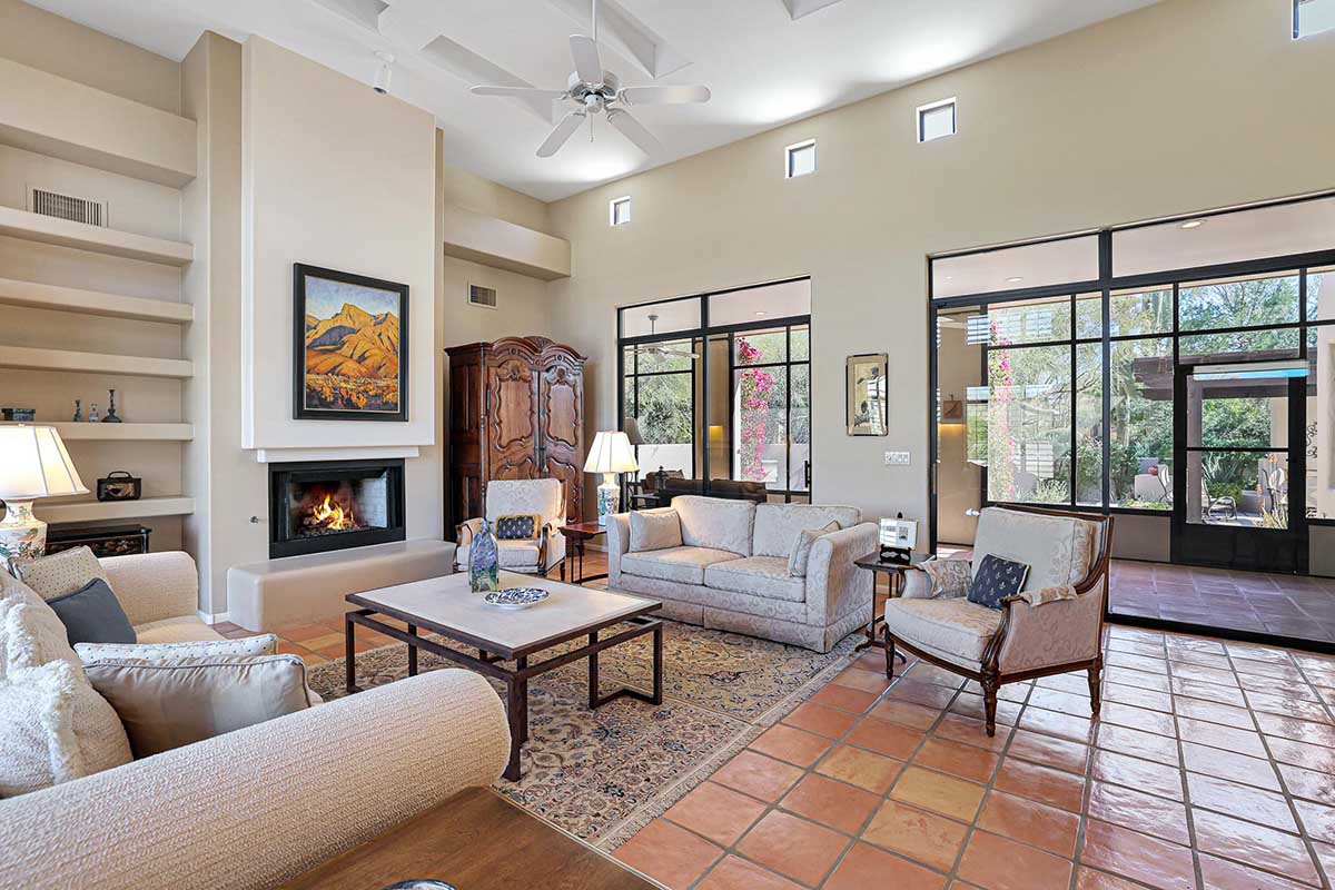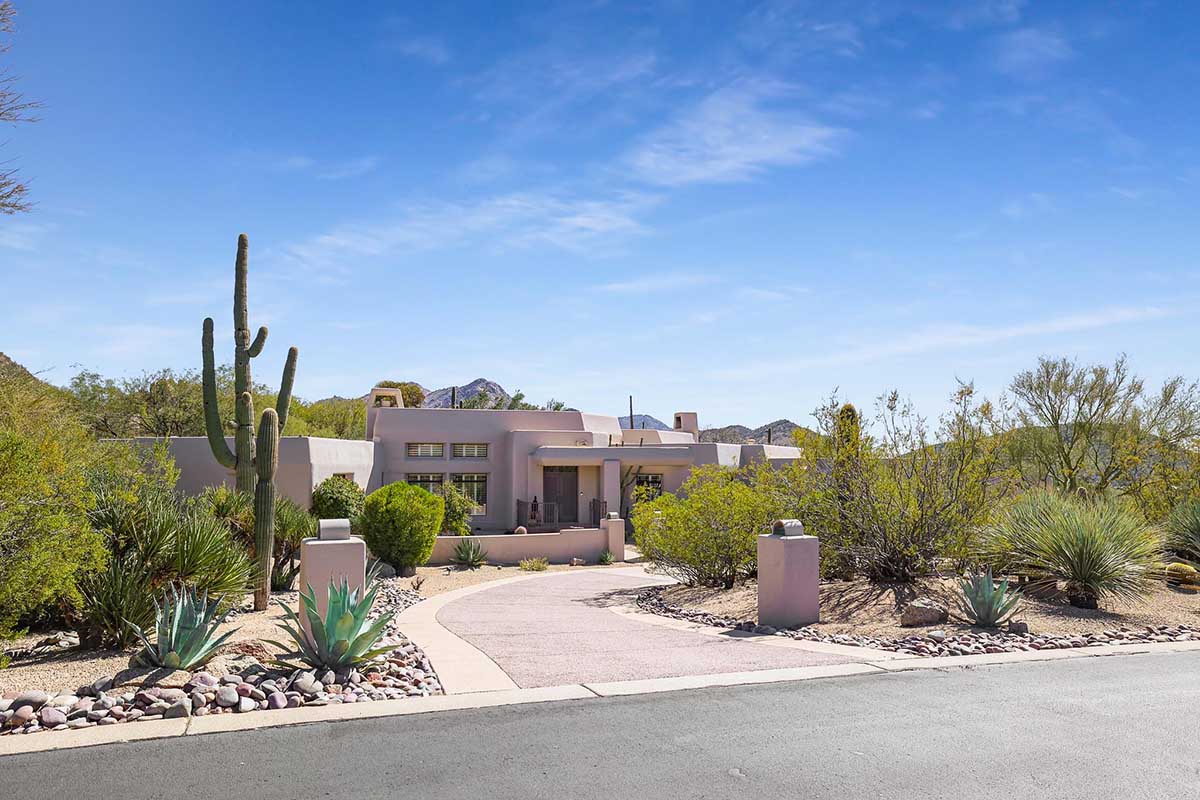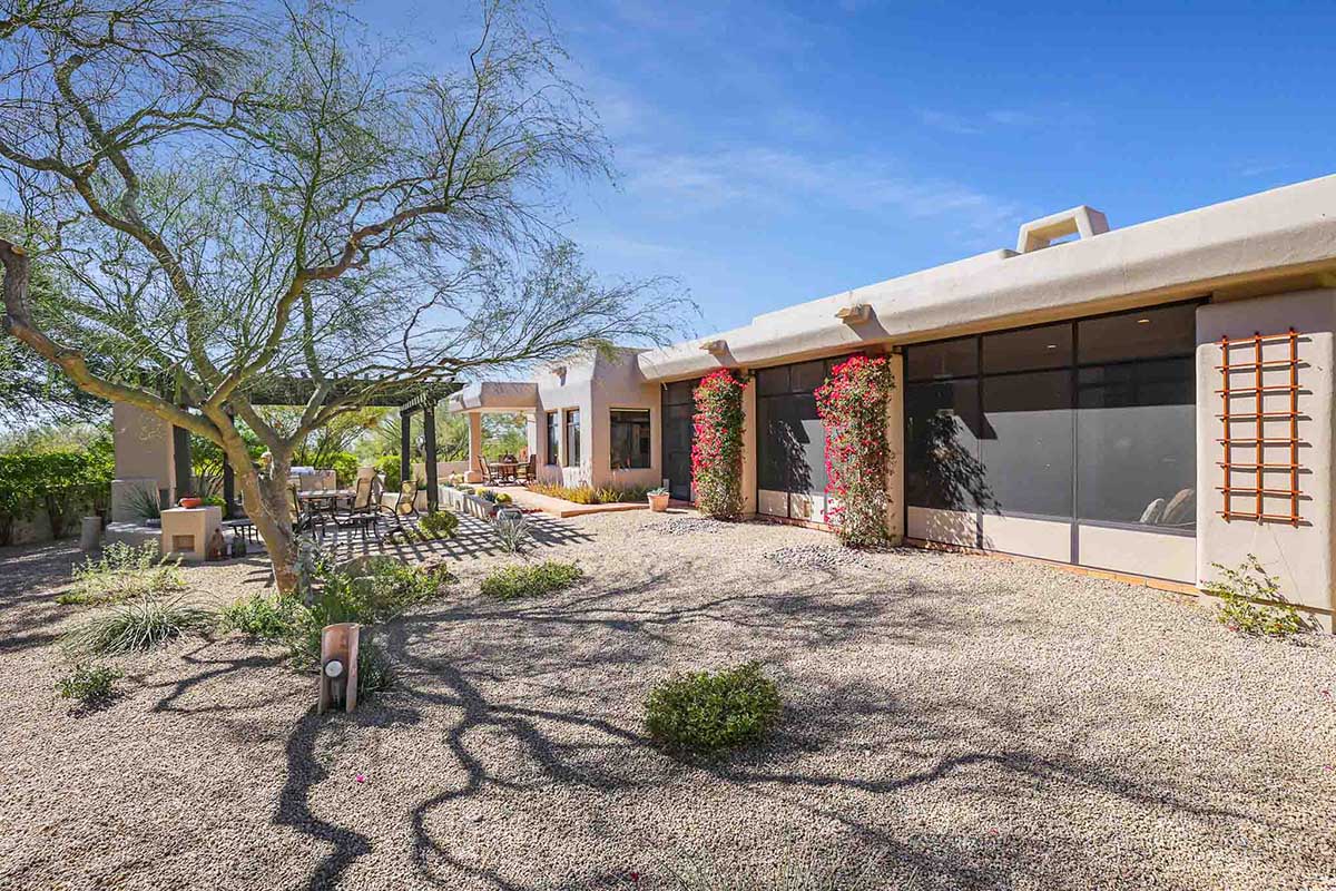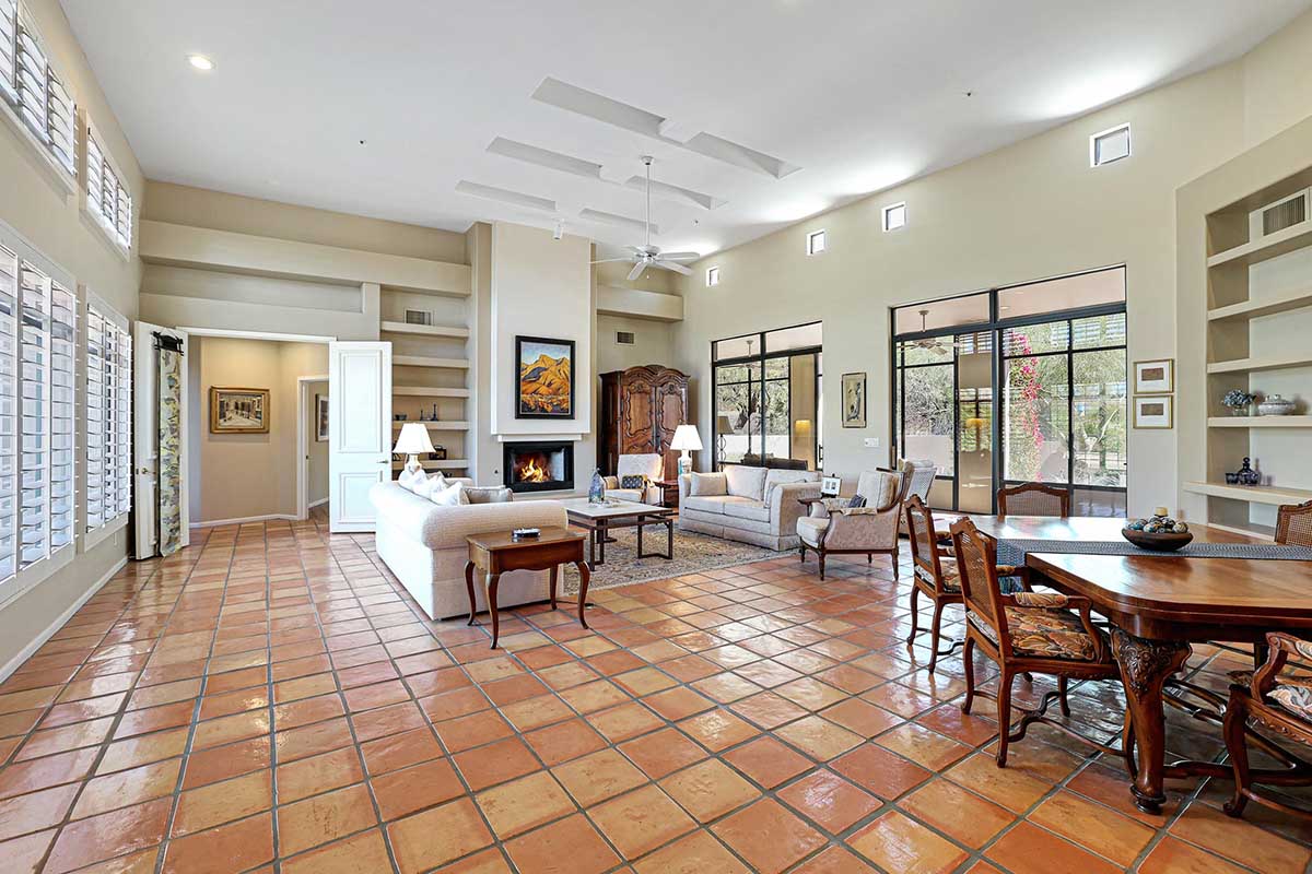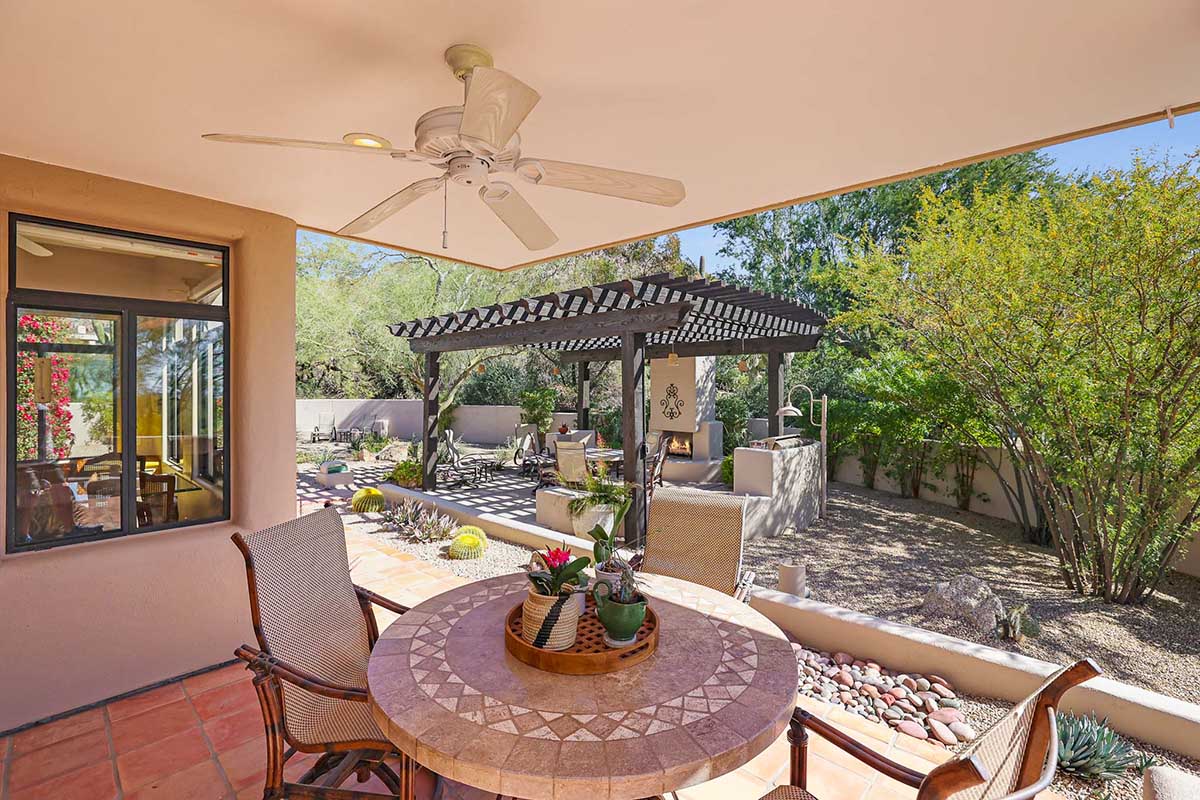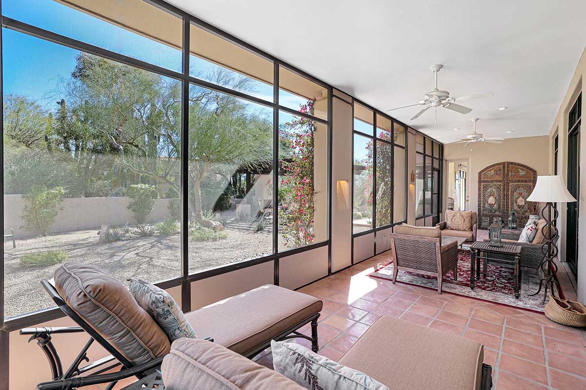 This custom built, well maintained home located in guard-gated Windy Walk Estates at Troon Village features a spacious layout and a flowing floor plan. Upon entry, take note of the soaring ceilings and numerous windows allowing for plenty of natural light and direct views to Pinnacle Peak. The 3,773 square feet of living space highlights the formal living and dining rooms as the heart of the home with built-in shelving, Saltillo tile floors, centerpiece fireplace and overlooking the large screened-in Arizona room, perfect for enjoying the famous high Sonoran desert weather from the cozy, private space.