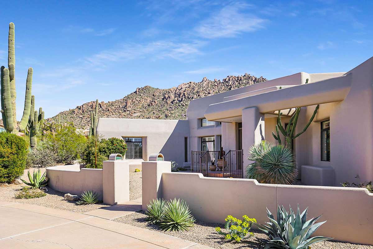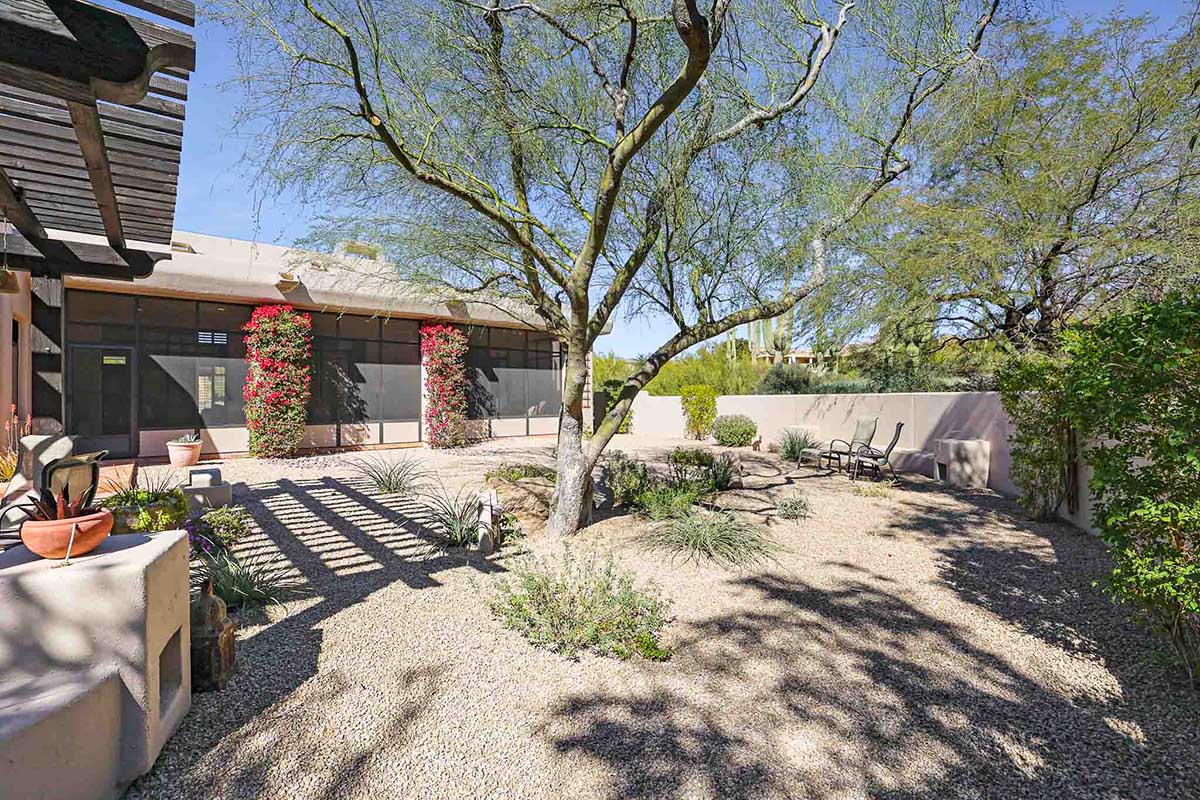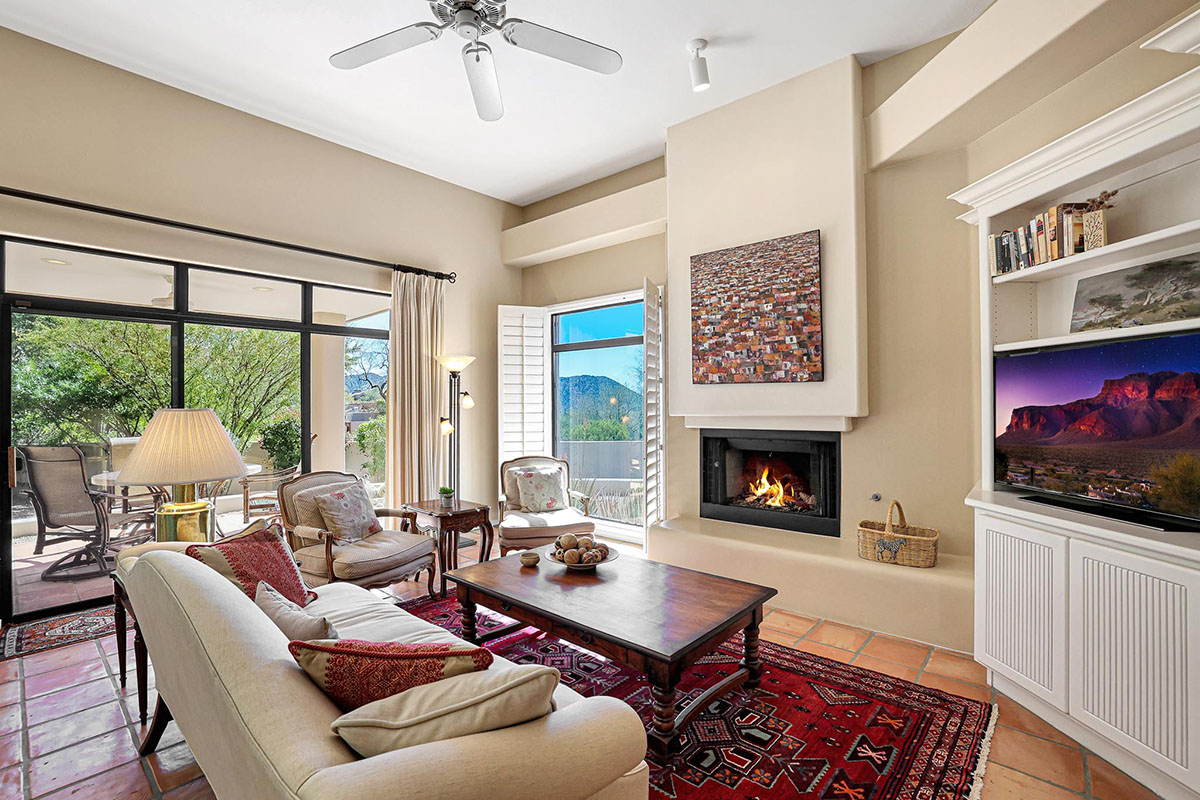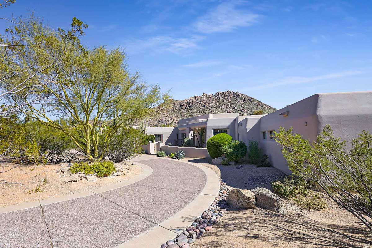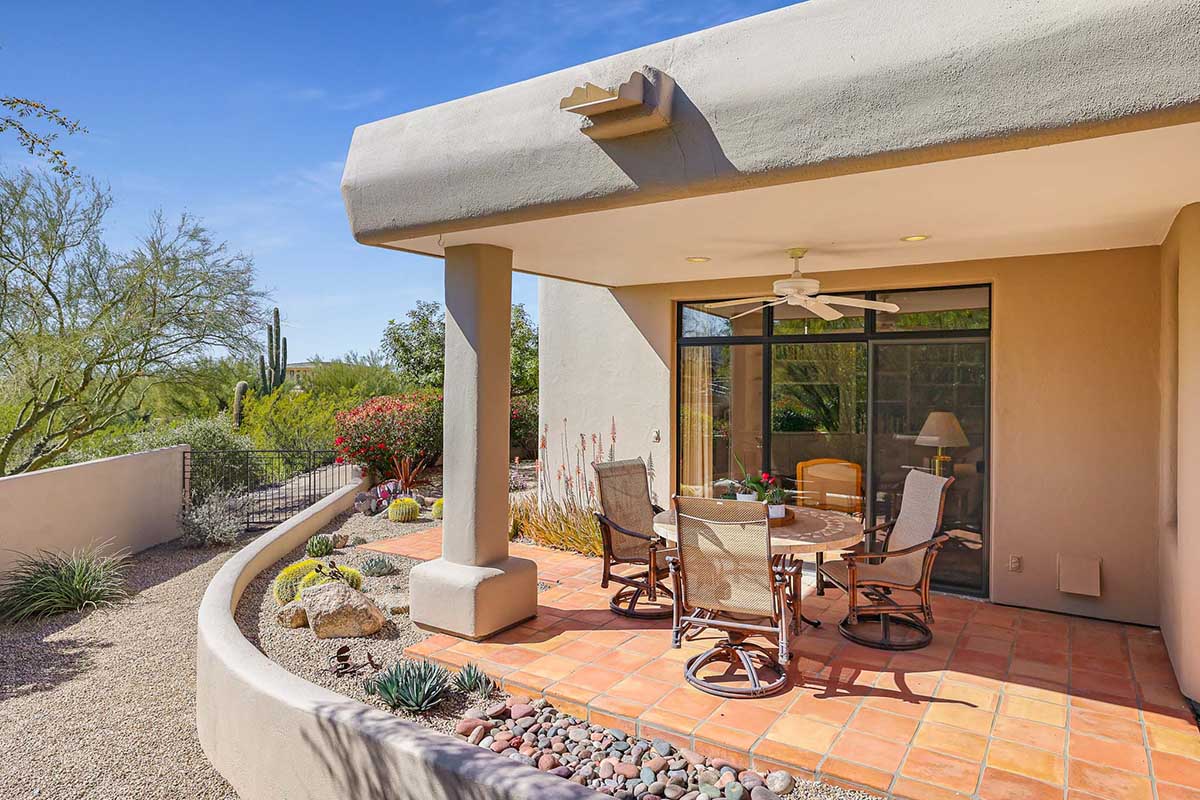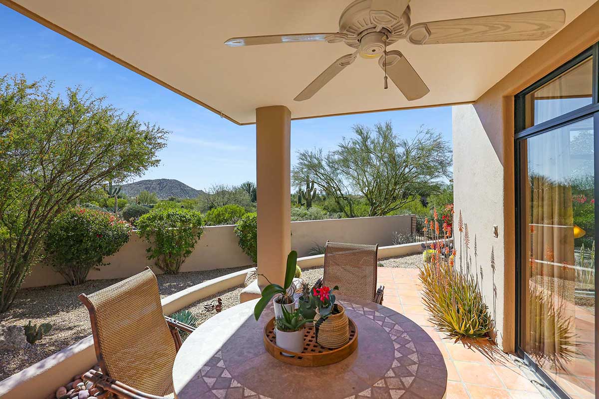 This custom built, well maintained home located in guard-gated Windy Walk Estates at Troon Village features a spacious layout and a flowing floor plan. Upon entry, take note of the soaring ceilings and numerous windows allowing for plenty of natural light and direct views to Pinnacle Peak. The 3,773 square feet of living space highlights the formal living and dining rooms as the heart of the home with built-in shelving, Saltillo tile floors, centerpiece fireplace and overlooking the large screened-in Arizona room, perfect for enjoying the famous high Sonoran desert weather from the cozy, private space.