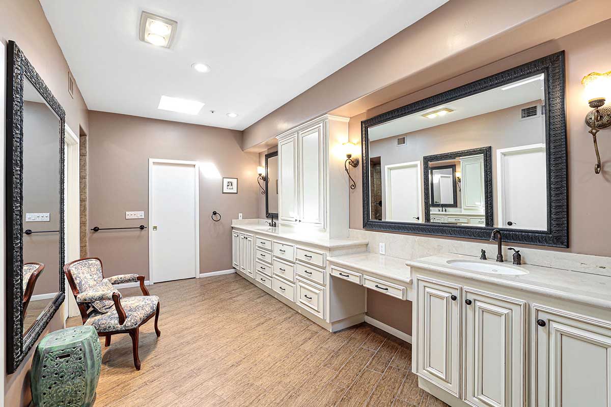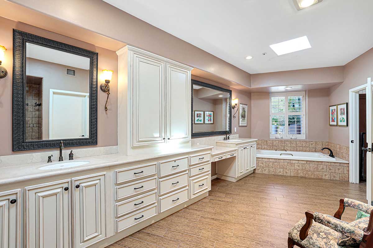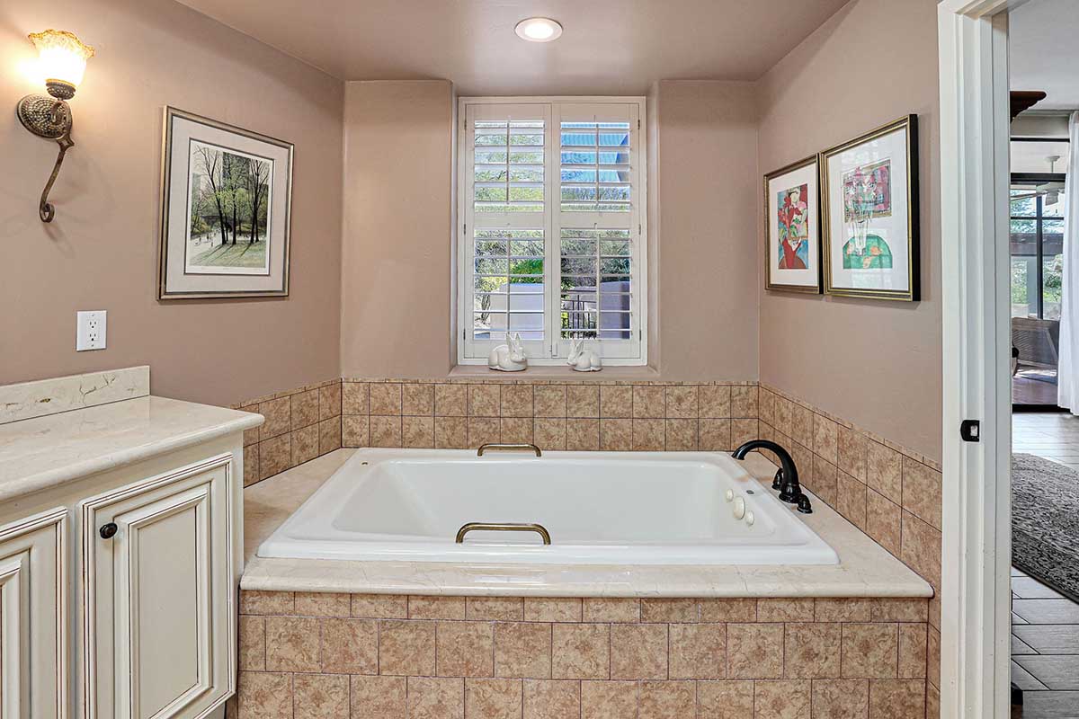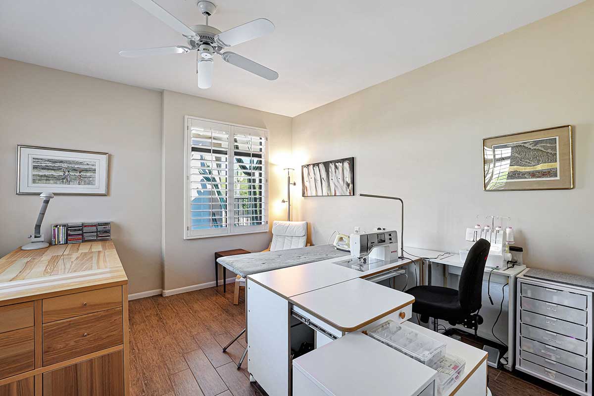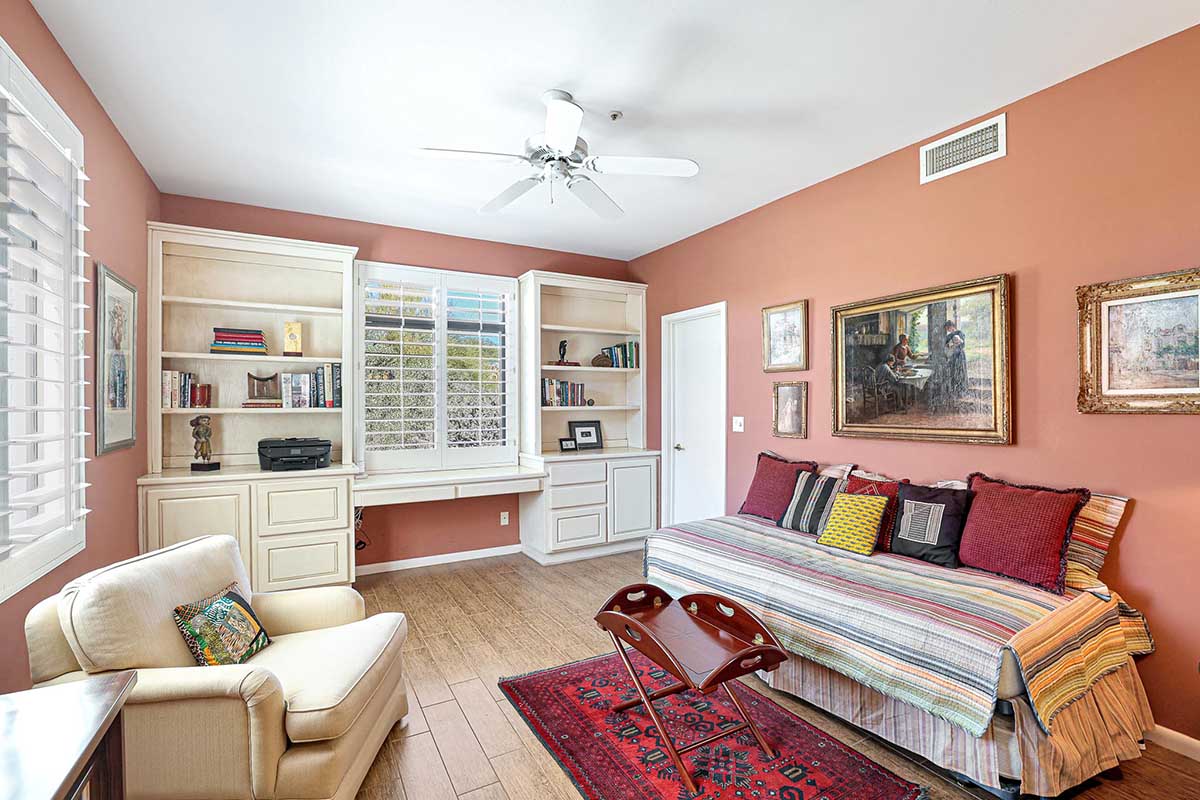 The North end of the home is home to the master suite and an ensuite guest room, currently used as an office with a built-in desk and bookshelves. The master bedroom is large with a spa-like bath featuring two walk-in closets, private water closet, soaking tub, separate shower, and dual sinks with a built-in vanity desk.