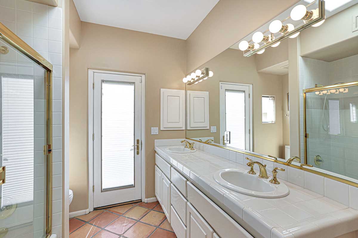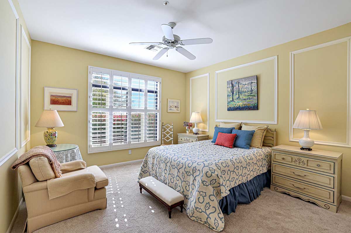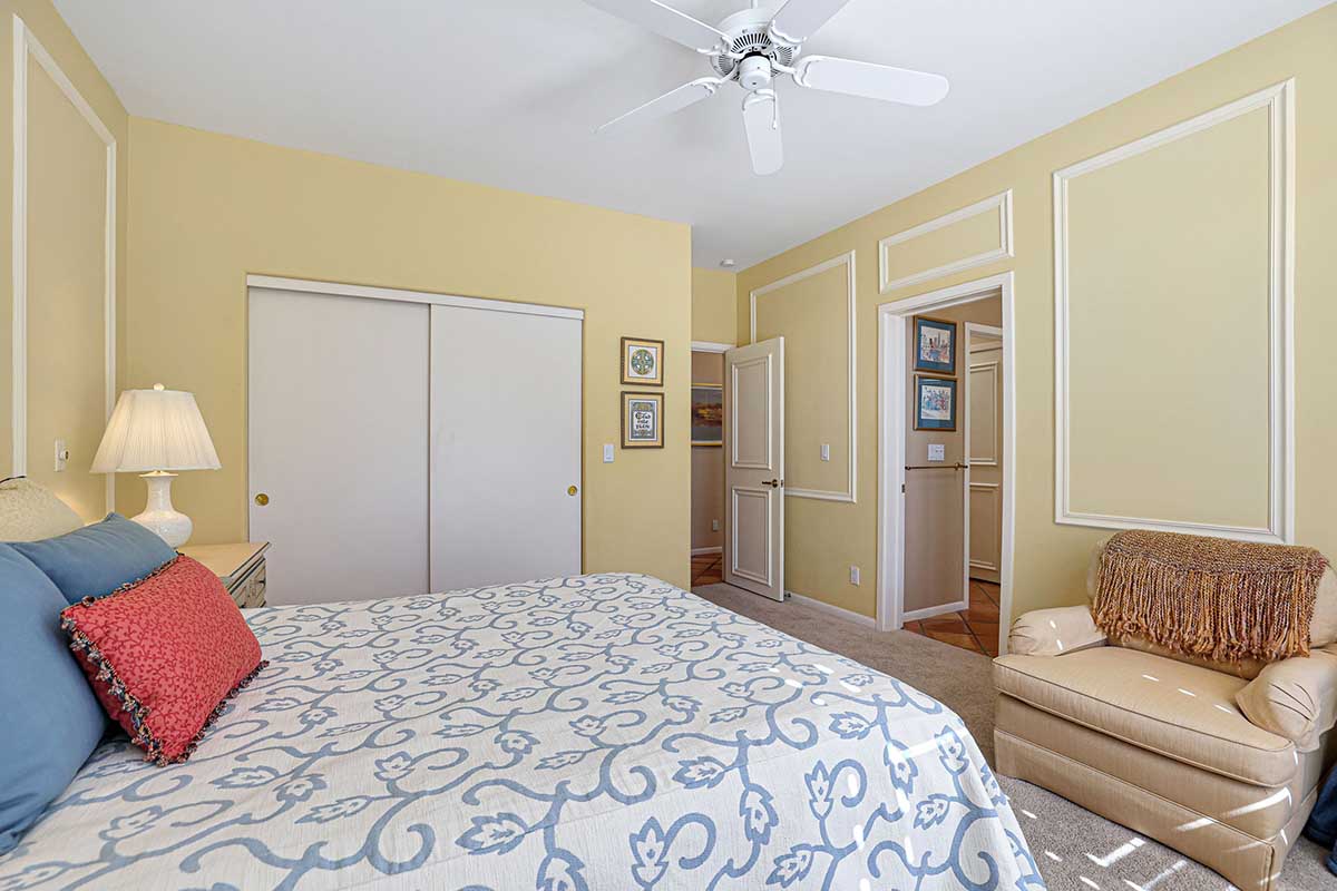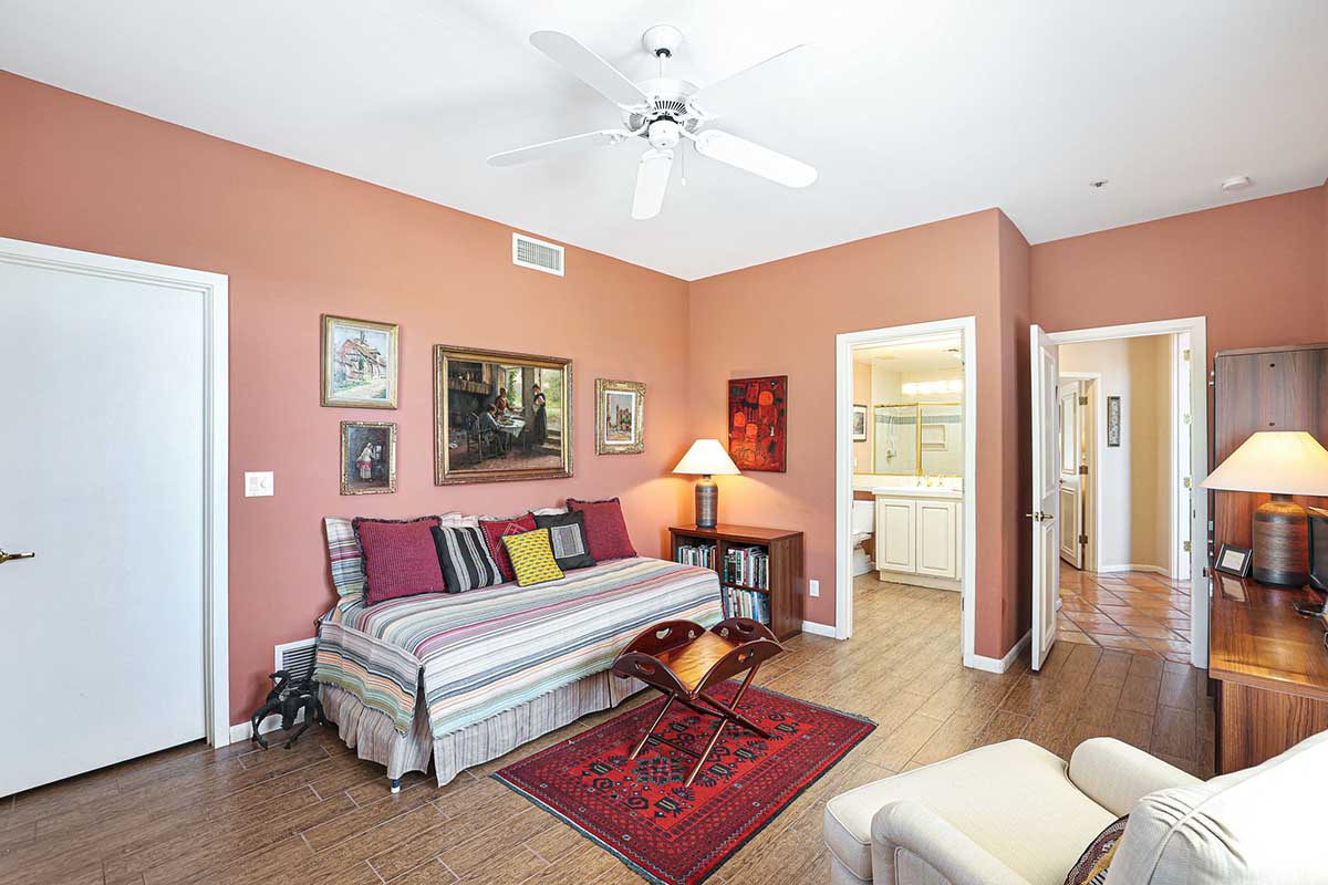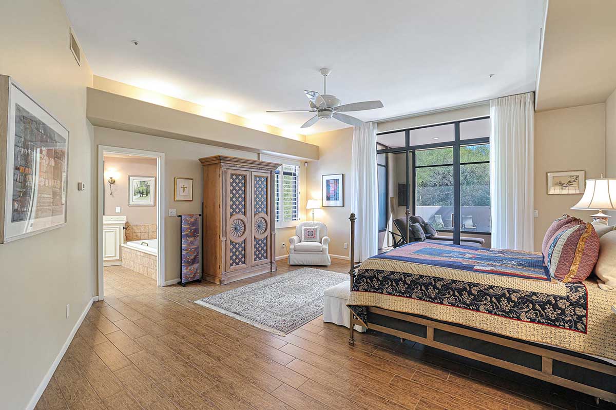 The North end of the home is home to the master suite and an ensuite guest room, currently used as an office with a built-in desk and bookshelves. The master bedroom is large with a spa-like bath featuring two walk-in closets, private water closet, soaking tub, separate shower, and dual sinks with a built-in vanity desk.