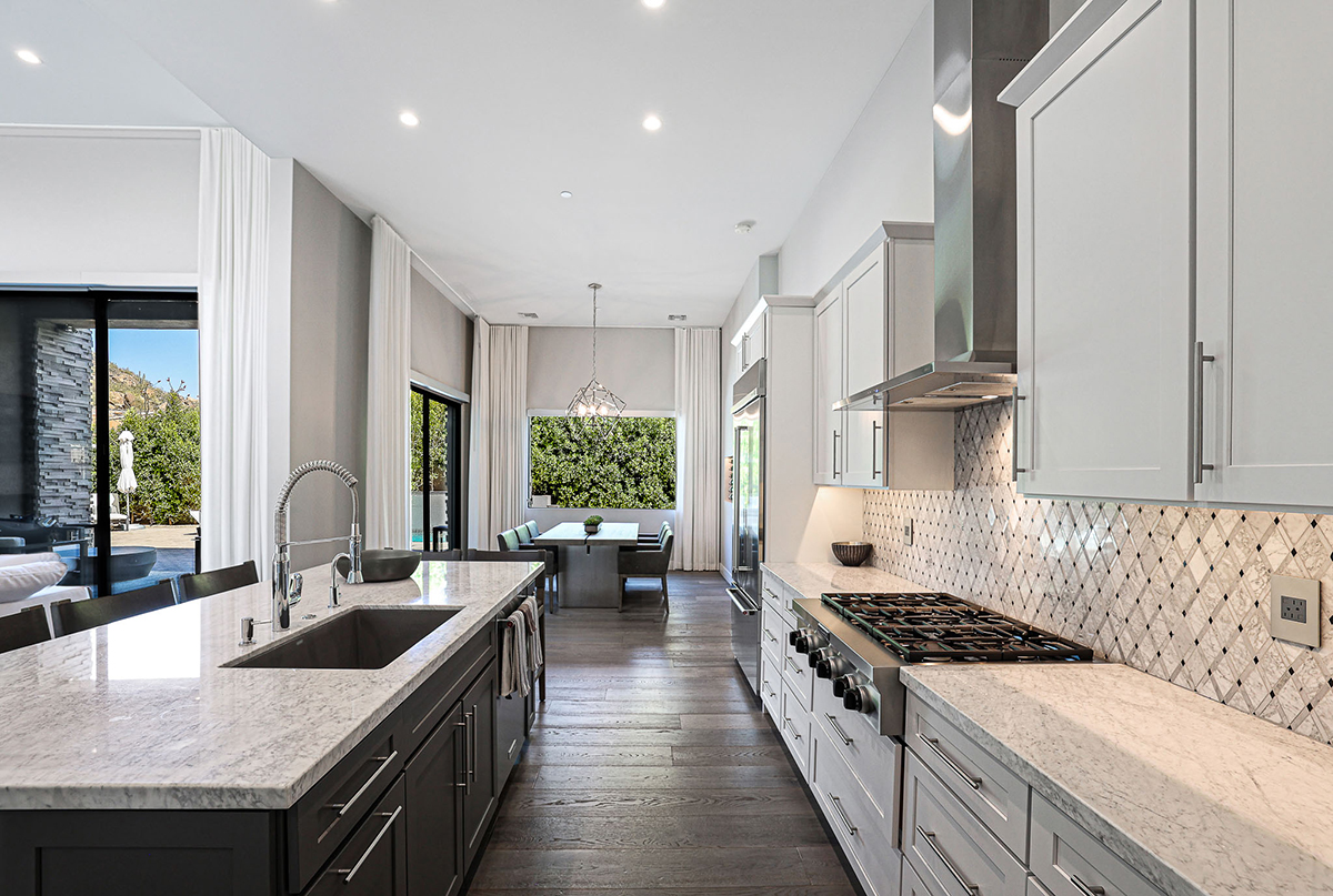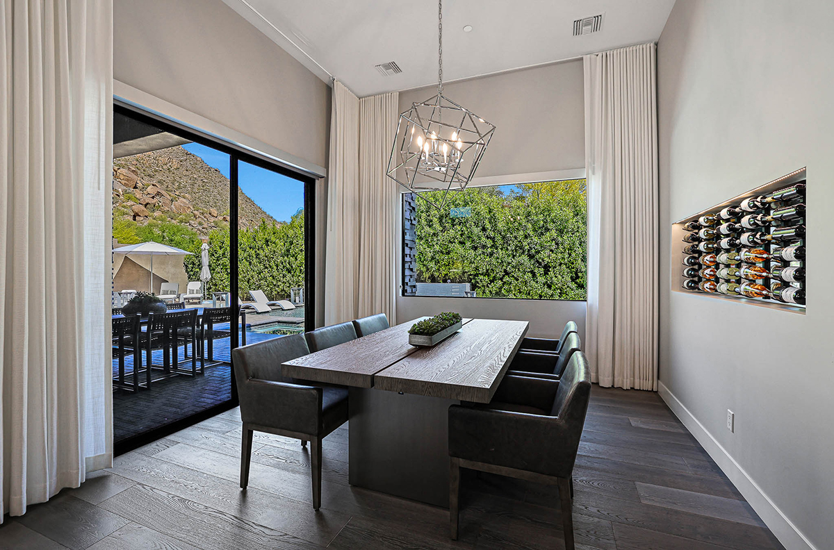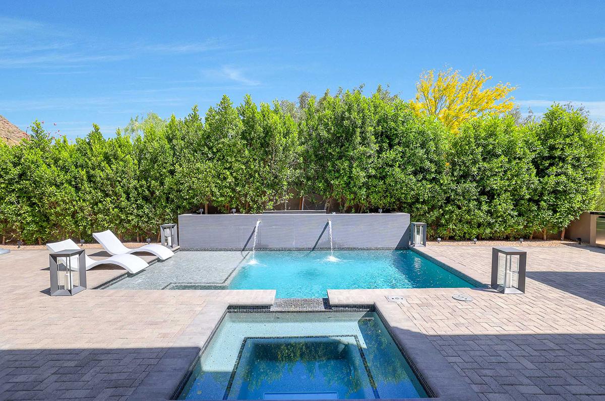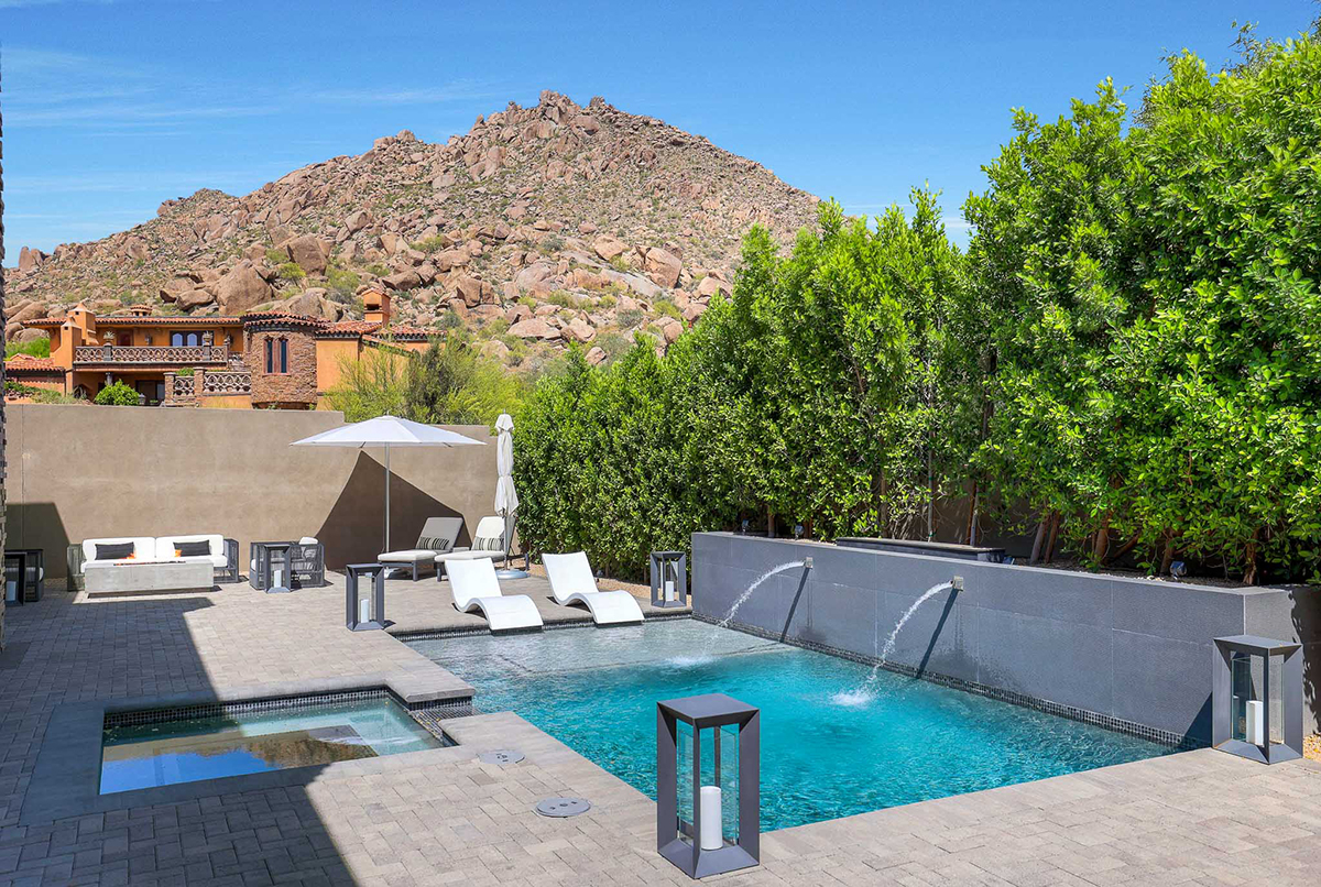 The kitchen is an entertainer’s dream with easy access to the interior and exterior dining spaces, stainless steel appliances including a fridge, gas cooktop, double wall ovens, built-in drawer microwave, dishwasher, and beverage fridge. The large center island has ample seating and the countertops are marble slab with marble accent tile surround. The backyard features a sparkling pool with Baja shelf, recently added spa, built-in barbecue, paver hardscape surround, mature hedges for added privacy, large covered patio, and Troon Mountain views.