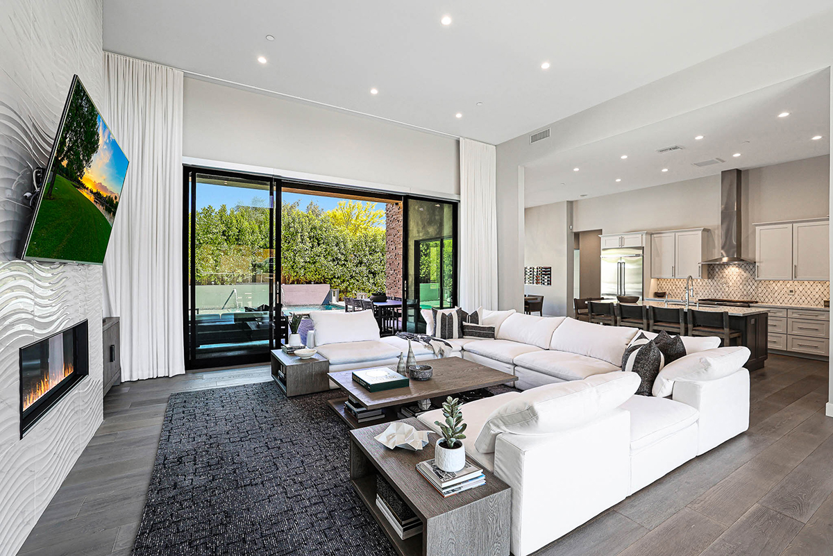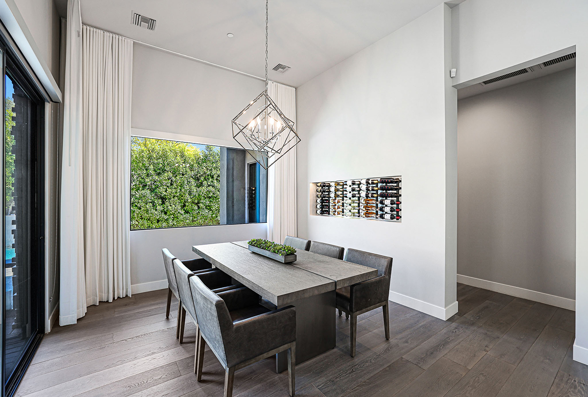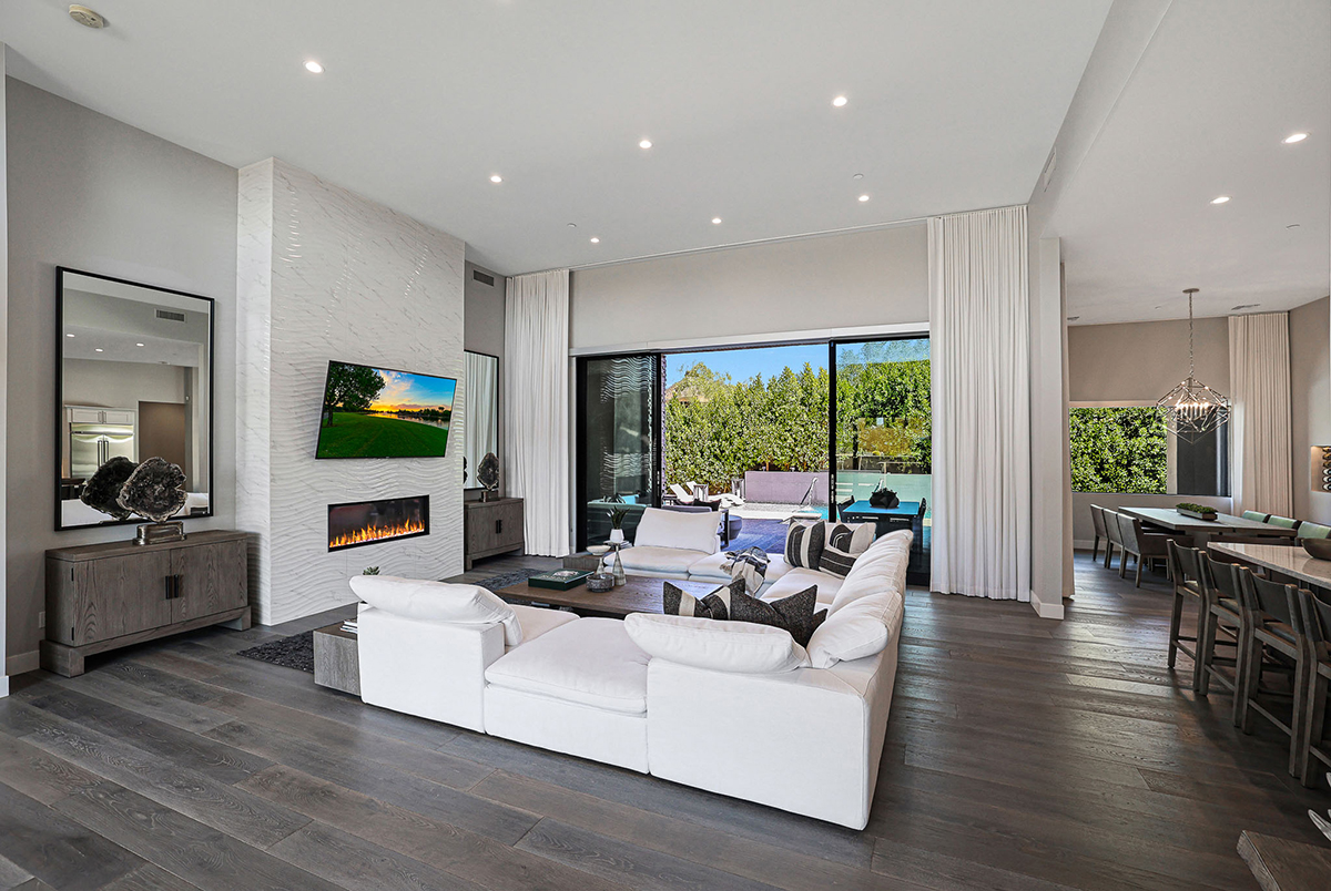 The steel framed front entry glass doors and clerestory windows allow for superior natural light in the great room which is the heart of the home and features a gas fireplace with floor to ceiling contemporary tile surround. The entry glass doors are mimicked on the back wall and open up the space to the resort style backyard. Dramatic floor to ceiling window treatments grace both sets of doors for privacy. The wide plank wood floors and neutral two tone paint can be found throughout the main living spaces for that consistent feel.