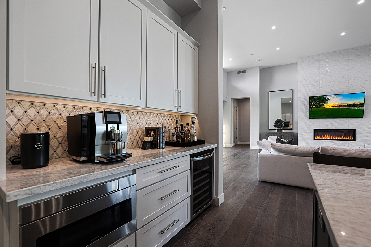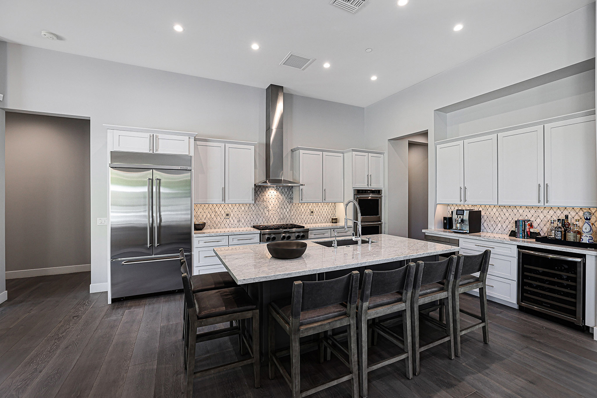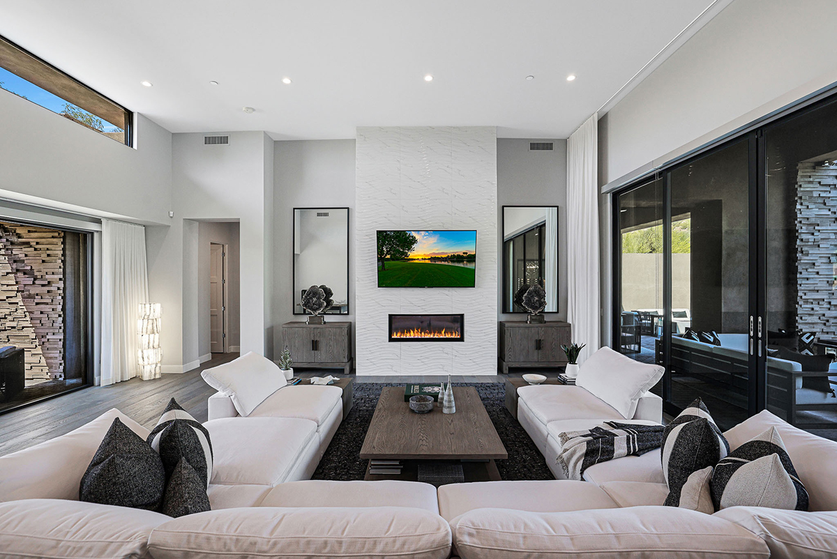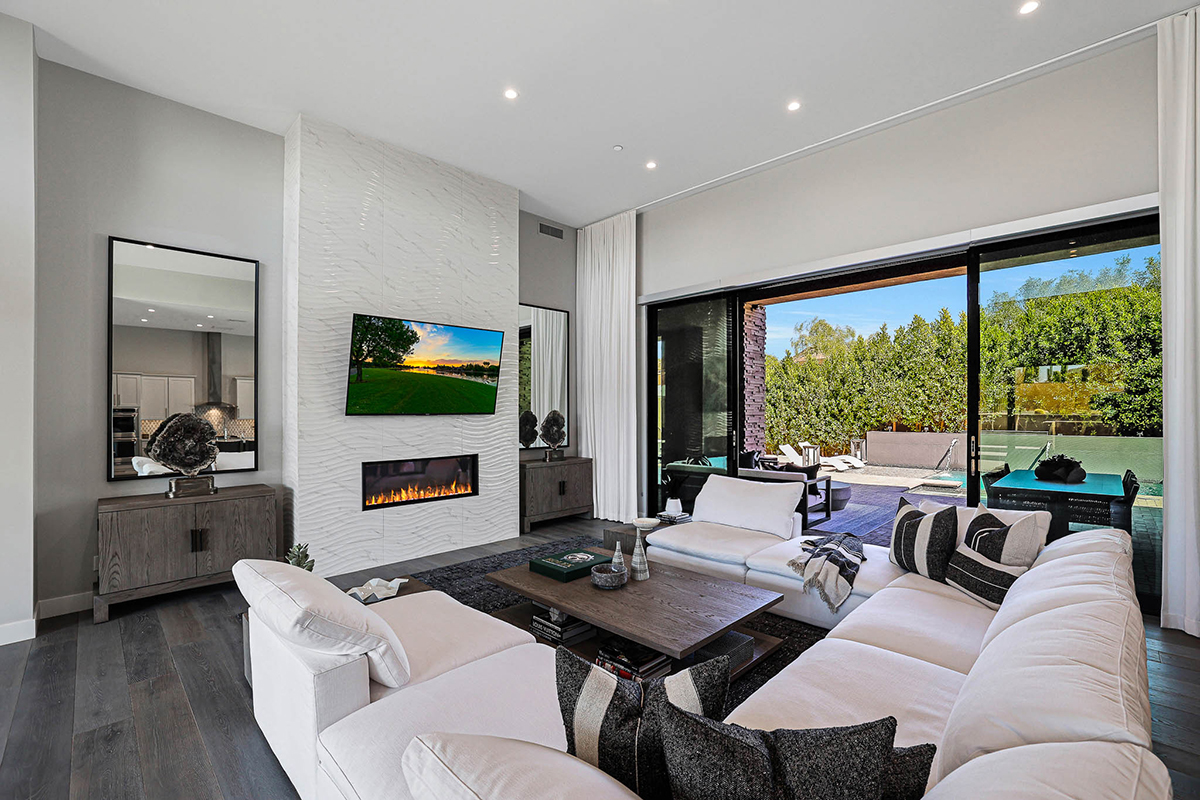 The steel framed front entry glass doors and clerestory windows allow for superior natural light in the great room which is the heart of the home and features a gas fireplace with floor to ceiling contemporary tile surround. The entry glass doors are mimicked on the back wall and open up the space to the resort style backyard. Dramatic floor to ceiling window treatments grace both sets of doors for privacy. The wide plank wood floors and neutral two tone paint can be found throughout the main living spaces for that consistent feel.