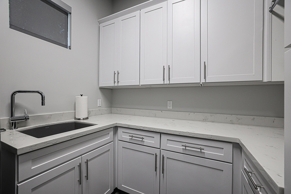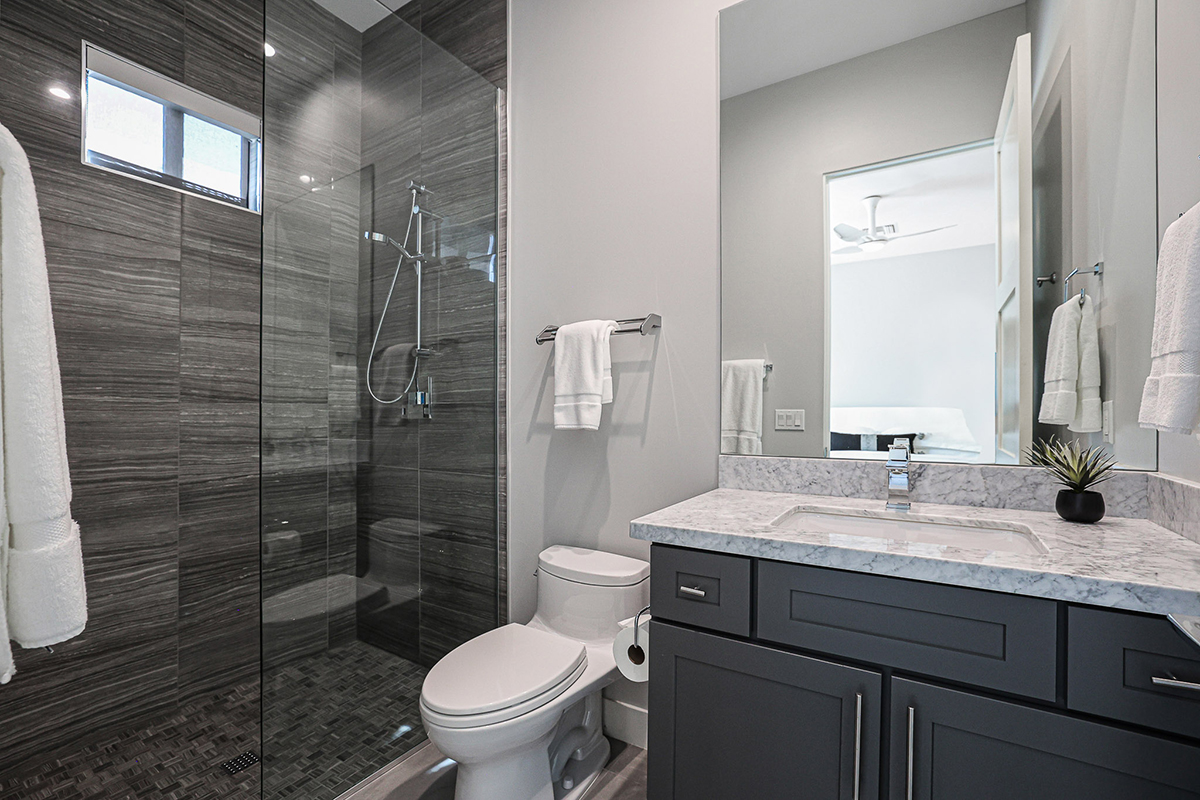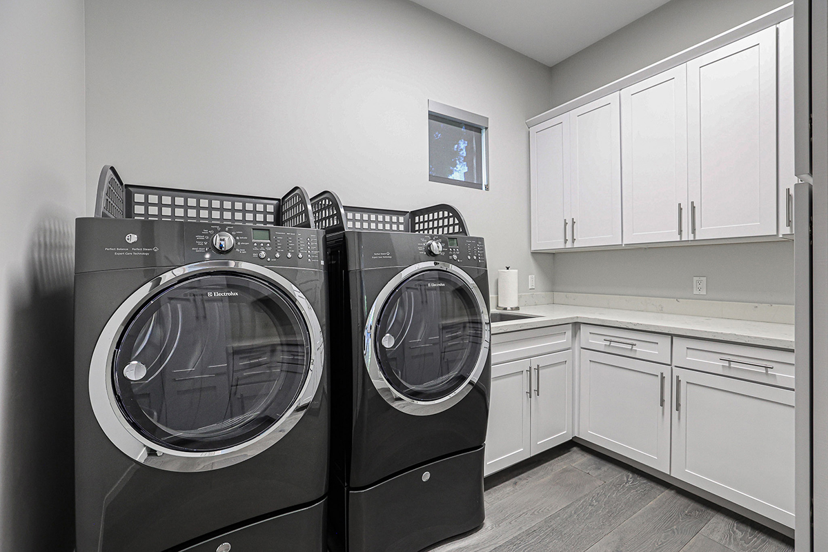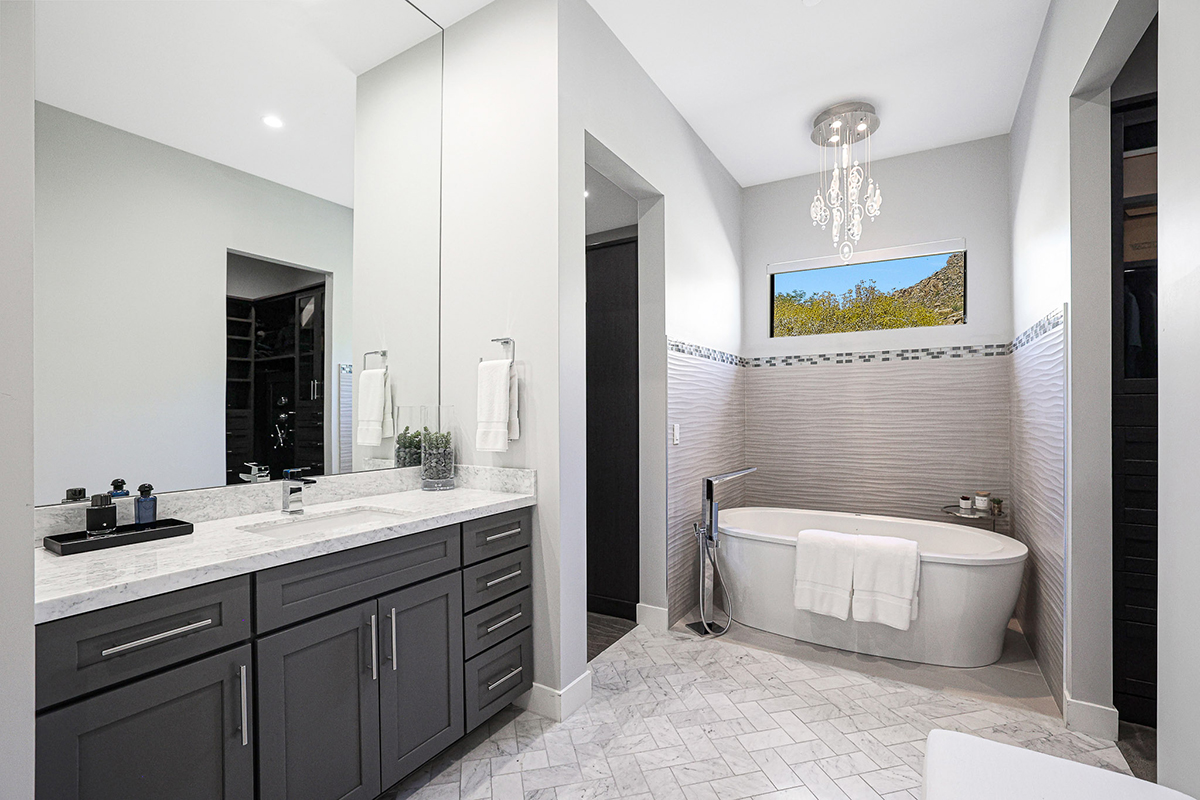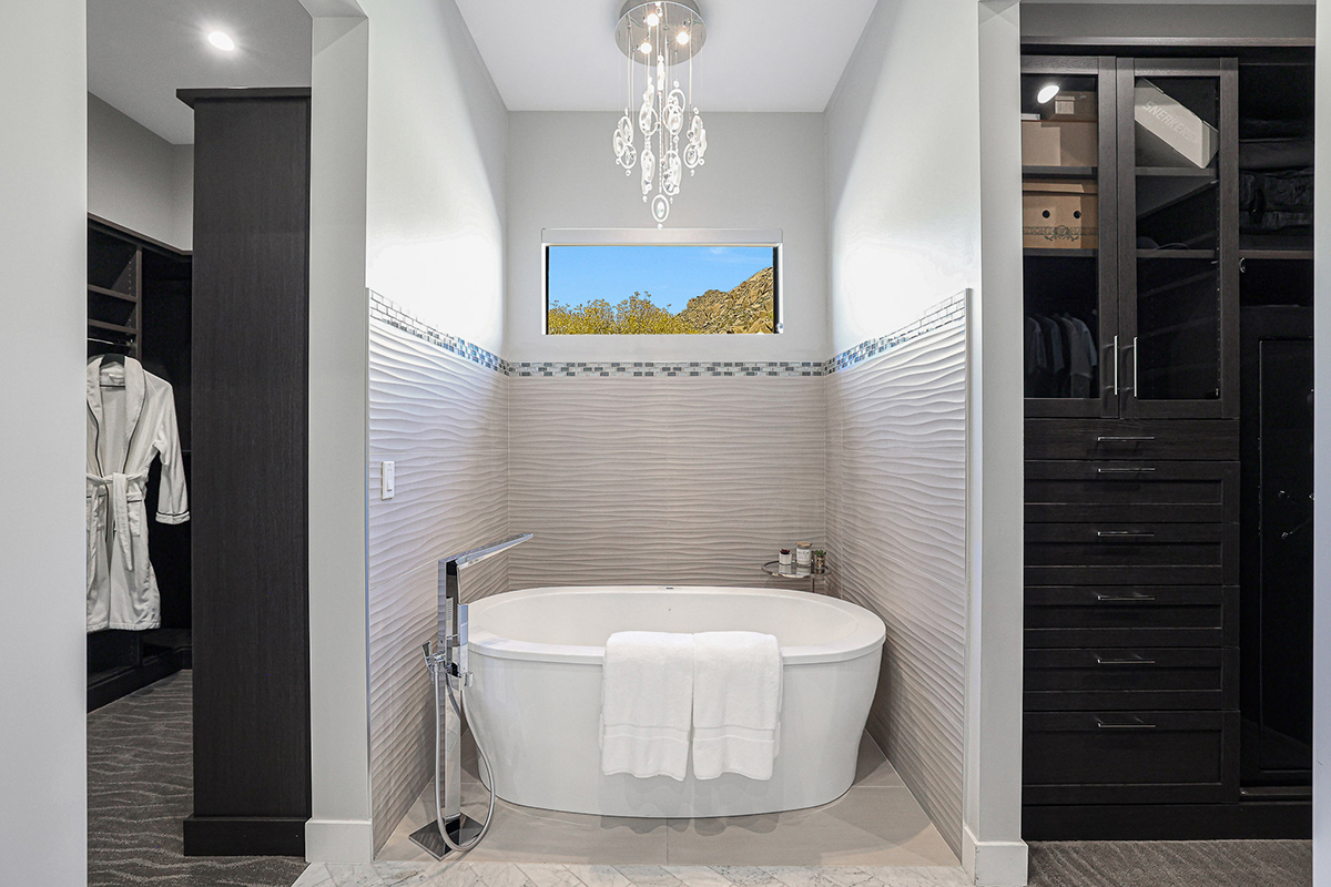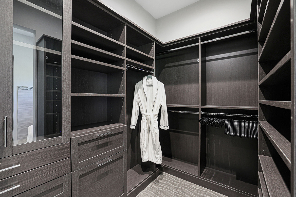 The master suite and the master bath are luxury personified. The master bath is oversized with a free standing soaking tub, marble floors and marble shower surround, dual sinks, large walk-in shower, and his and hers walk-in closets with custom organization systems. Two additional guest rooms, both ensuite, allow for additional sleeping spaces and modern bathroom amenities for guests. The private office also has a walk-in closet and exterior access for great flex space options. The three car, side entry garage with epoxy flooring and built-in cabinets has a storage room with wash sink, and electric car charger.