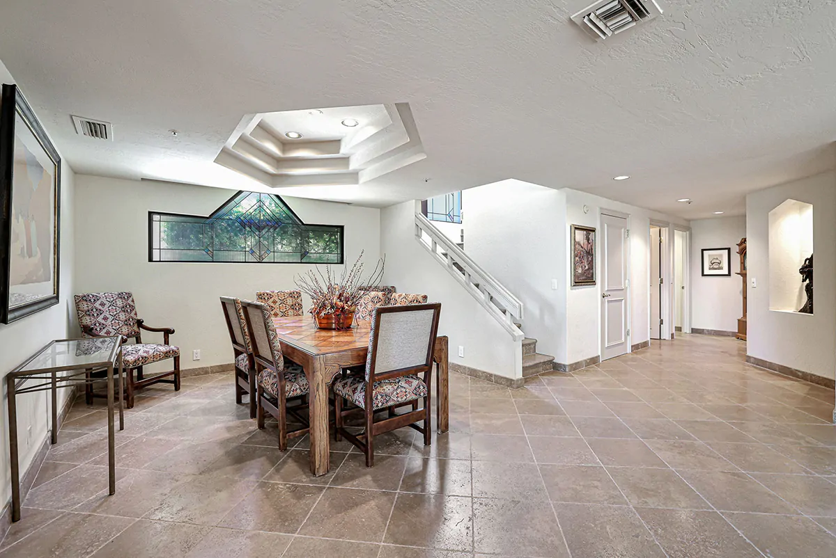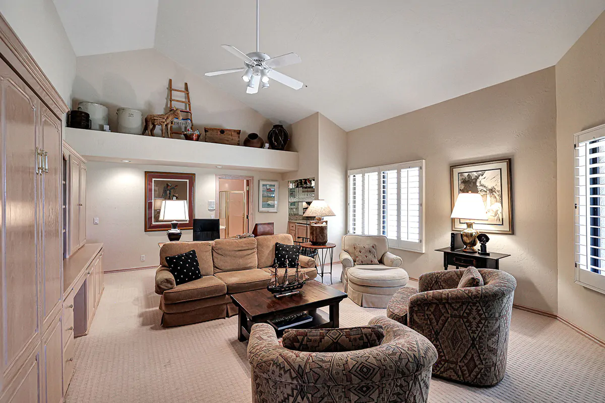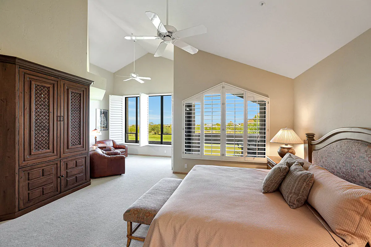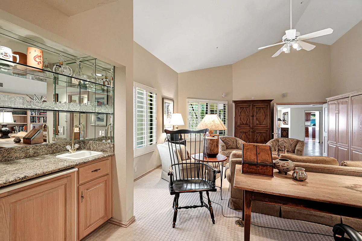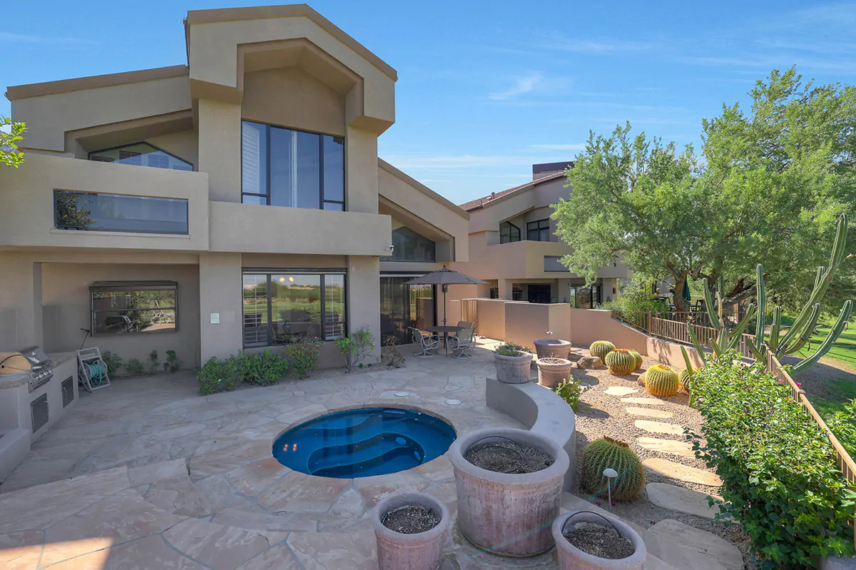 This property boasts a well-appointed outdoor oasis, complete with a spa and a built-in barbecue, all set within a low-maintenance landscape – an ideal setup for those seeking a lock-and-leave lifestyle. Inside, discover the convenience of dual primary bedrooms, one on each floor. The downstairs primary bedroom, currently utilized as a den, features a versatile Murphy bed wall unit with an attached desk, a wet bar with a sink, and a beverage fridge. Ascend to the upper level to find the second primary bedroom, which boasts a remodeled bathroom and a private balcony, offering the perfect spot to savor Arizona’s stunning sunsets. An additional guest bedroom with an ensuite bath awaits your visitors.