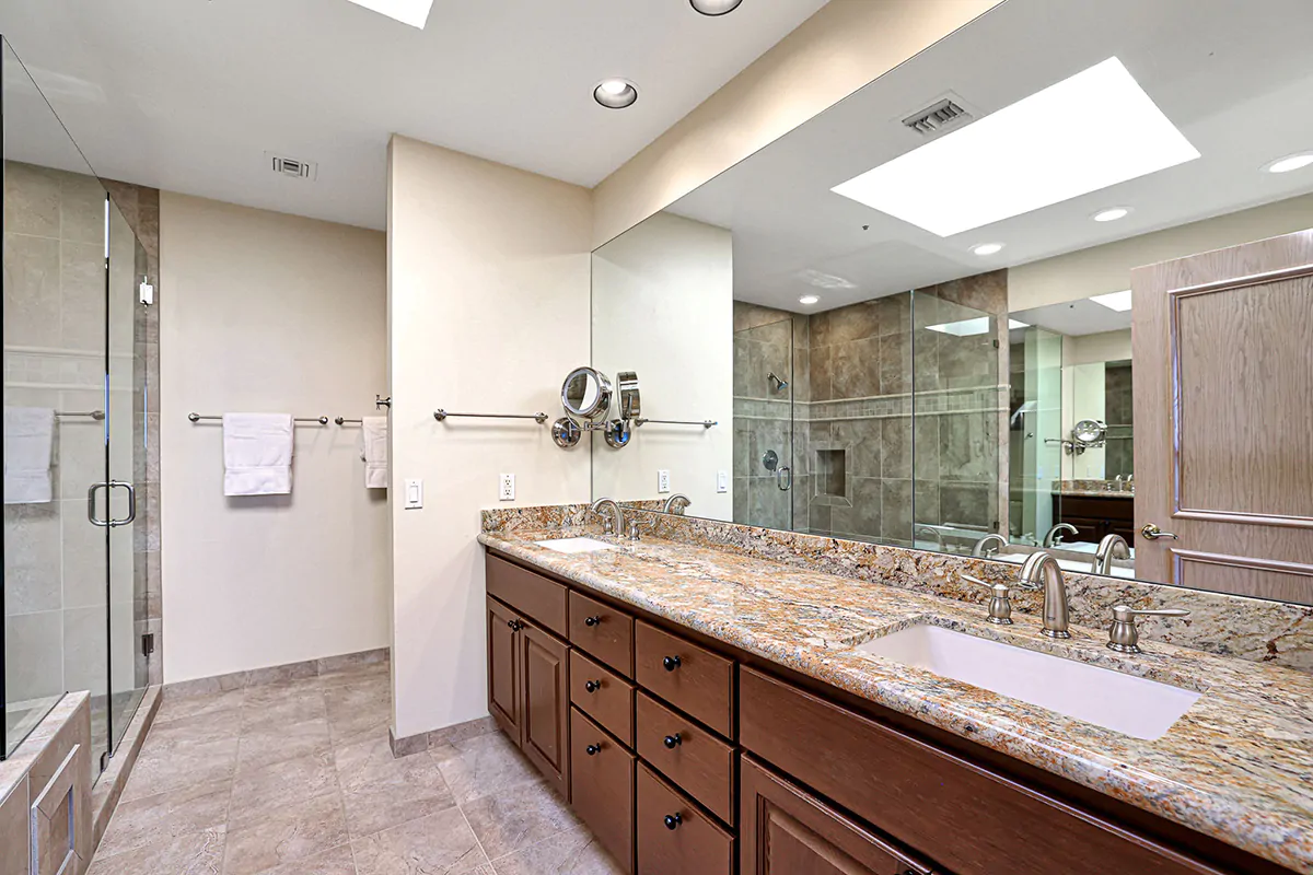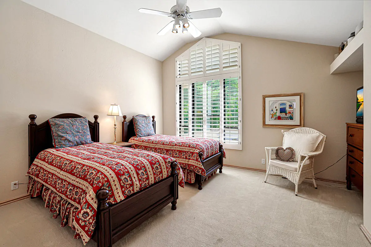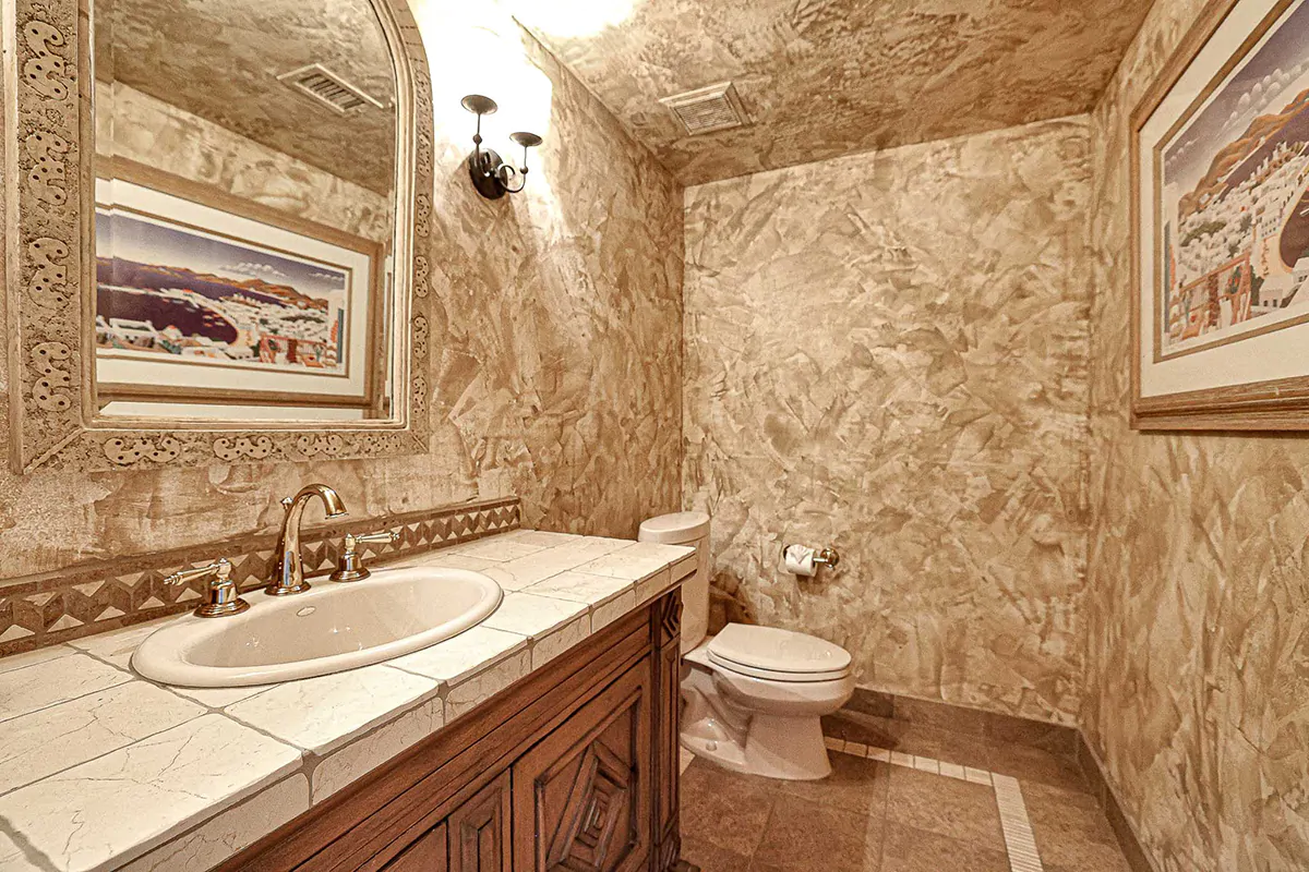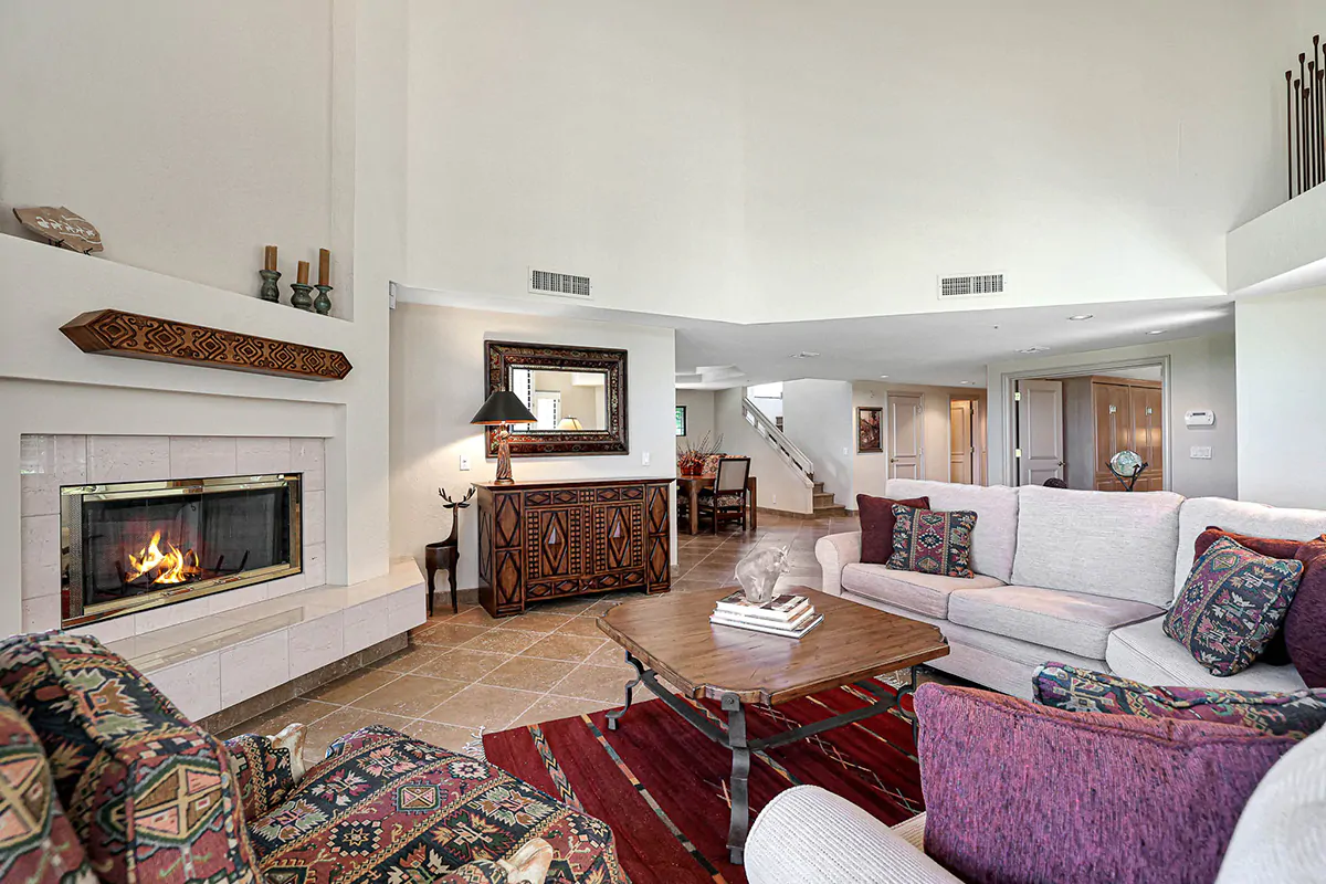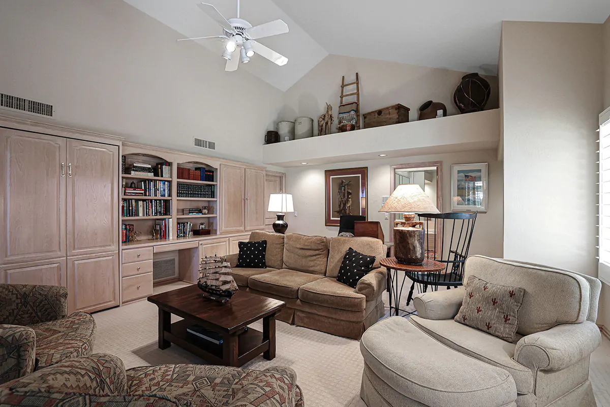 This property boasts a well-appointed outdoor oasis, complete with a spa and a built-in barbecue, all set within a low-maintenance landscape – an ideal setup for those seeking a lock-and-leave lifestyle. Inside, discover the convenience of dual primary bedrooms, one on each floor. The downstairs primary bedroom, currently utilized as a den, features a versatile Murphy bed wall unit with an attached desk, a wet bar with a sink, and a beverage fridge. Ascend to the upper level to find the second primary bedroom, which boasts a remodeled bathroom and a private balcony, offering the perfect spot to savor Arizona’s stunning sunsets. An additional guest bedroom with an ensuite bath awaits your visitors.