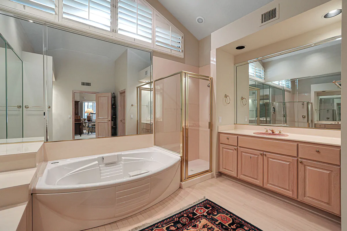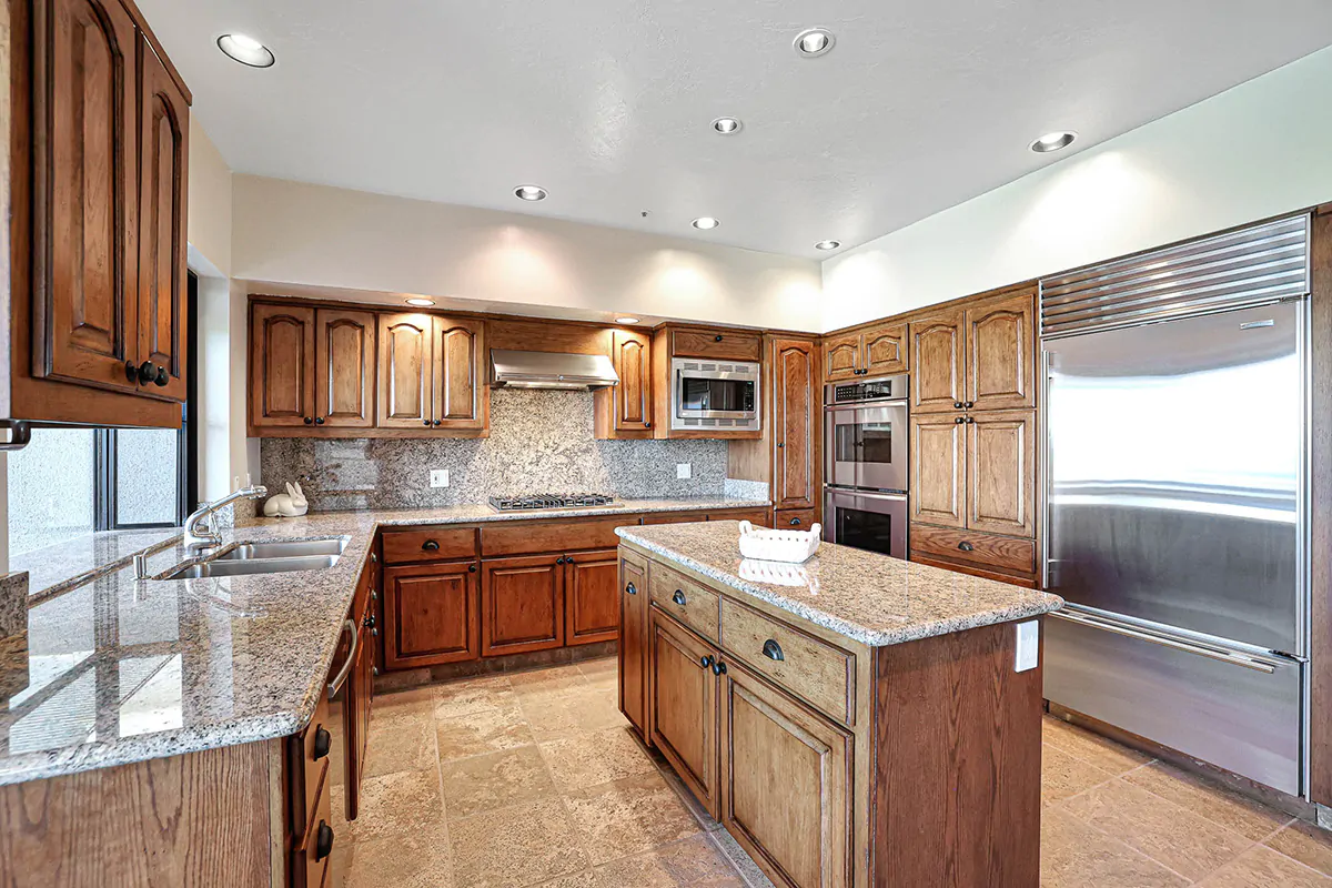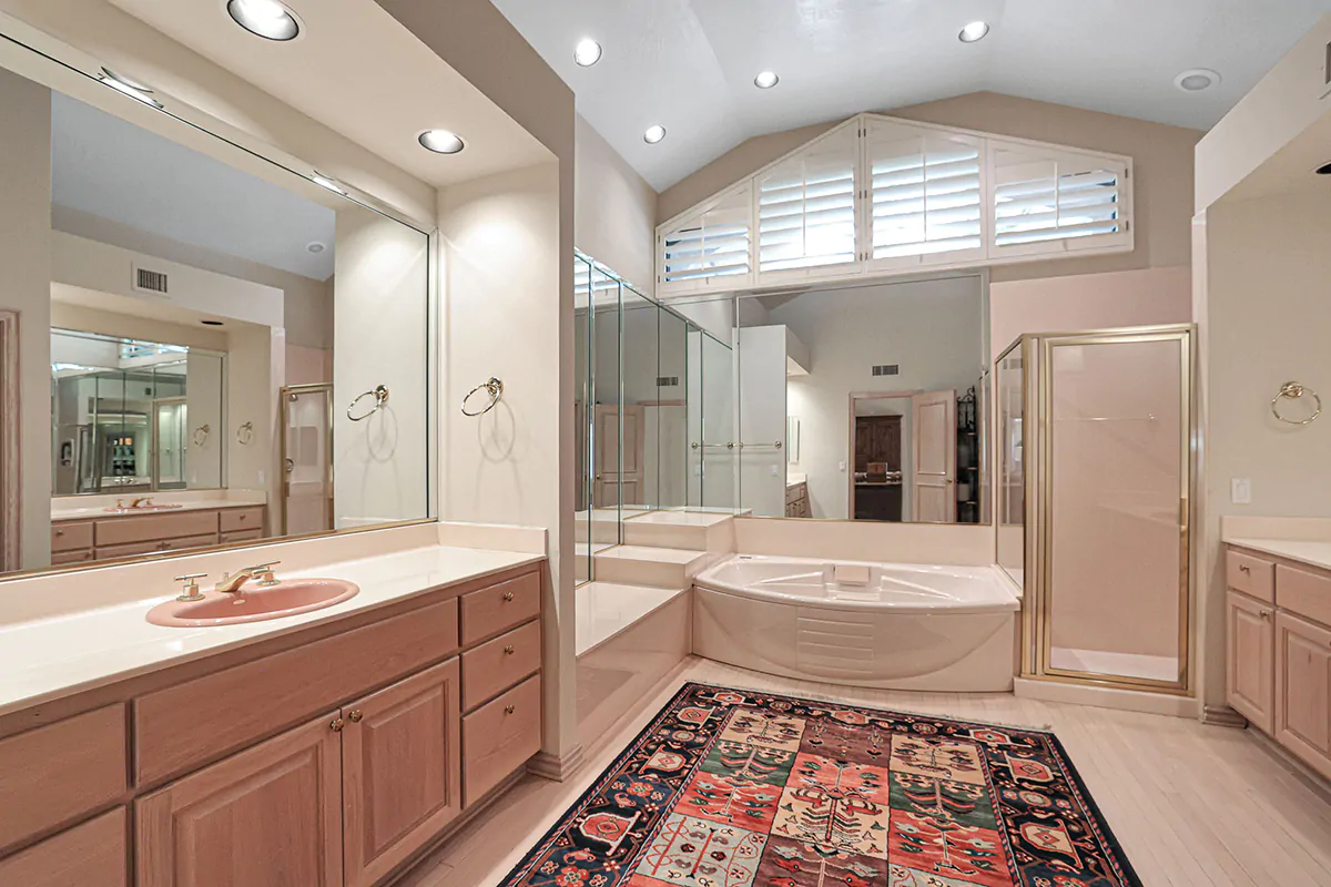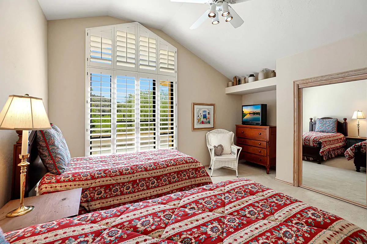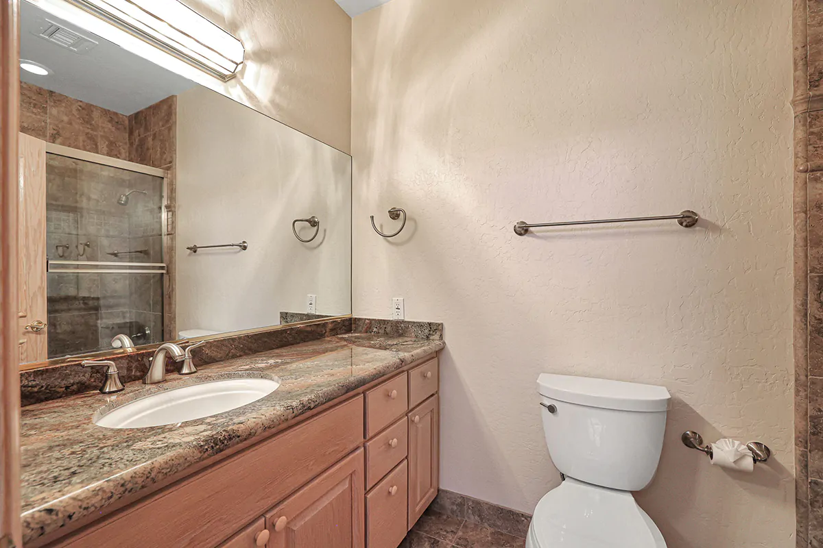 This property boasts a well-appointed outdoor oasis, complete with a spa and a built-in barbecue, all set within a low-maintenance landscape – an ideal setup for those seeking a lock-and-leave lifestyle. Inside, discover the convenience of dual primary bedrooms, one on each floor. The downstairs primary bedroom, currently utilized as a den, features a versatile Murphy bed wall unit with an attached desk, a wet bar with a sink, and a beverage fridge. Ascend to the upper level to find the second primary bedroom, which boasts a remodeled bathroom and a private balcony, offering the perfect spot to savor Arizona’s stunning sunsets. An additional guest bedroom with an ensuite bath awaits your visitors.