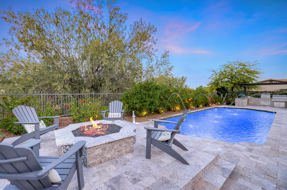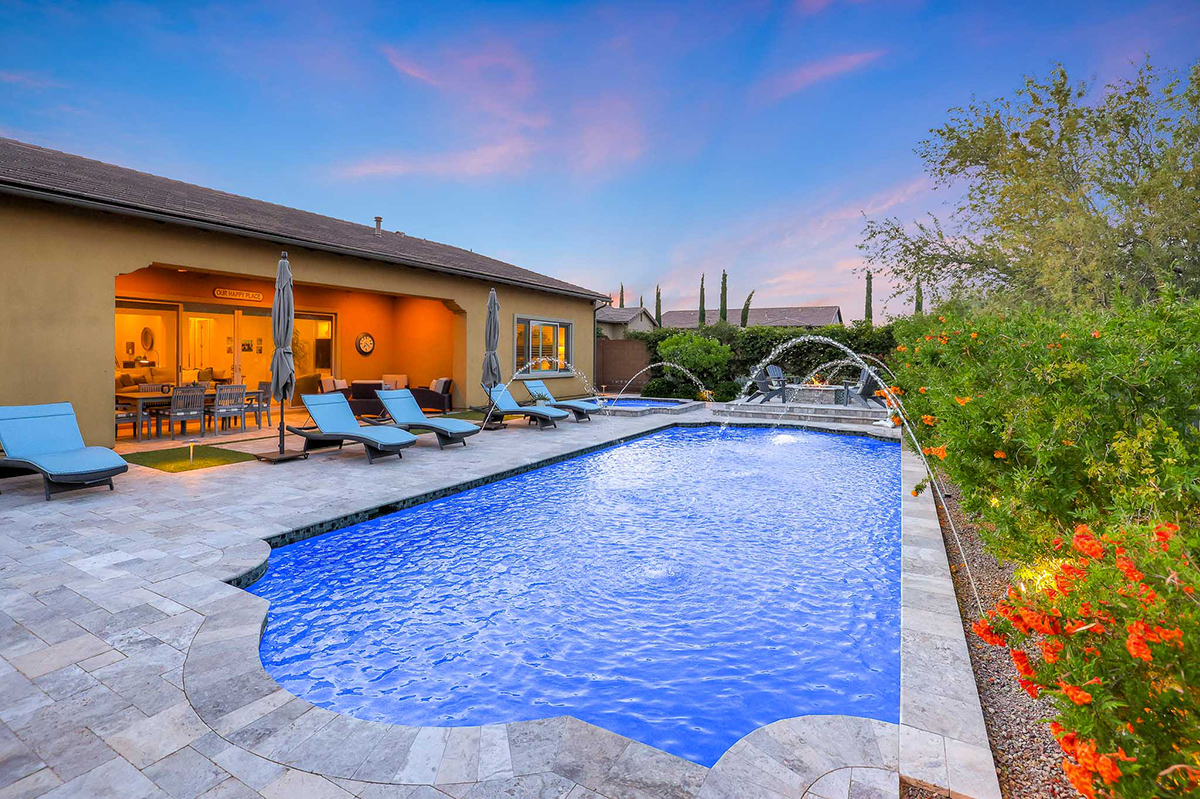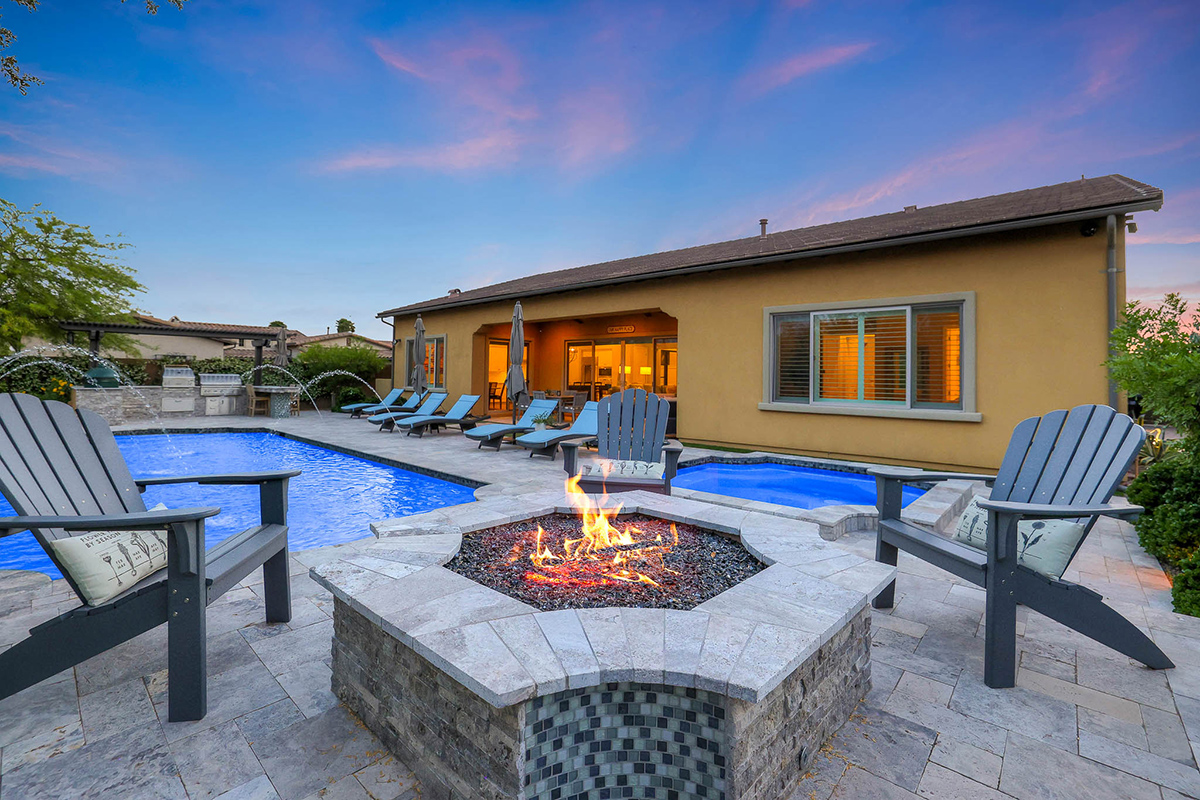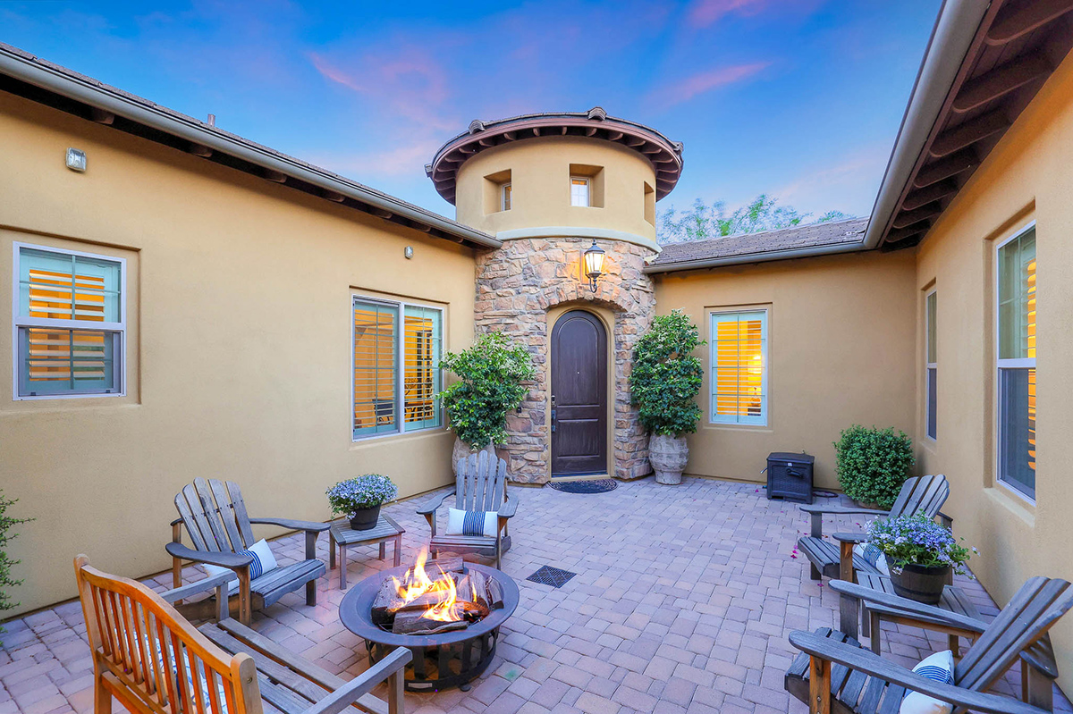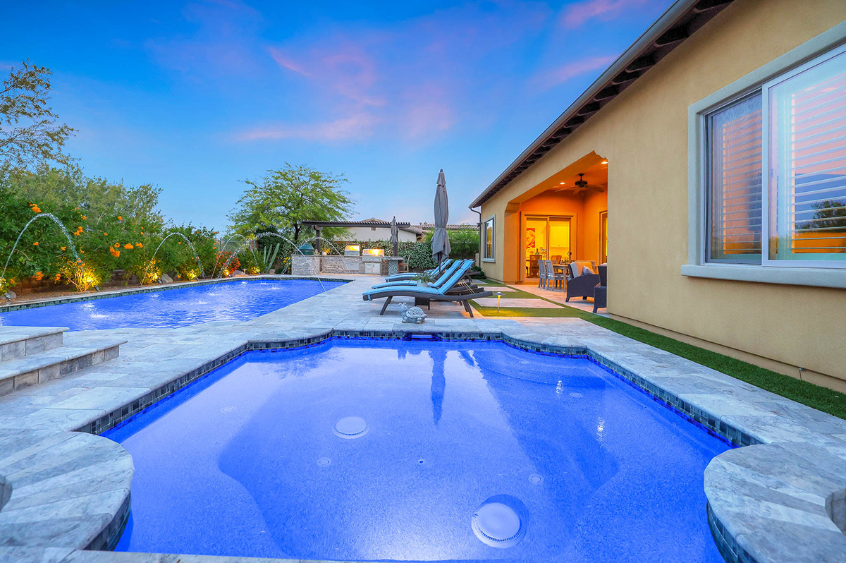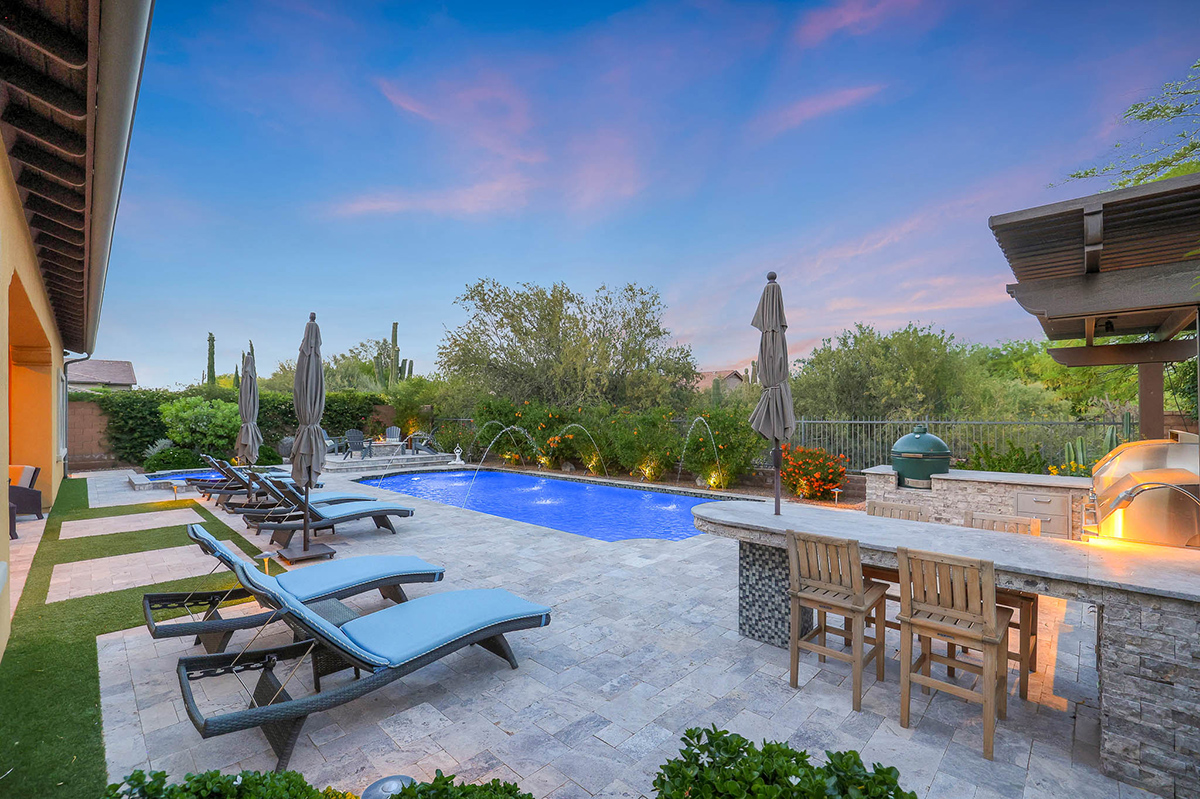 This stunning 2015 Camelot built home is located in the prestigious gated community of Bocara and has been impeccably maintained. The beautifully designed backyard is an entertainer’s dream, featuring a sparkling pool, a separate spa, an elevated fire pit, mature landscaping, tumbled travertine hardscape, artificial turf, a pergola covered outdoor kitchen with a top of the line Lynx grill, pizza oven, and Green Egg smoker, as well as a covered patio. The backyard also backs up to Natural Area Open Space, giving it a private feel.