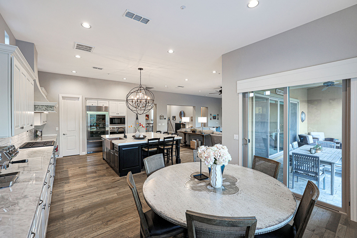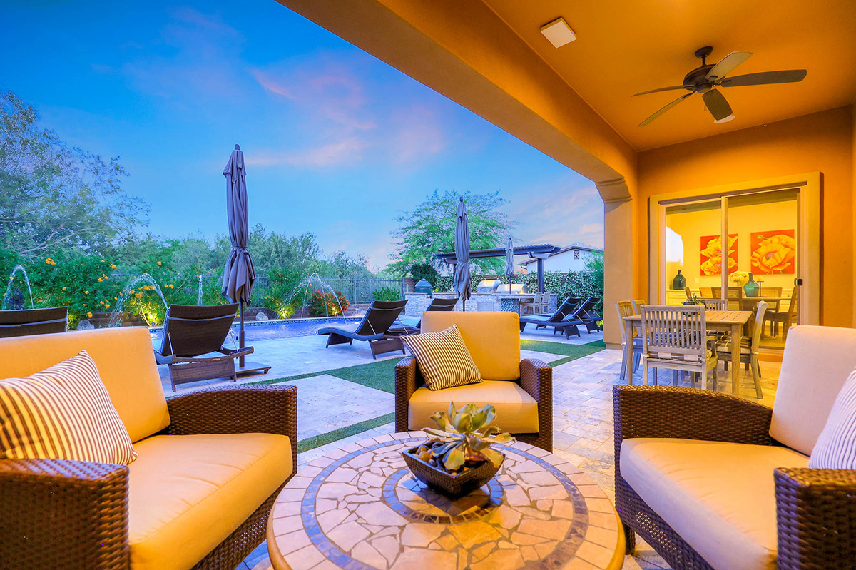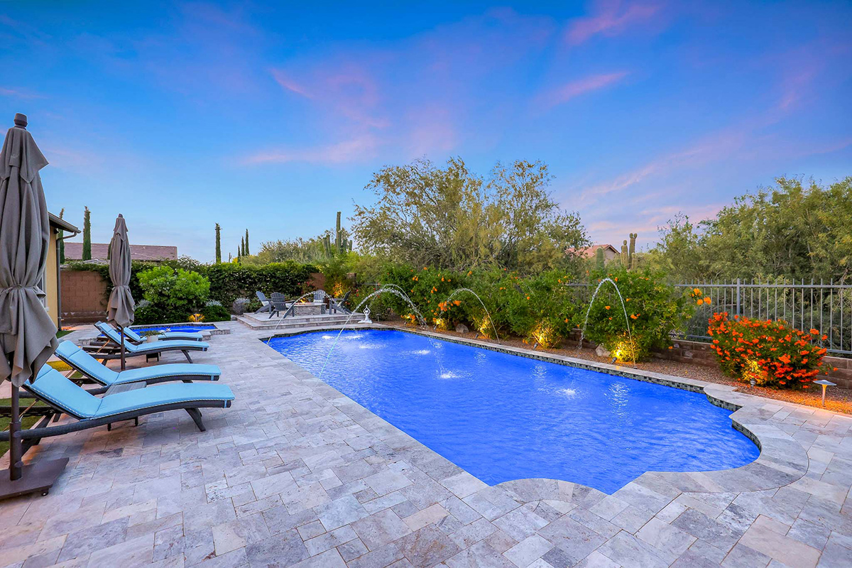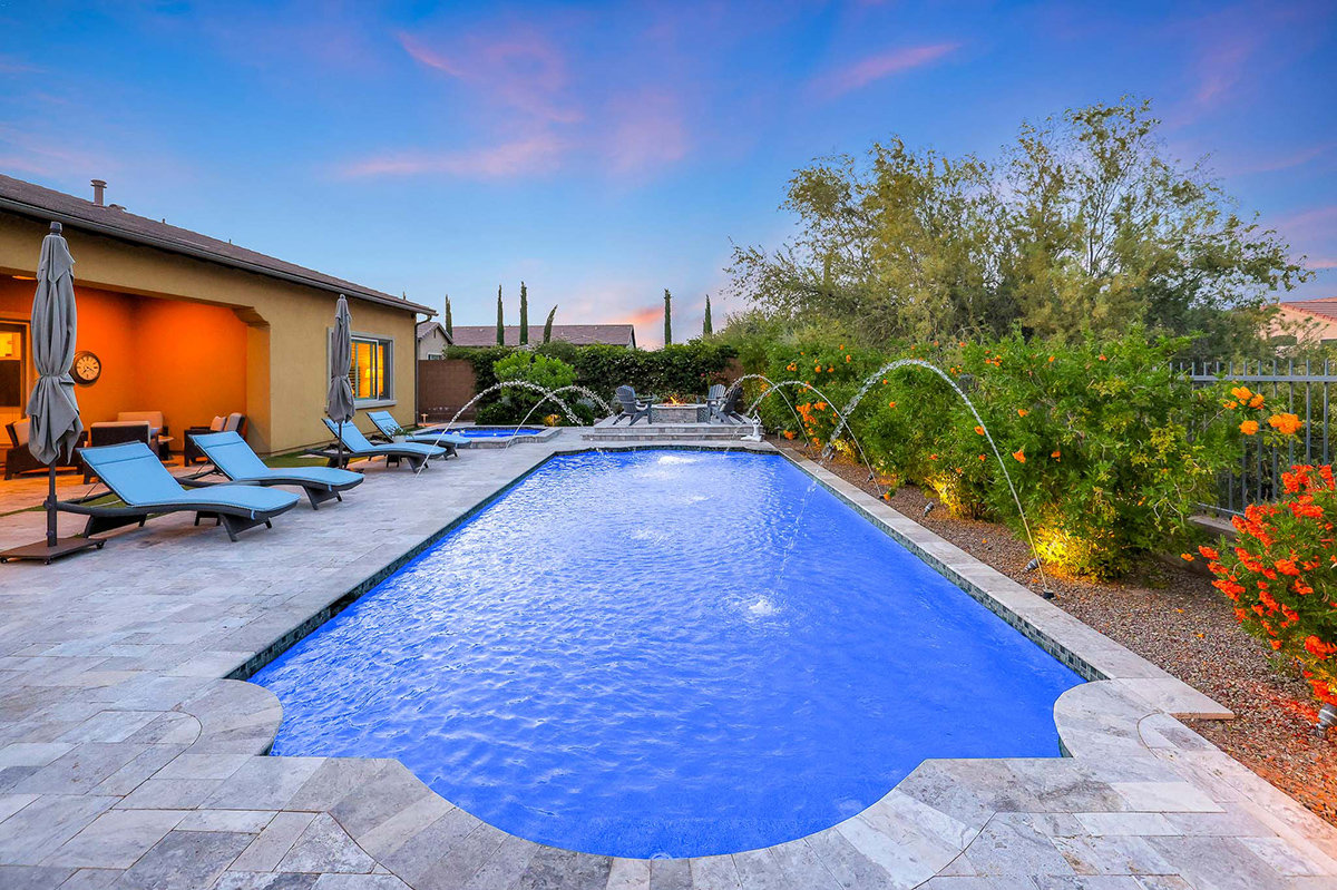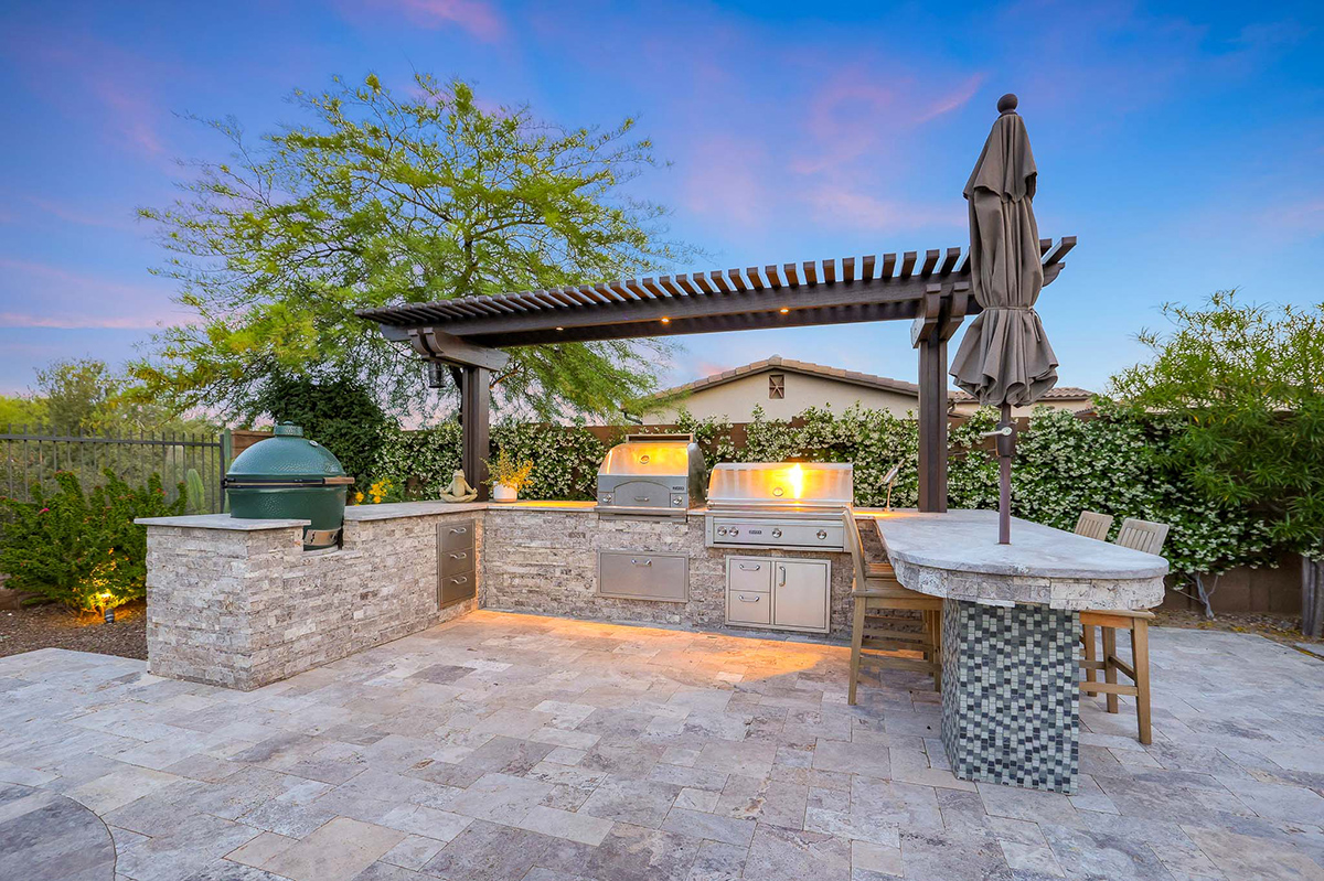 This stunning 2015 Camelot built home is located in the prestigious gated community of Bocara and has been impeccably maintained. The beautifully designed backyard is an entertainer’s dream, featuring a sparkling pool, a separate spa, an elevated fire pit, mature landscaping, tumbled travertine hardscape, artificial turf, a pergola covered outdoor kitchen with a top of the line Lynx grill, pizza oven, and Green Egg smoker, as well as a covered patio. The backyard also backs up to Natural Area Open Space, giving it a private feel.