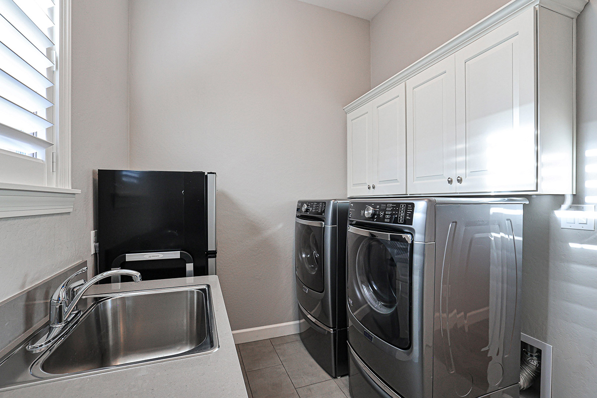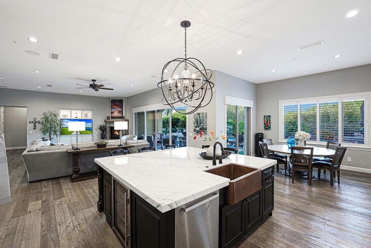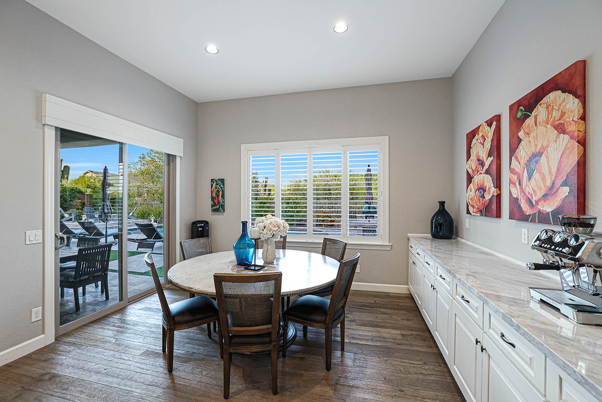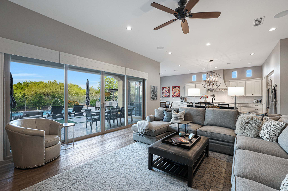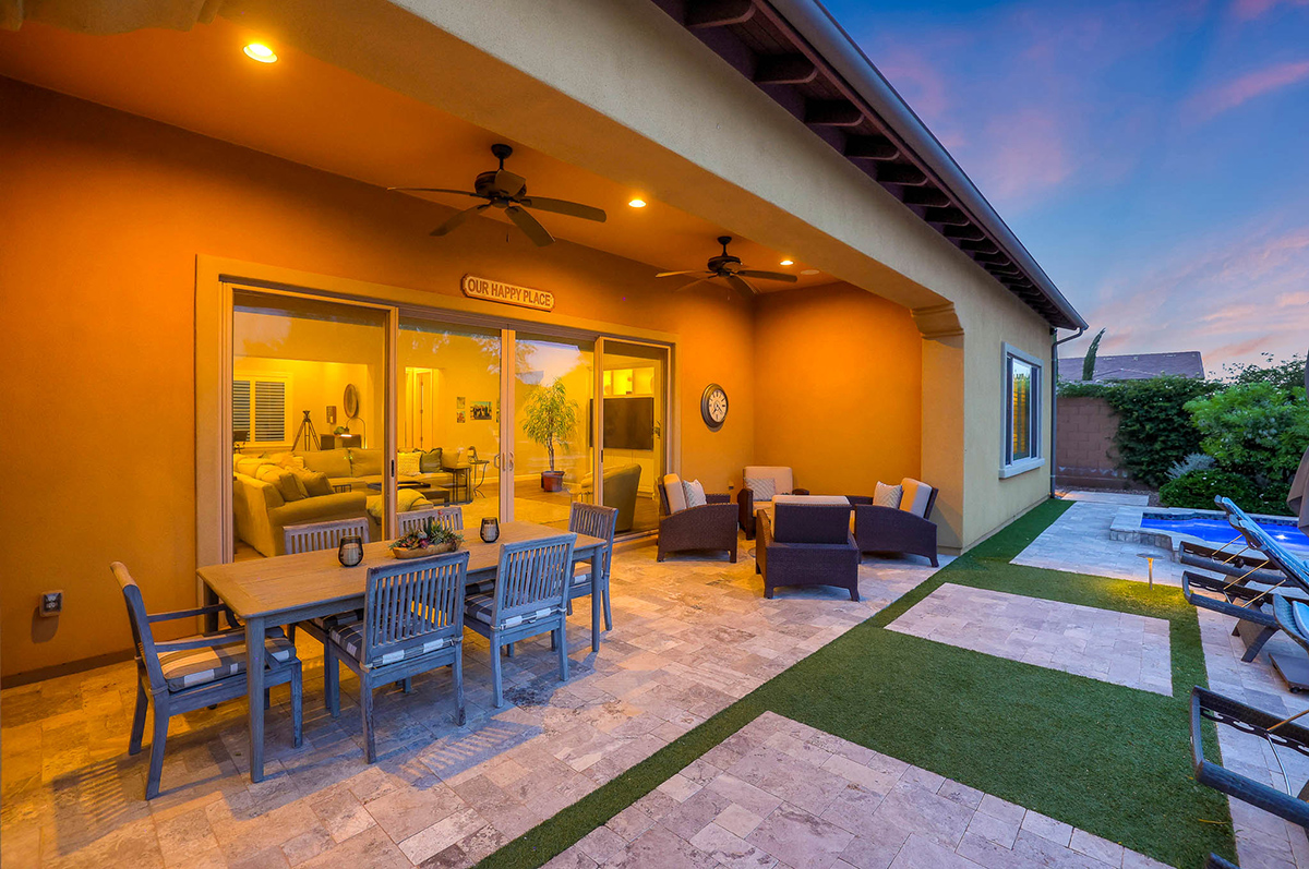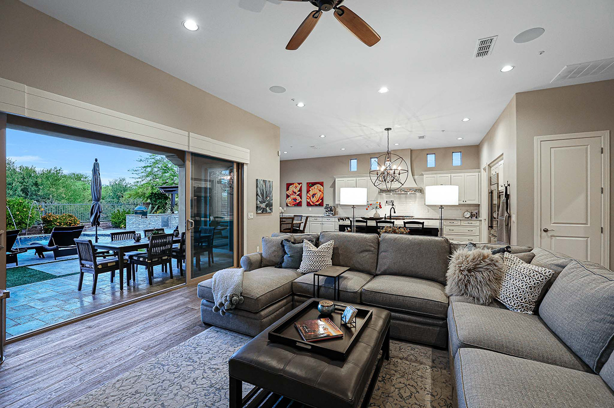 This stunning 2015 Camelot built home is located in the prestigious gated community of Bocara and has been impeccably maintained. The beautifully designed backyard is an entertainer’s dream, featuring a sparkling pool, a separate spa, an elevated fire pit, mature landscaping, tumbled travertine hardscape, artificial turf, a pergola covered outdoor kitchen with a top of the line Lynx grill, pizza oven, and Green Egg smoker, as well as a covered patio. The backyard also backs up to Natural Area Open Space, giving it a private feel.