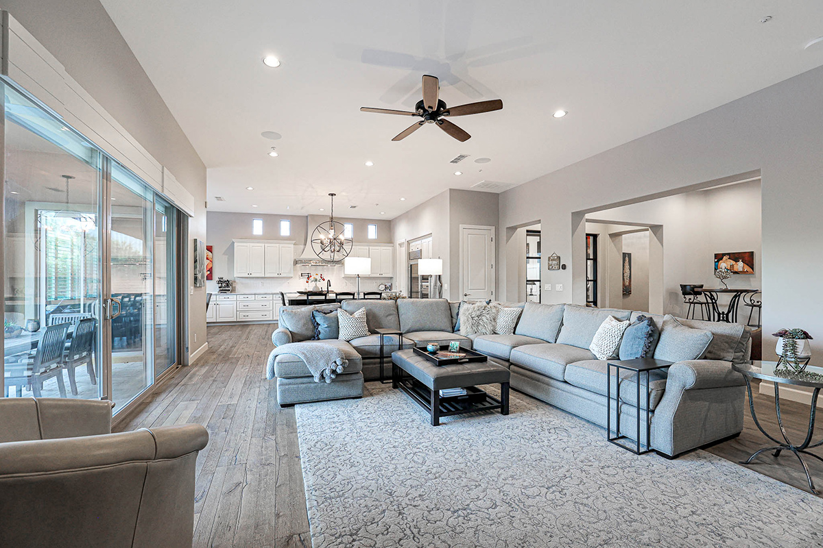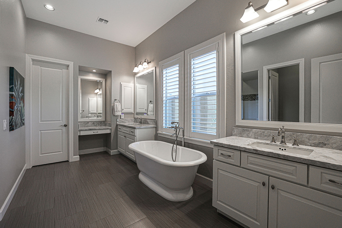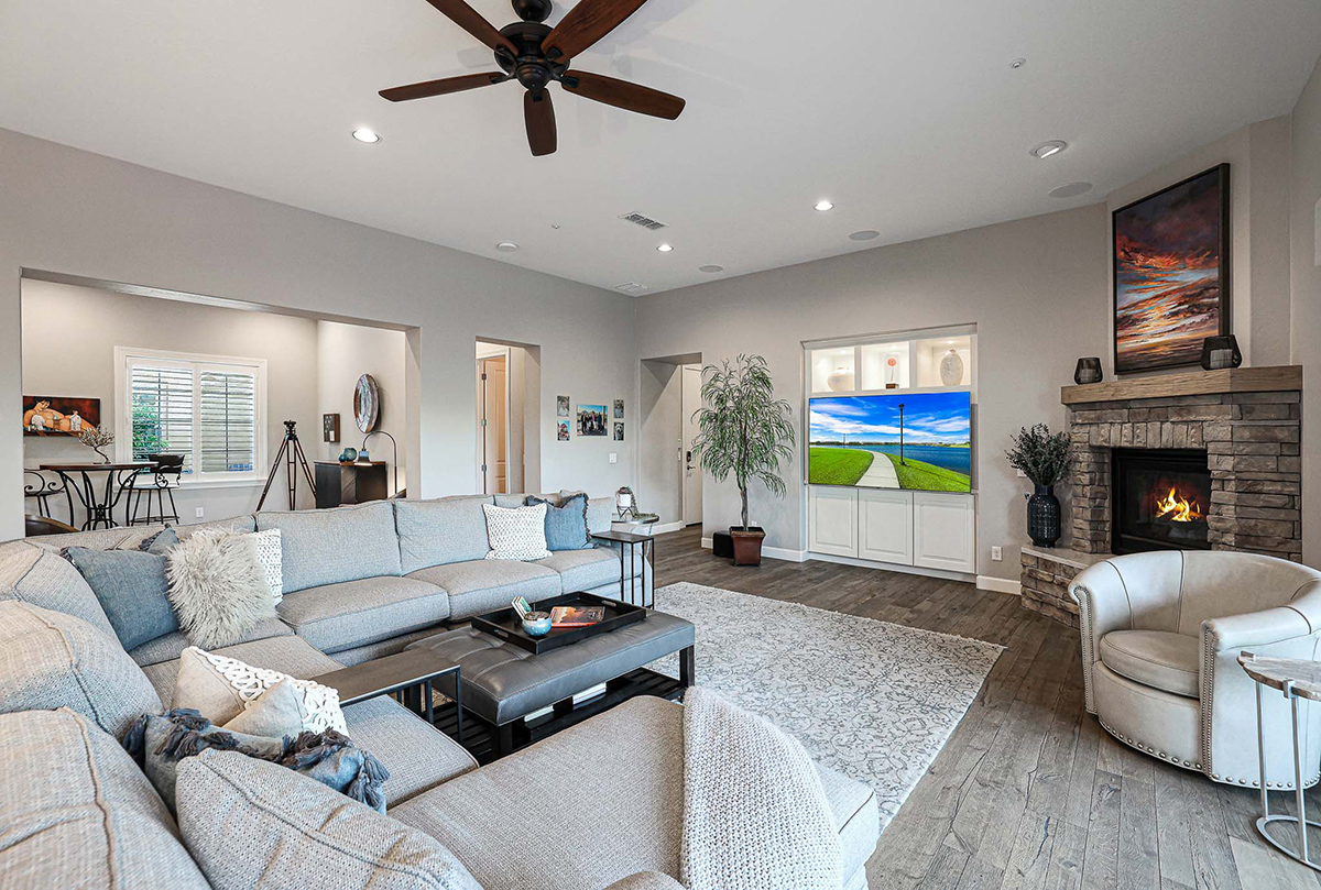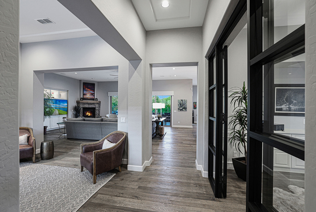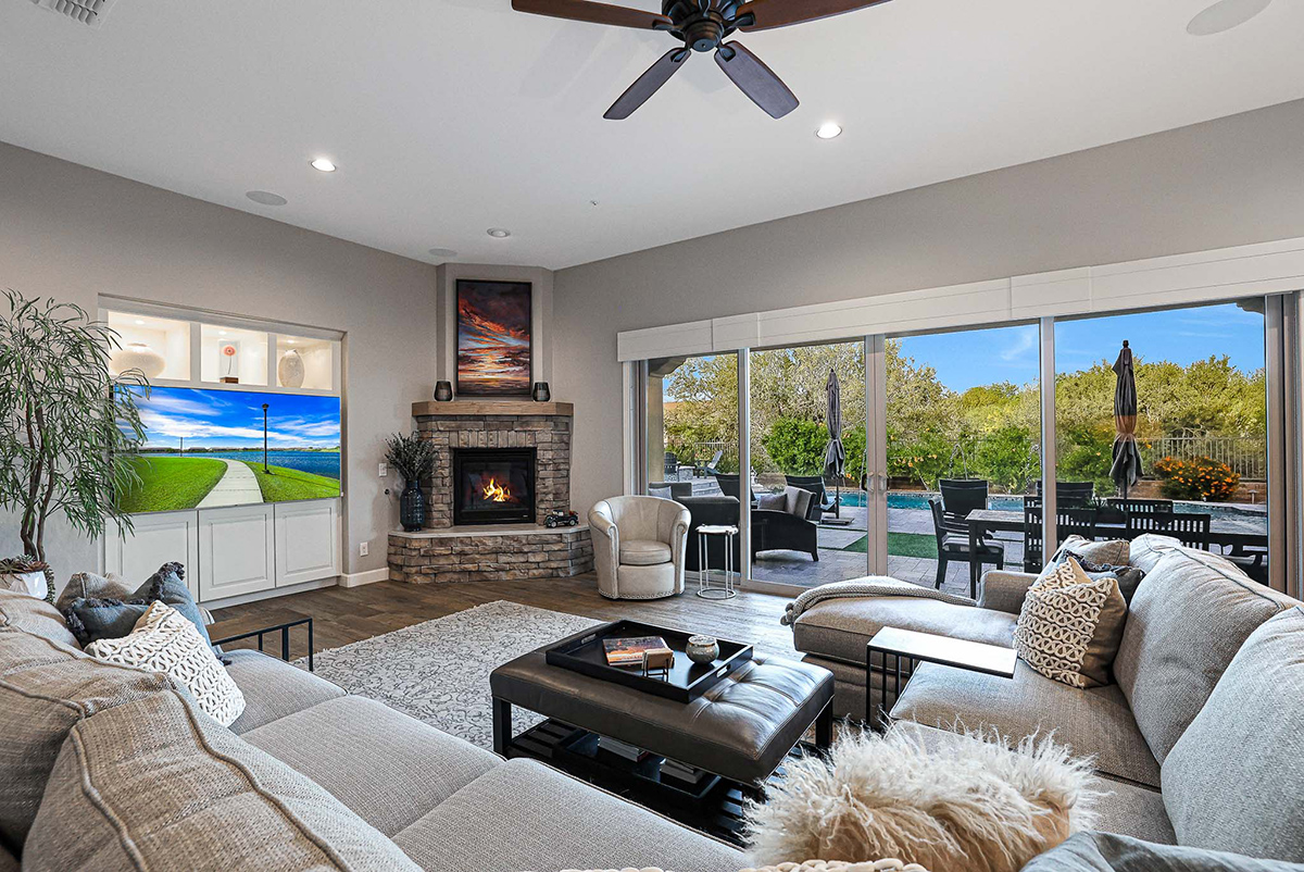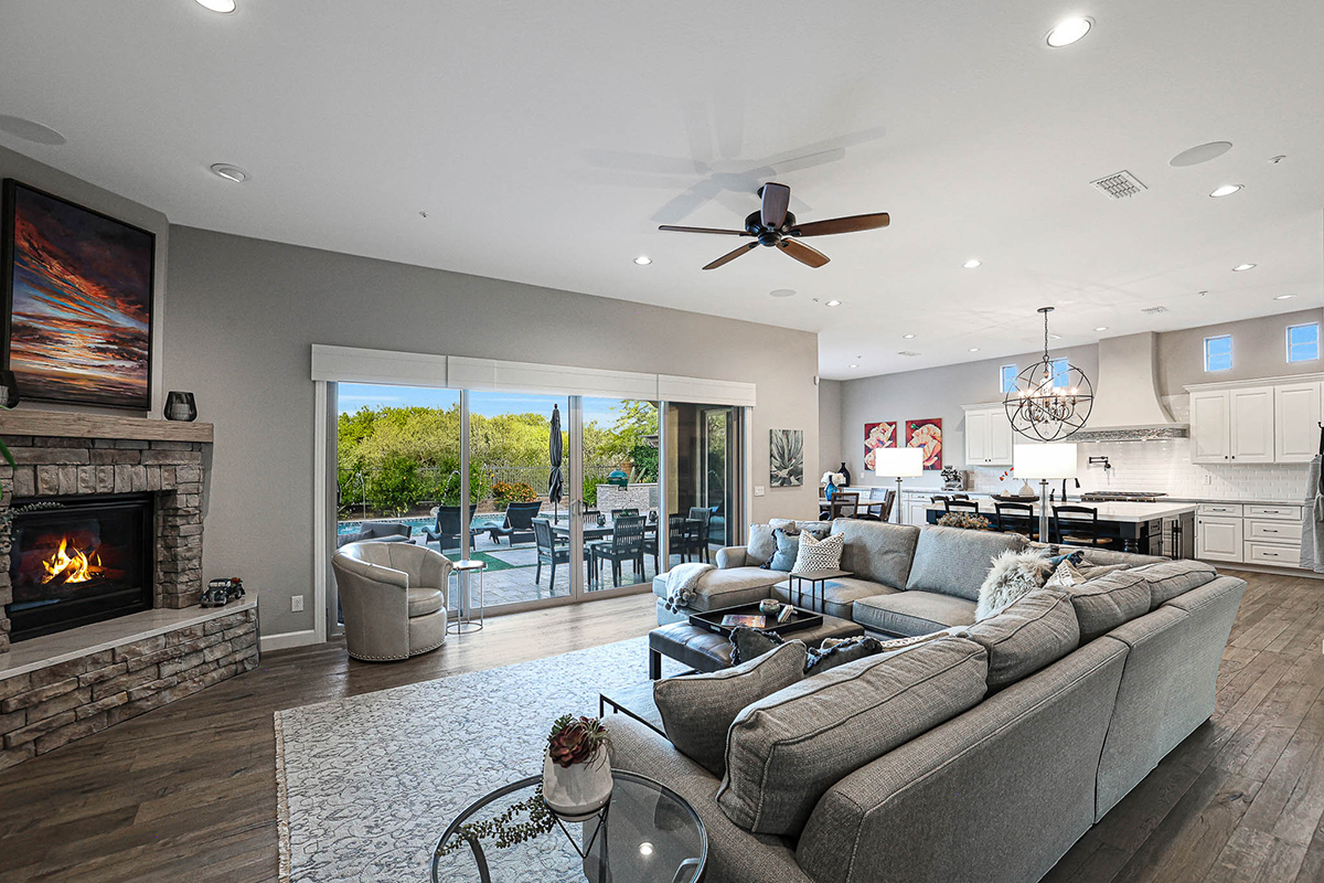 A four-panel sliding door anchors the great room, which features a stacked stone fireplace and an open feel. The primary suite has dual vanities, a walk-in rain shower, a centerpiece soaking tub, and a custom cabinet walk-in closet.