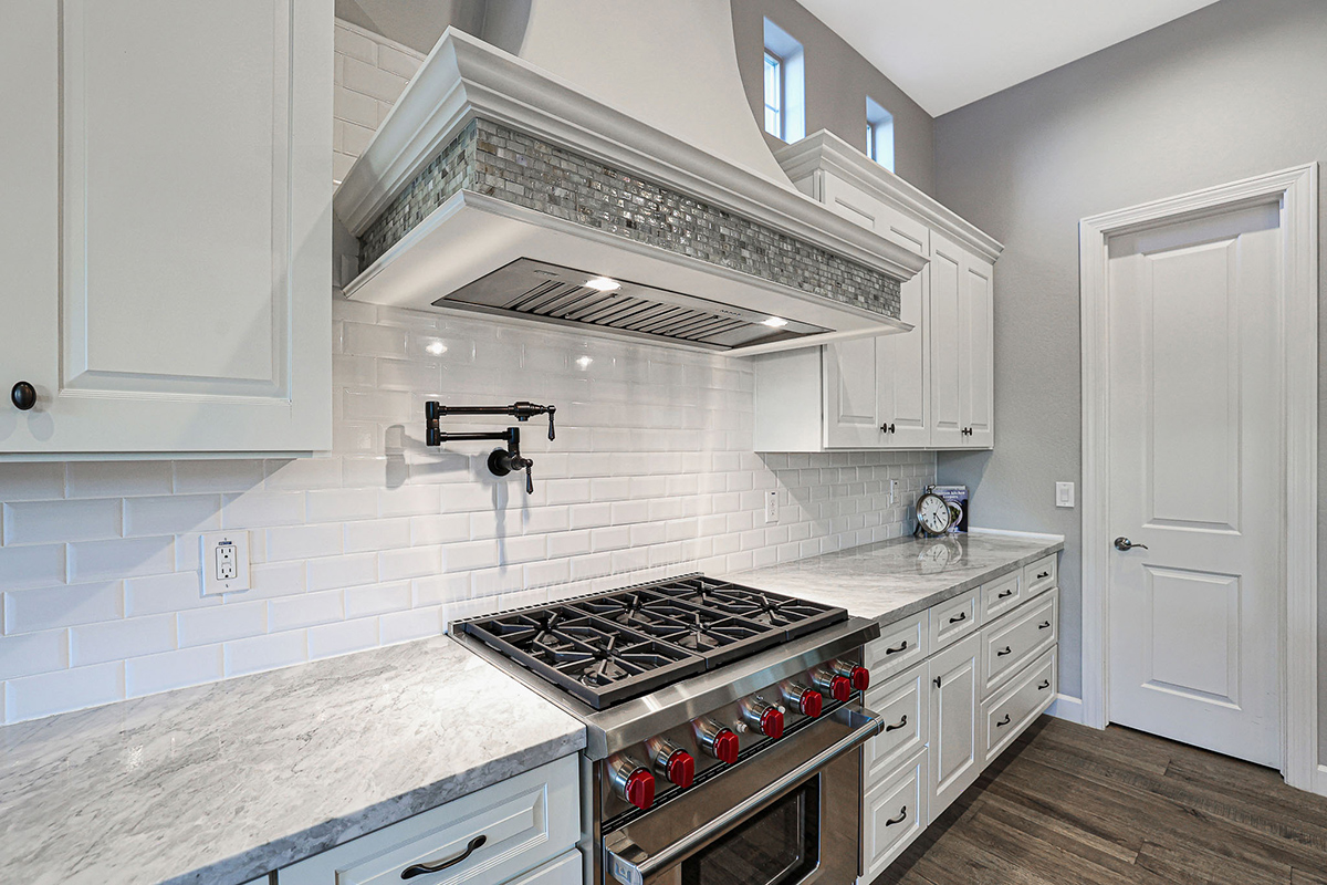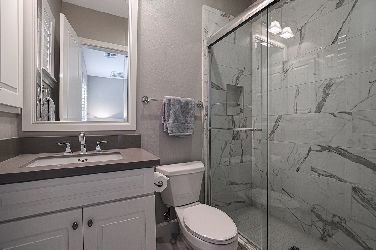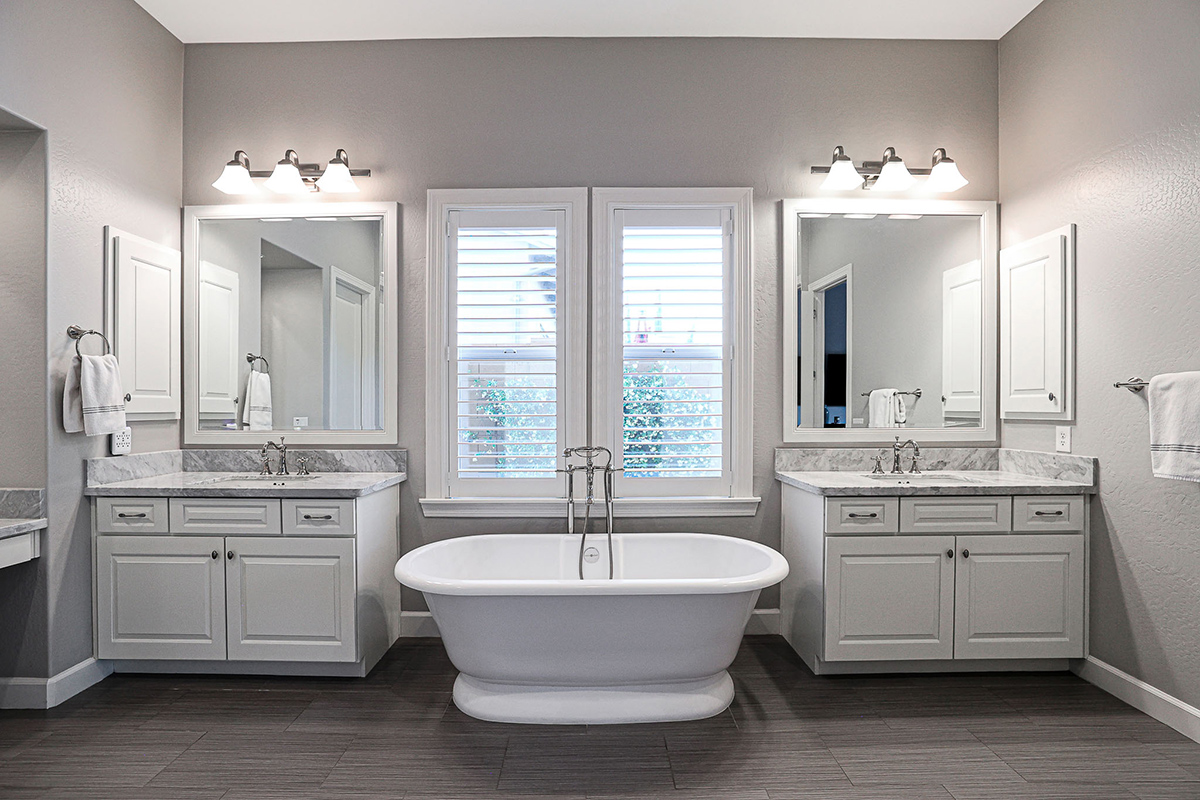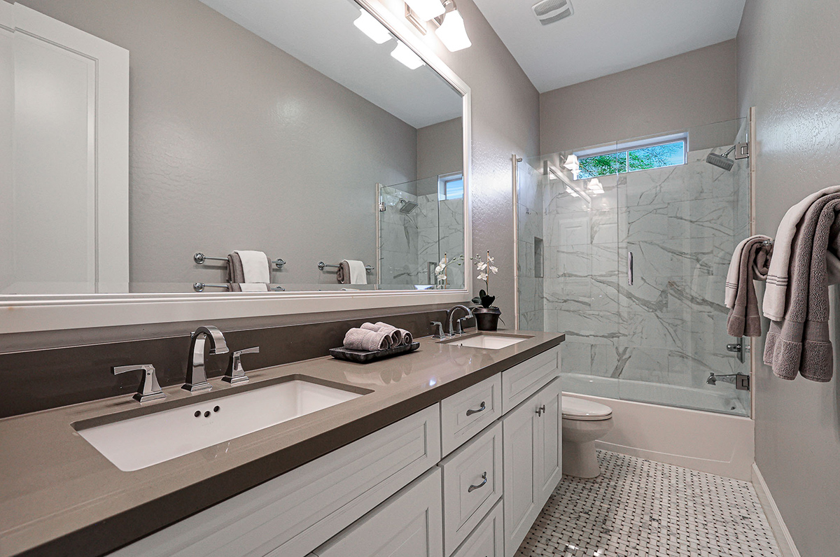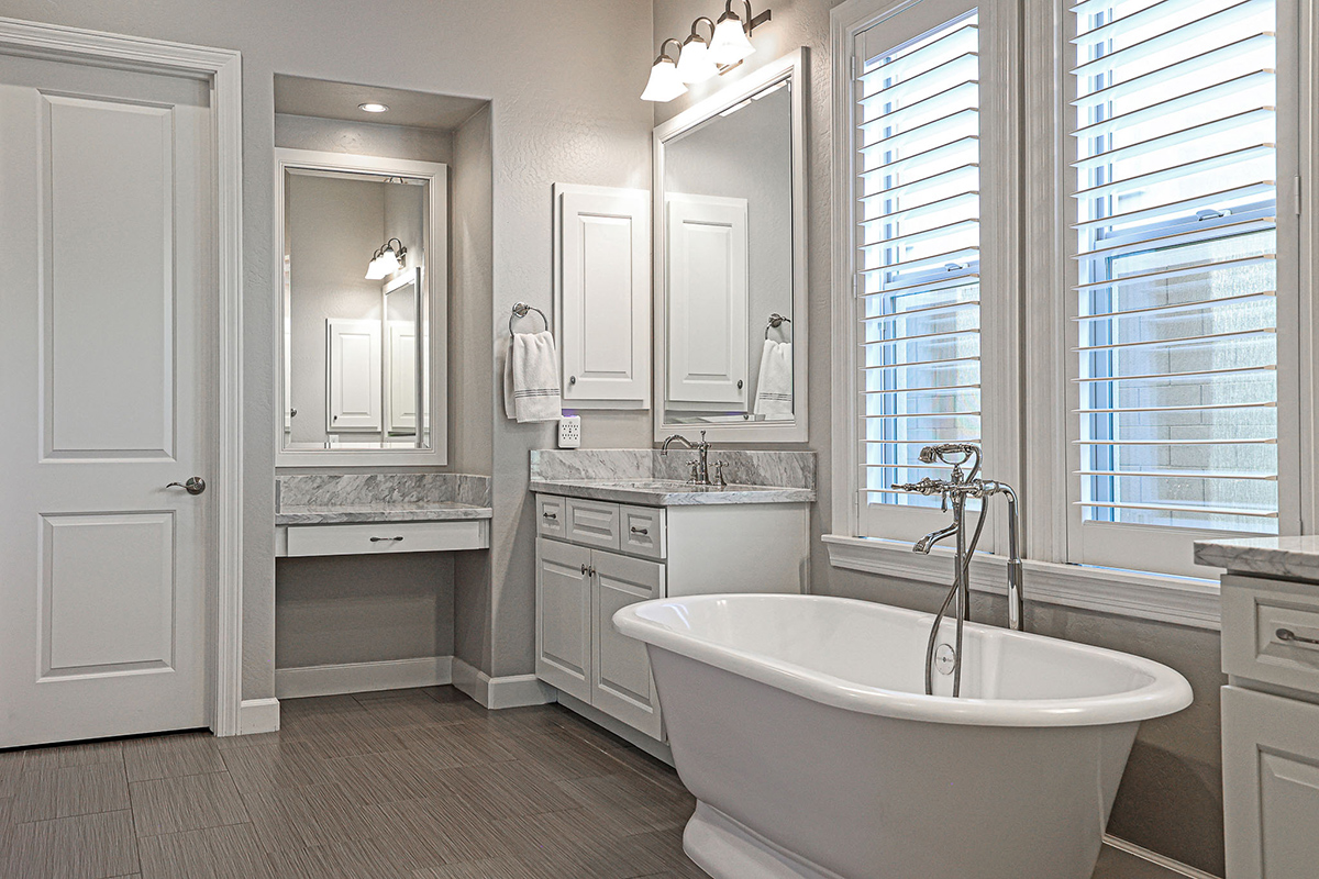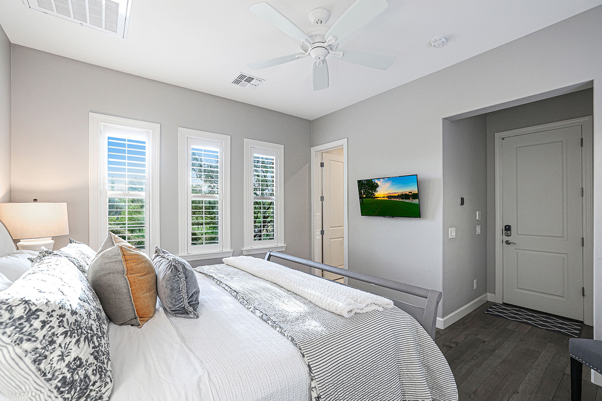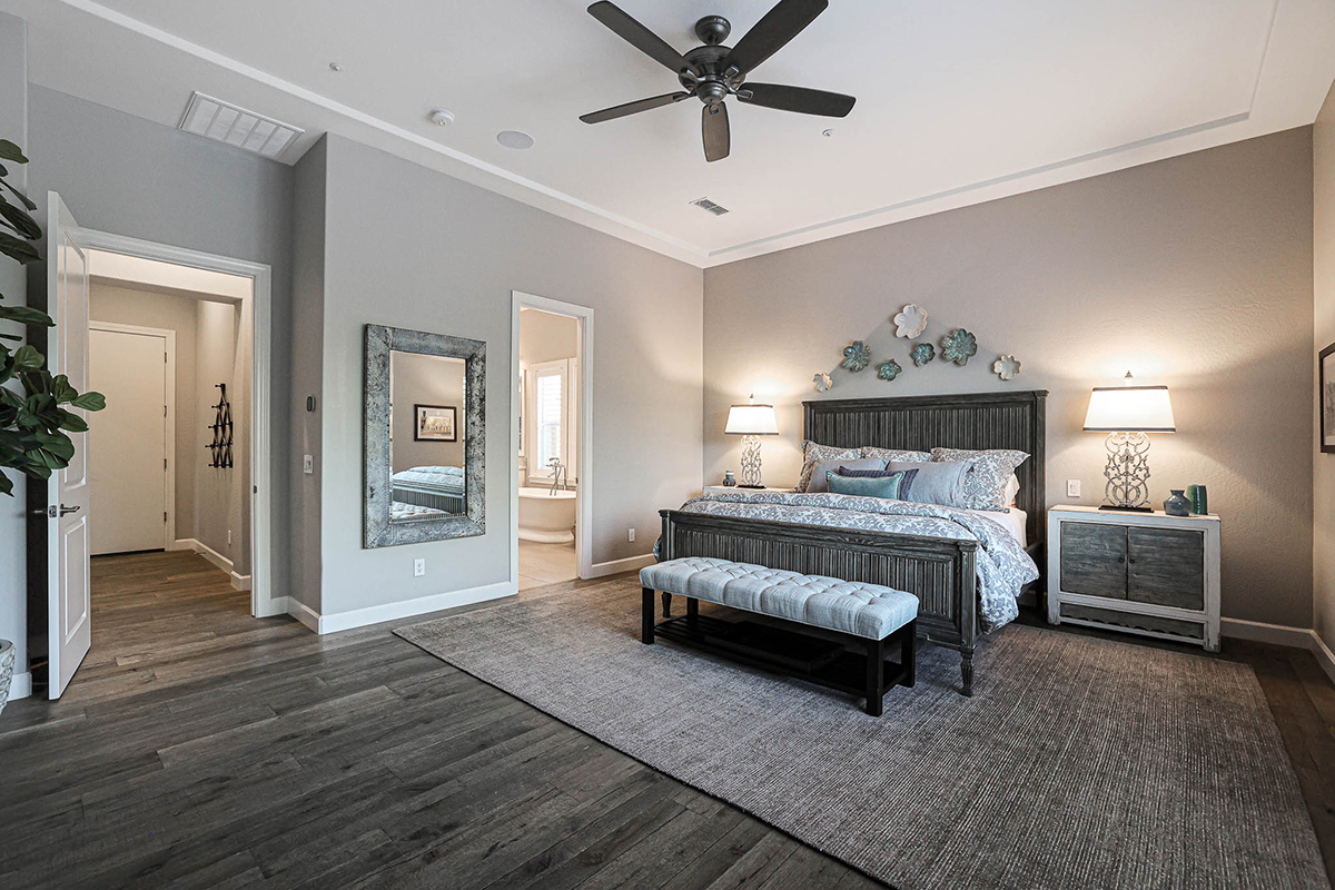 A four-panel sliding door anchors the great room, which features a stacked stone fireplace and an open feel. The primary suite has dual vanities, a walk-in rain shower, a centerpiece soaking tub, and a custom cabinet walk-in closet.