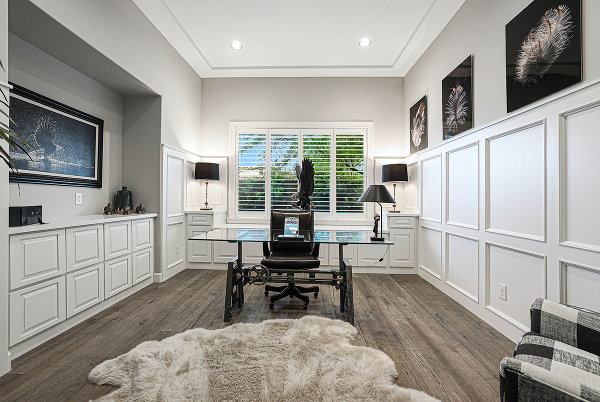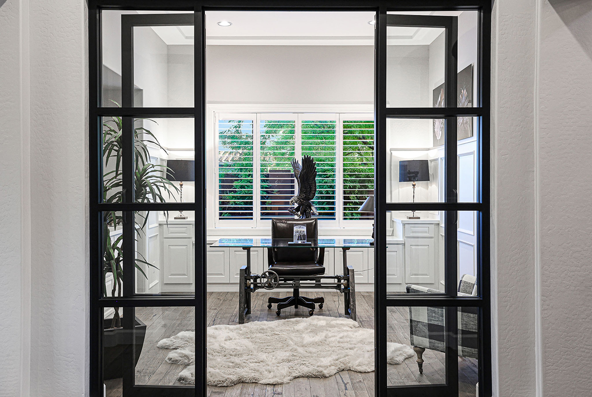 The chef’s kitchen is immaculate with marble surfaces, bright white cabinetry, and top-of-the-line stainless steel appliances, including a gas stove. The dining room is a flex space perfect for entertaining, and the private office has built-in cabinets and stunning, soundproof steel and glass entry doors.