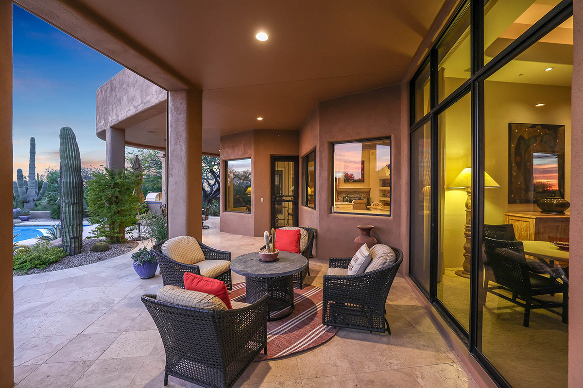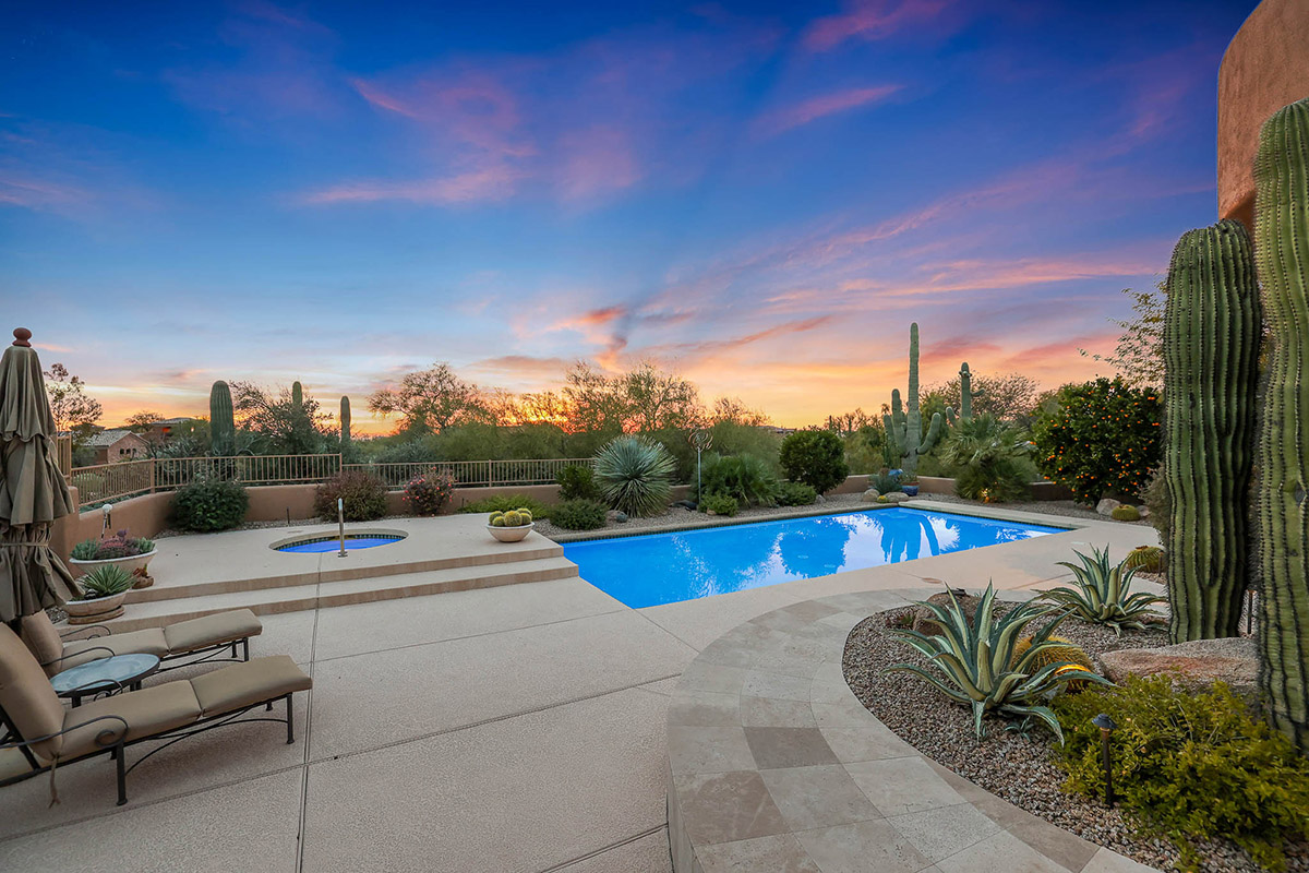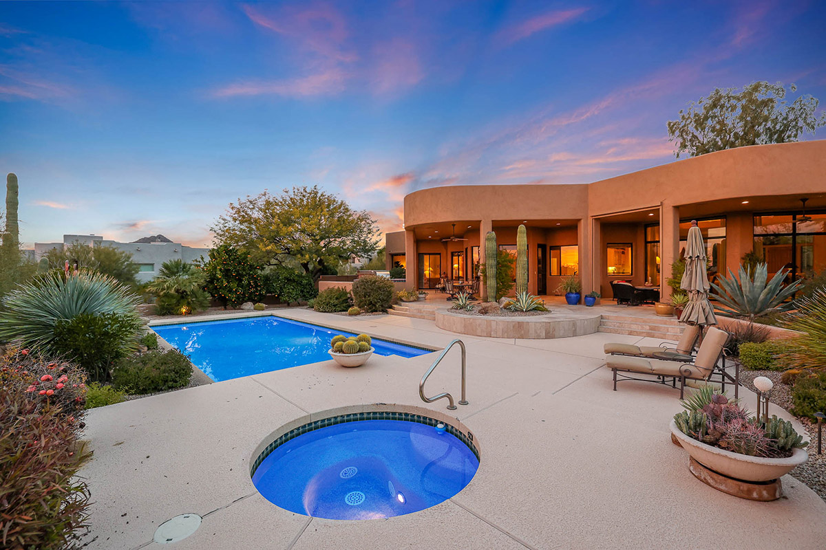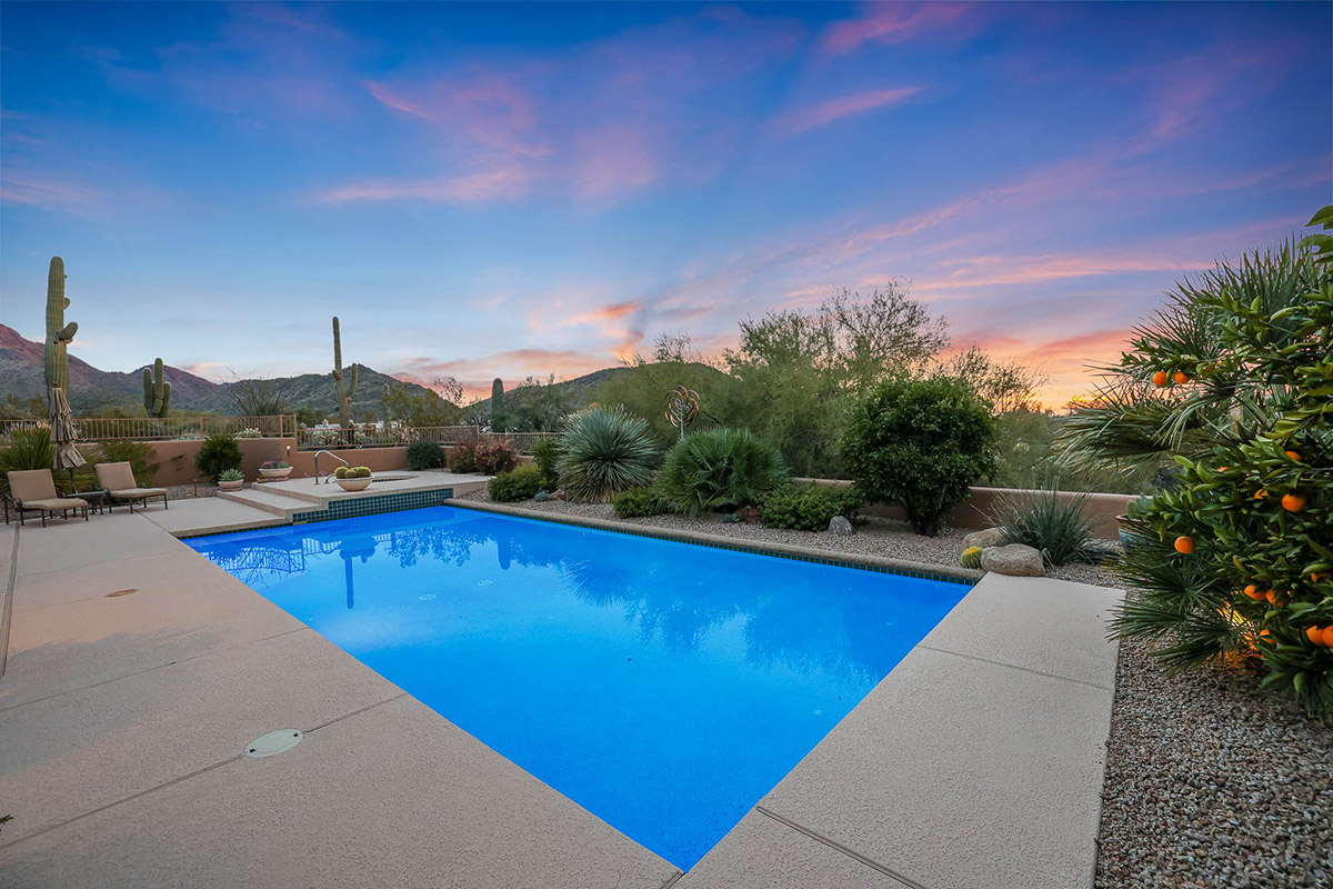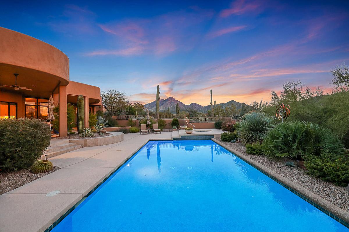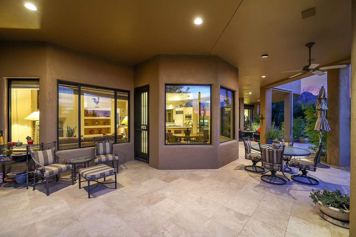 Beautiful Southwest Contemporary inspired home in guard gated Glenn Moor at Troon Village is ready for the next homeowner! Enjoy views of Troon Mountain and Pinnacle Peak from the front and McDowell mountains out the back from this well positioned home. The southern exposure backyard has a large covered patio for multiple lounge and dining spaces, a large rectangular heated lap pool, separate spa, travertine and cool deck surfaces, and mature landscaping including fruit trees. Pride of ownership from the original owners is showcased throughout the 4,242 square feet of well laid out living space. The primary suite features a large walk-in closet with built-ins, exterior access, and a spa-like bath with soaking tub, dual vanities, separate shower, and a private water closet with bidet.