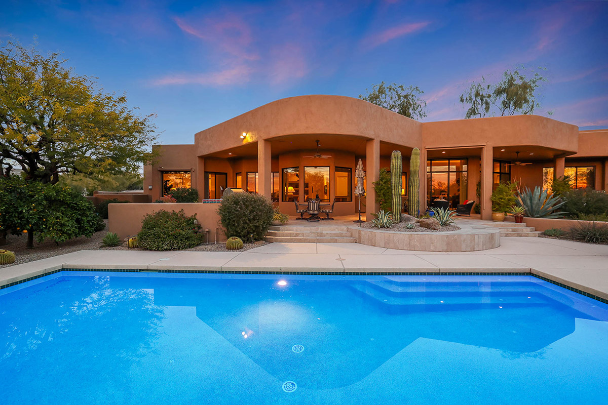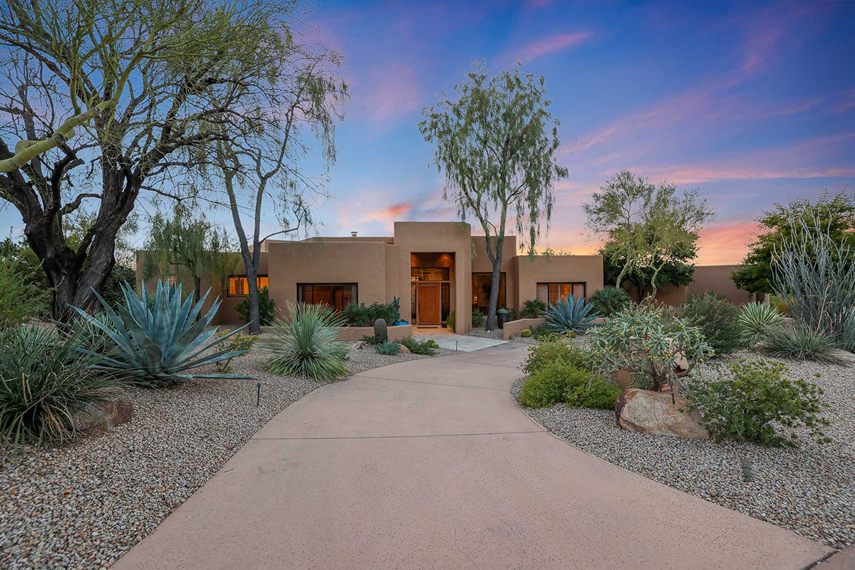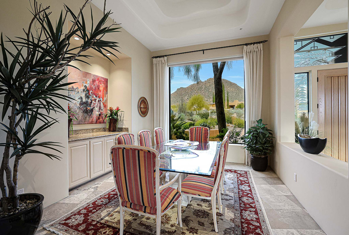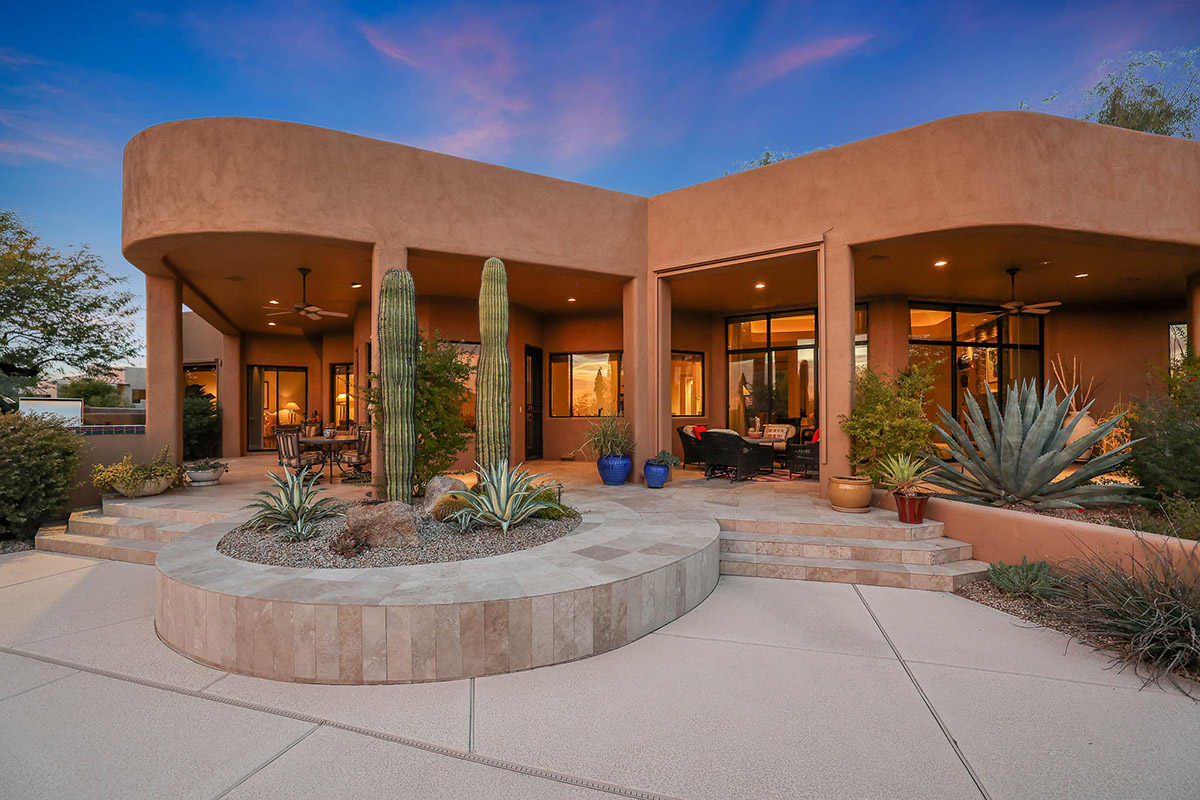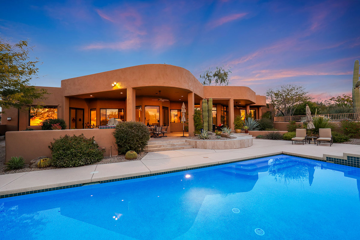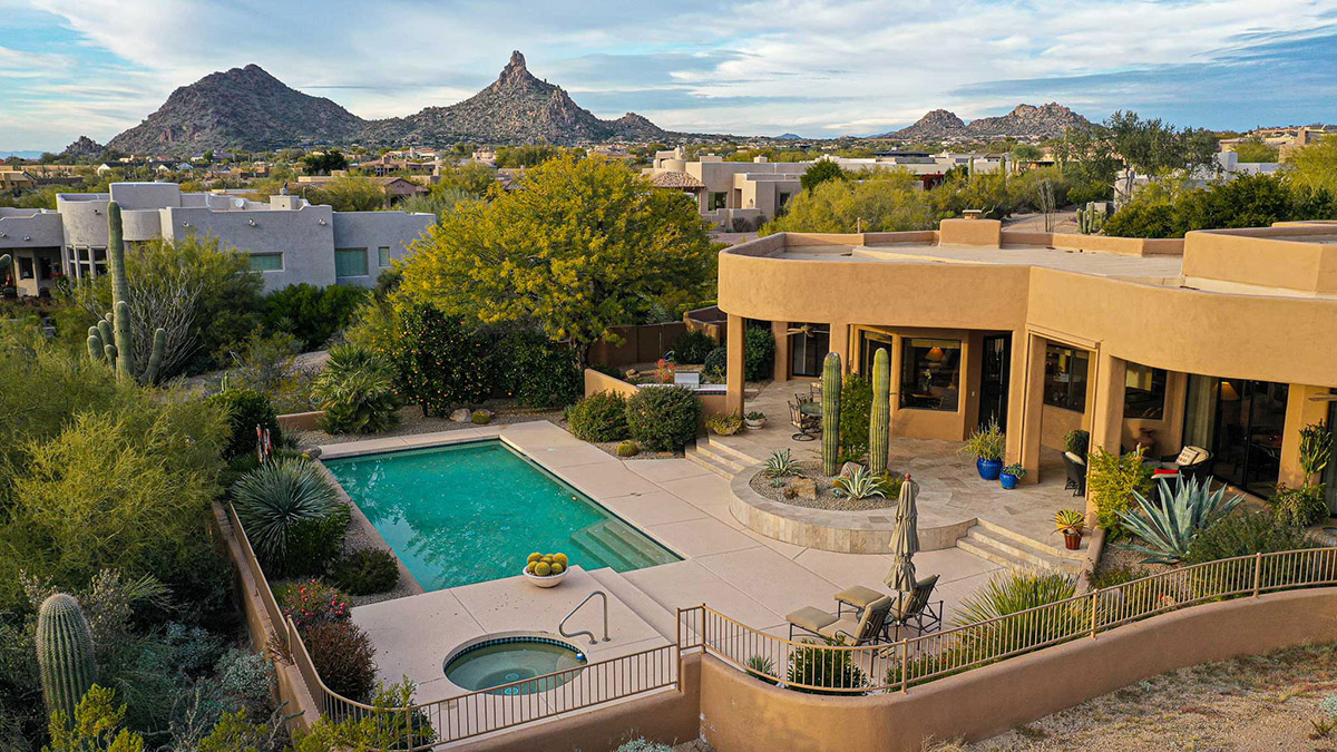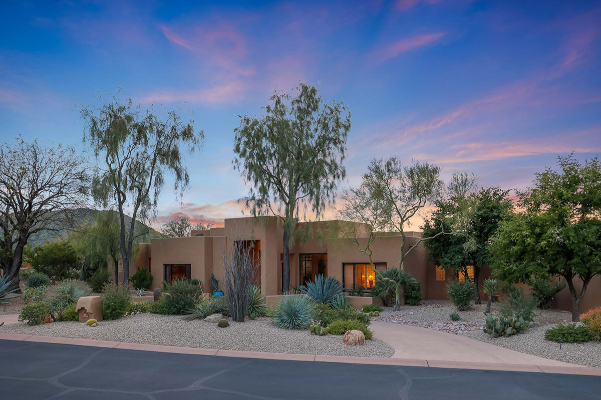 Beautiful Southwest Contemporary inspired home in guard gated Glenn Moor at Troon Village is ready for the next homeowner! Enjoy views of Troon Mountain and Pinnacle Peak from the front and McDowell mountains out the back from this well positioned home. The southern exposure backyard has a large covered patio for multiple lounge and dining spaces, a large rectangular heated lap pool, separate spa, travertine and cool deck surfaces, and mature landscaping including fruit trees. Pride of ownership from the original owners is showcased throughout the 4,242 square feet of well laid out living space. The primary suite features a large walk-in closet with built-ins, exterior access, and a spa-like bath with soaking tub, dual vanities, separate shower, and a private water closet with bidet.