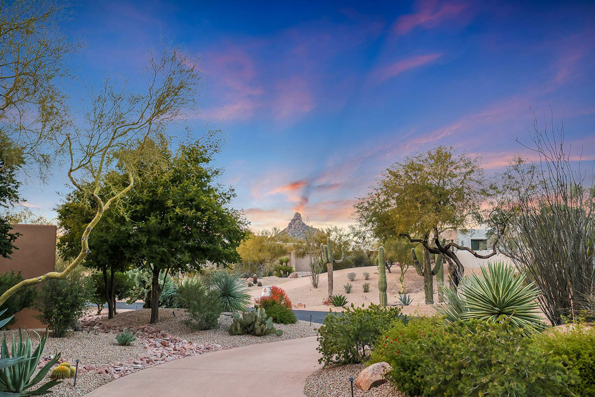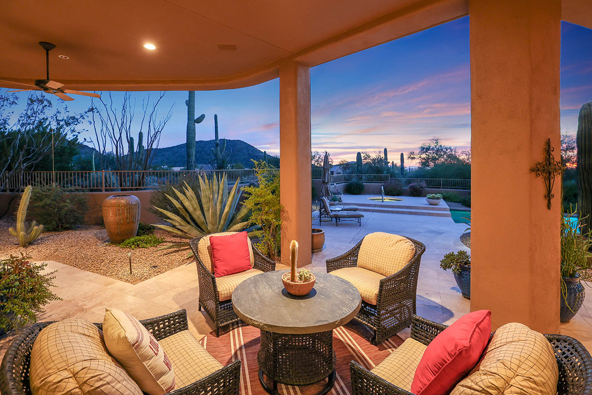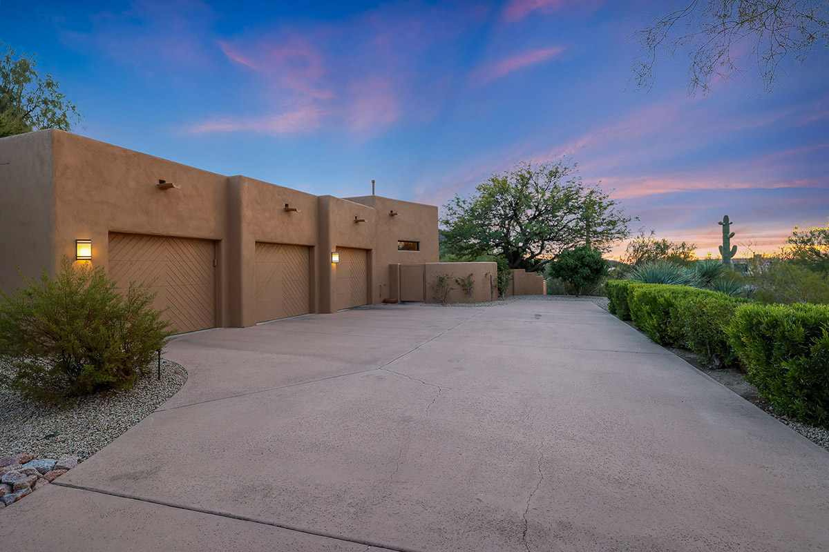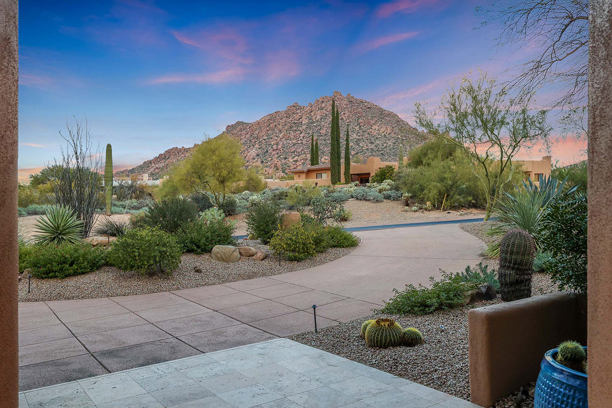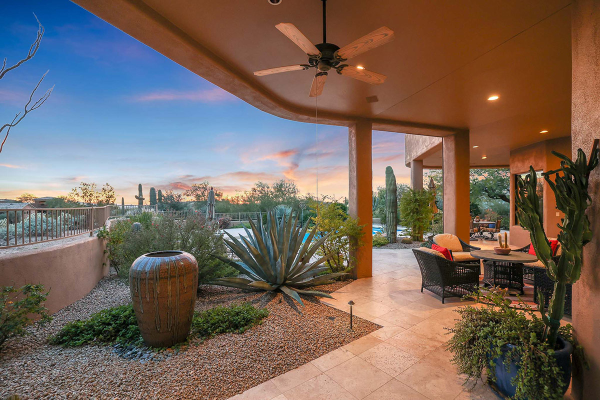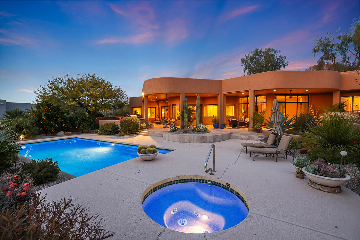 Beautiful Southwest Contemporary inspired home in guard gated Glenn Moor at Troon Village is ready for the next homeowner! Enjoy views of Troon Mountain and Pinnacle Peak from the front and McDowell mountains out the back from this well positioned home. The southern exposure backyard has a large covered patio for multiple lounge and dining spaces, a large rectangular heated lap pool, separate spa, travertine and cool deck surfaces, and mature landscaping including fruit trees. Pride of ownership from the original owners is showcased throughout the 4,242 square feet of well laid out living space. The primary suite features a large walk-in closet with built-ins, exterior access, and a spa-like bath with soaking tub, dual vanities, separate shower, and a private water closet with bidet.