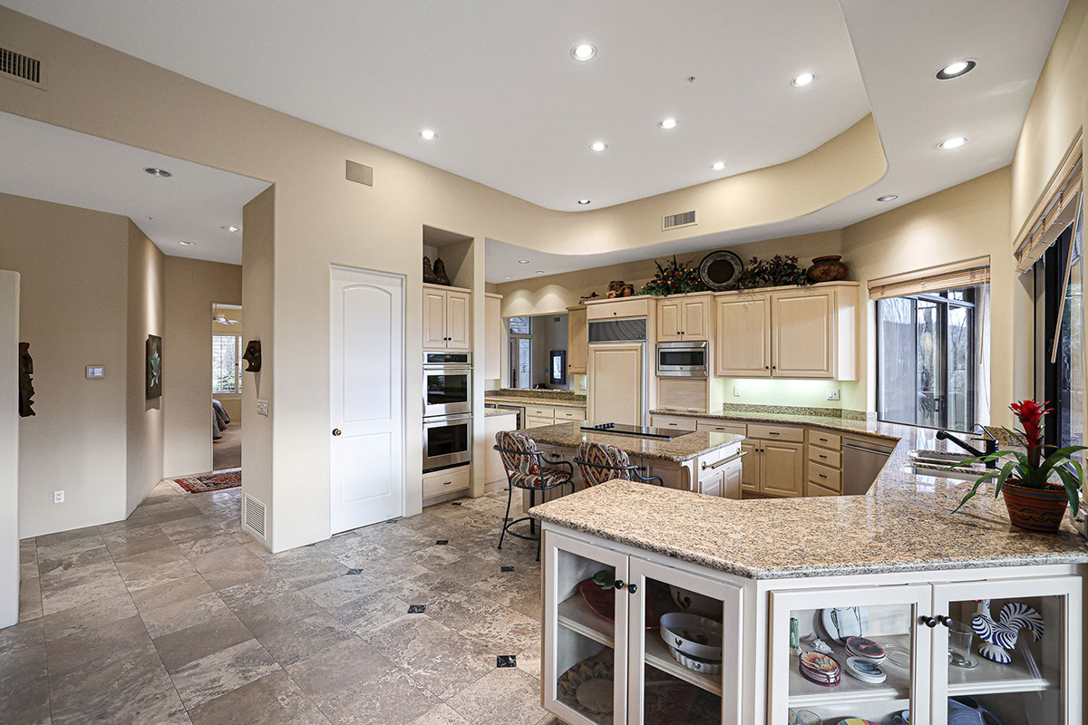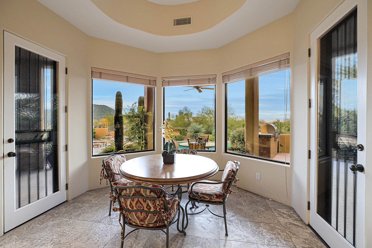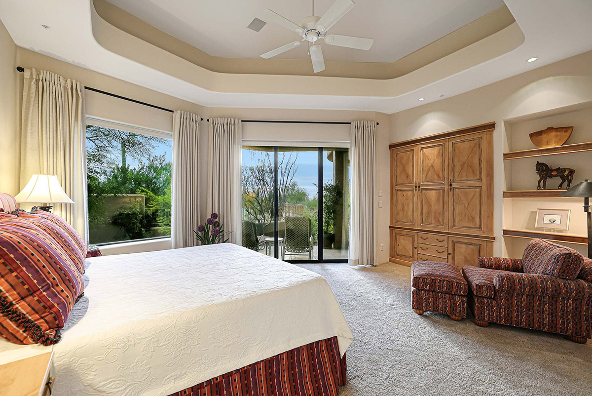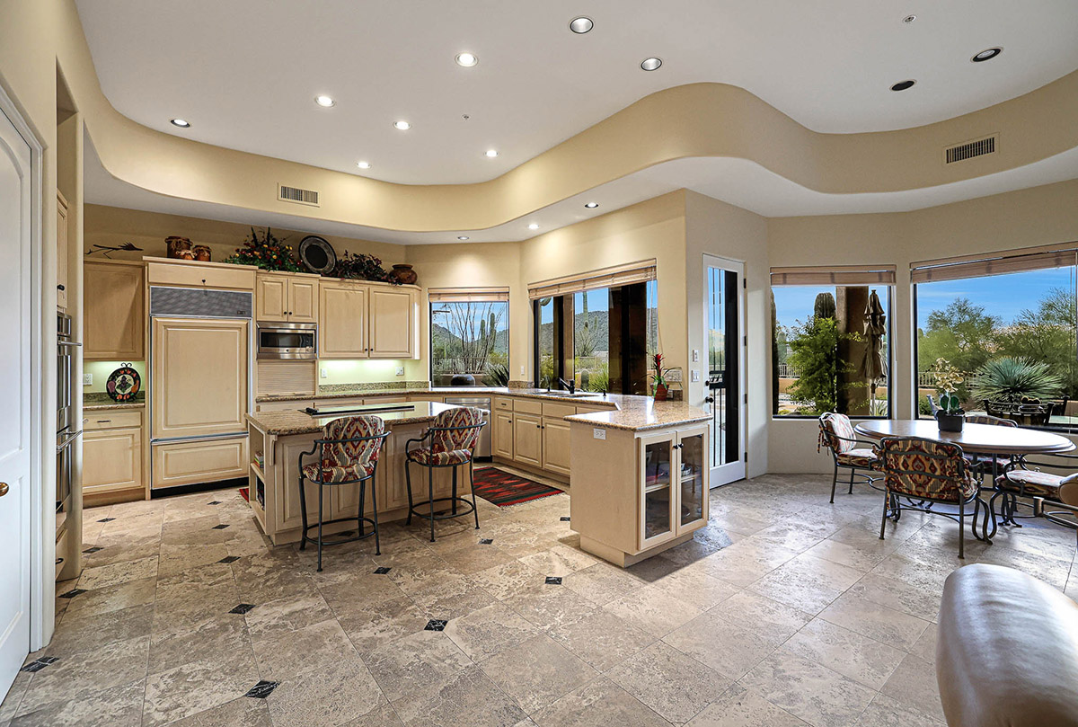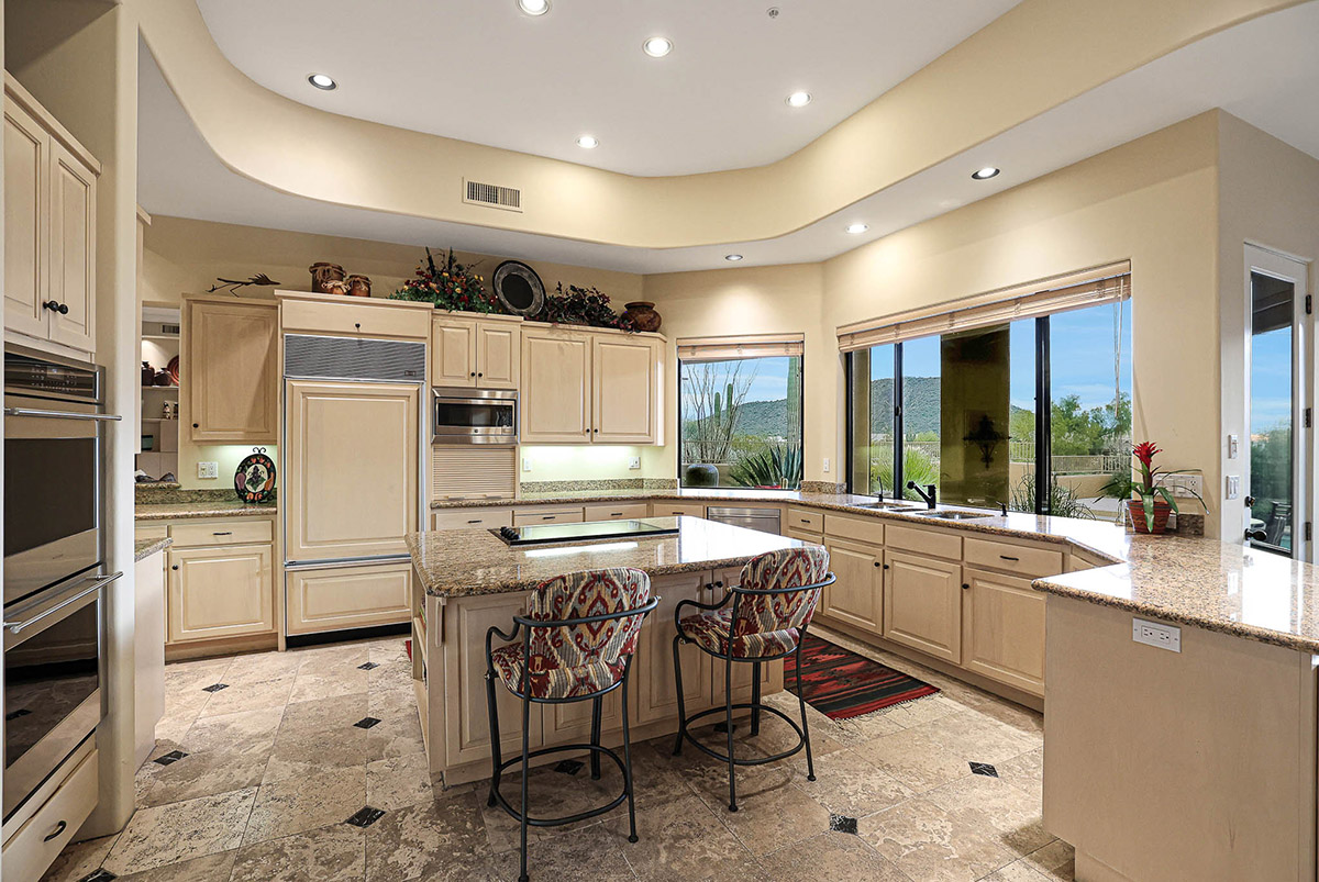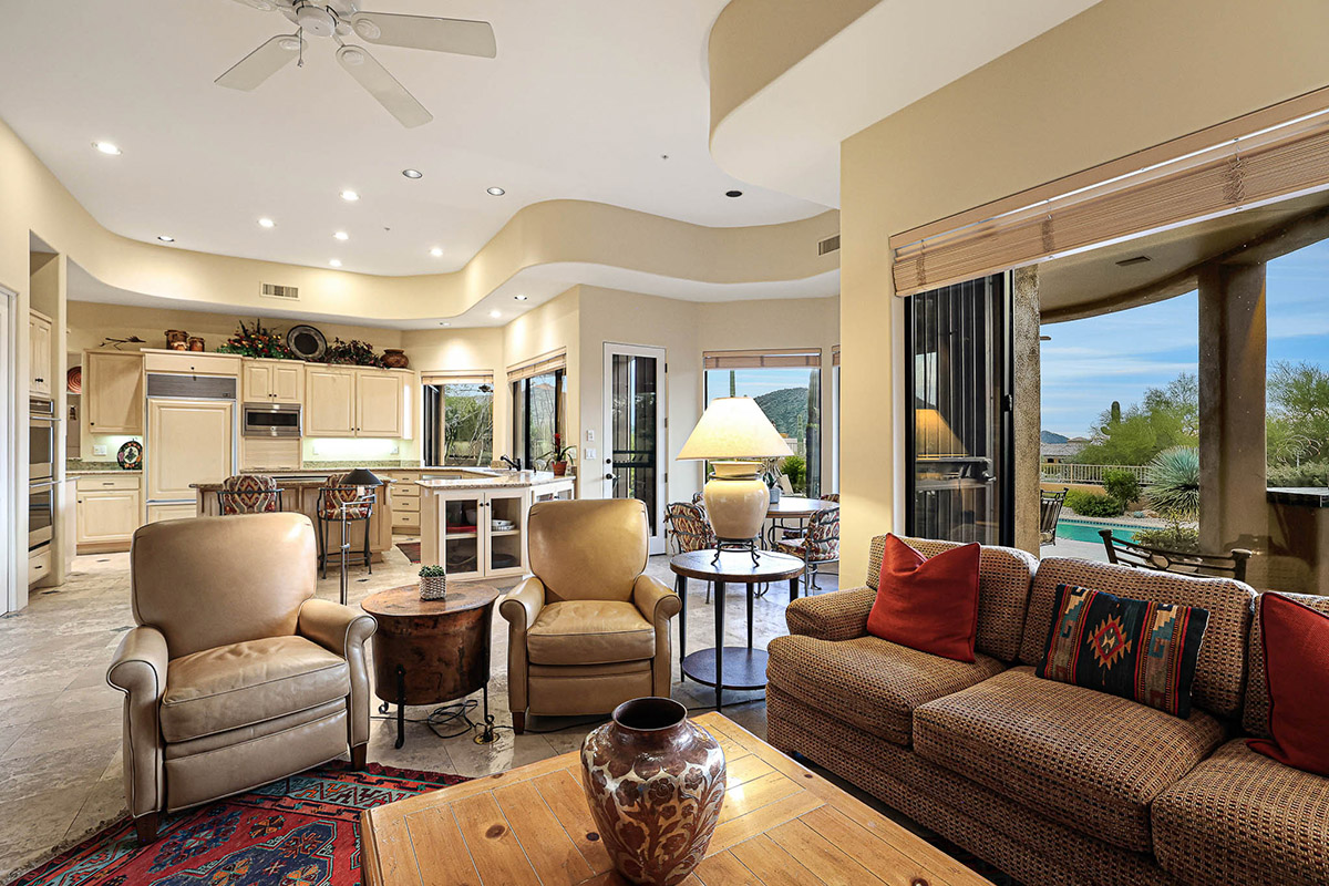 Beautiful Southwest Contemporary inspired home in guard gated Glenn Moor at Troon Village is ready for the next homeowner! Enjoy views of Troon Mountain and Pinnacle Peak from the front and McDowell mountains out the back from this well positioned home. The southern exposure backyard has a large covered patio for multiple lounge and dining spaces, a large rectangular heated lap pool, separate spa, travertine and cool deck surfaces, and mature landscaping including fruit trees. Pride of ownership from the original owners is showcased throughout the 4,242 square feet of well laid out living space. The primary suite features a large walk-in closet with built-ins, exterior access, and a spa-like bath with soaking tub, dual vanities, separate shower, and a private water closet with bidet.