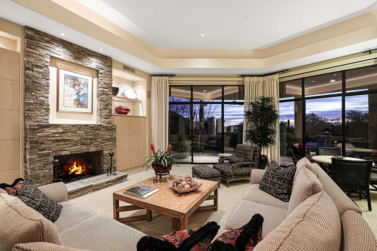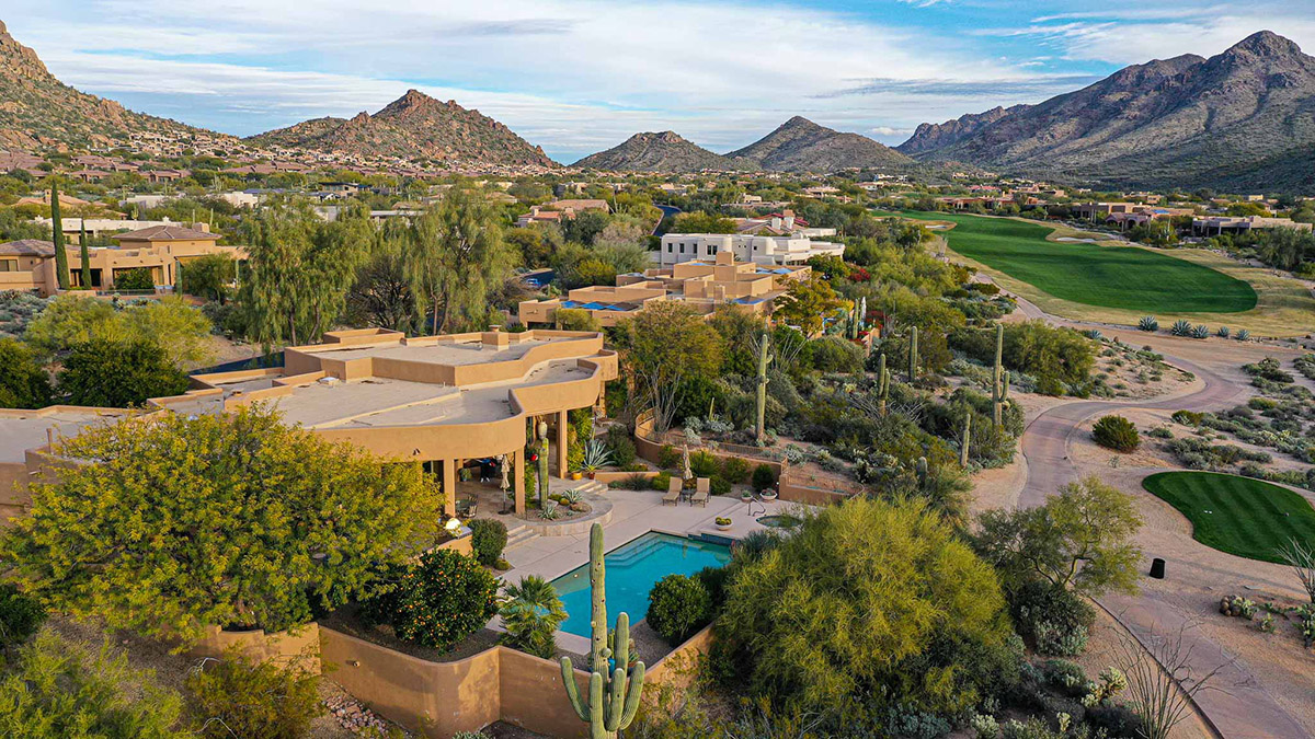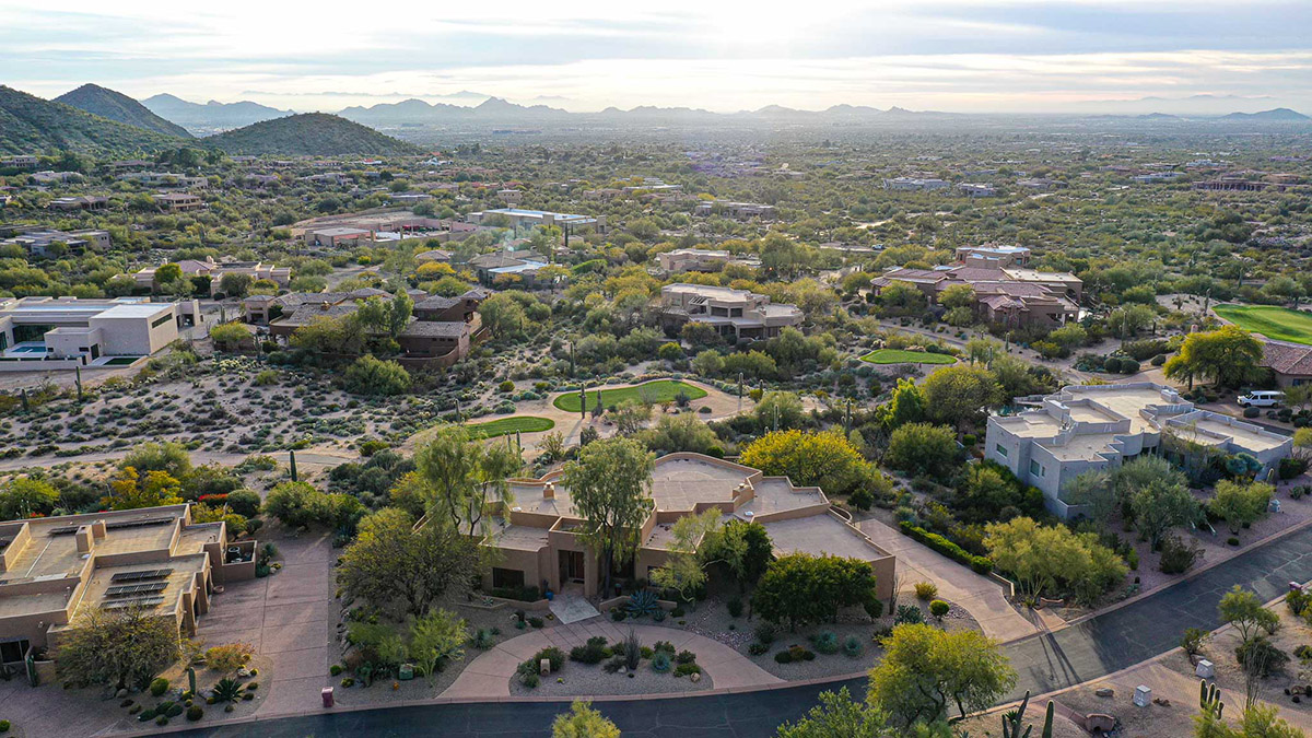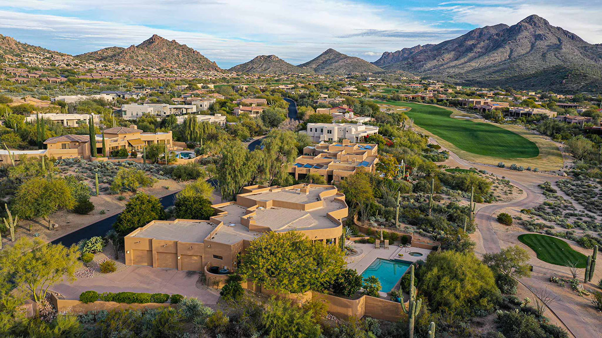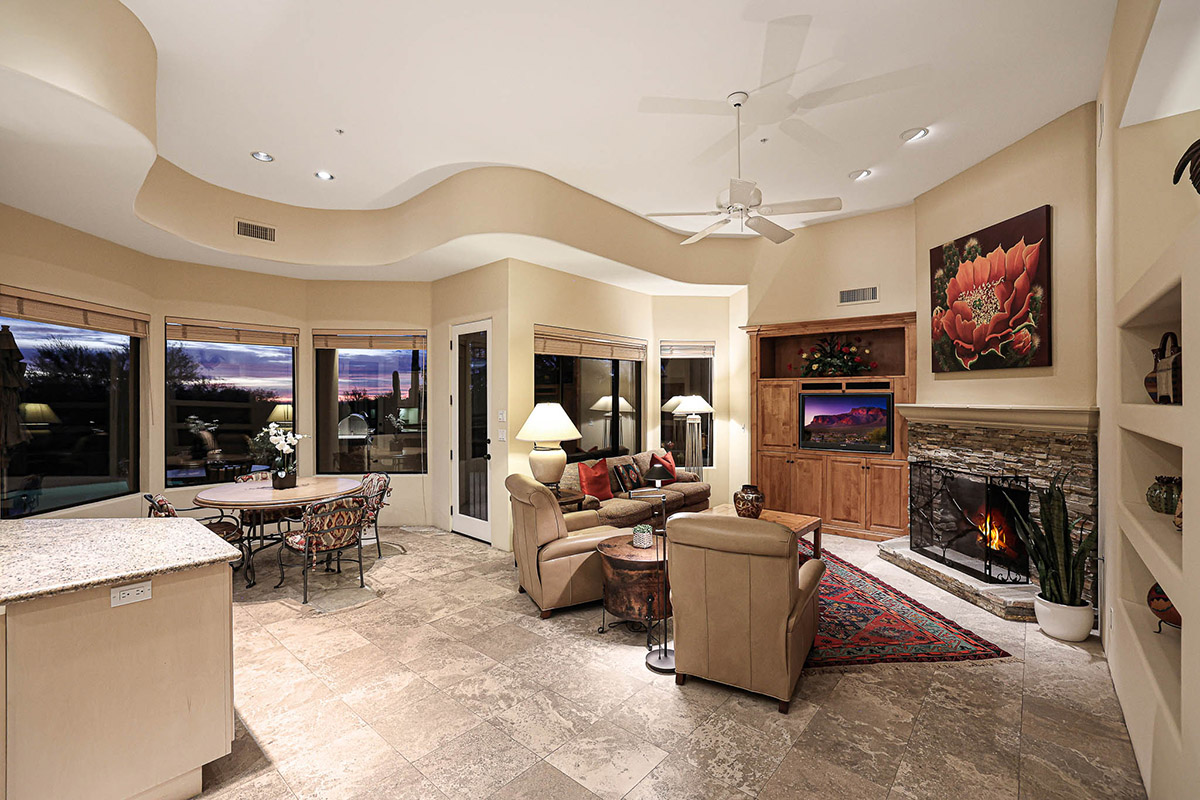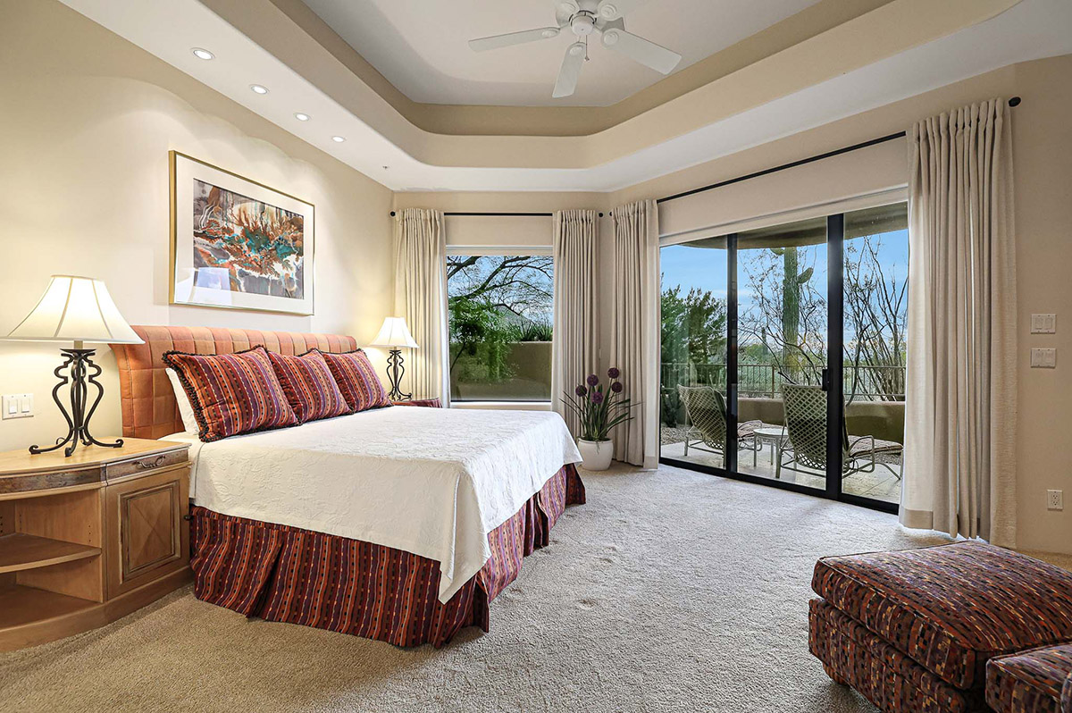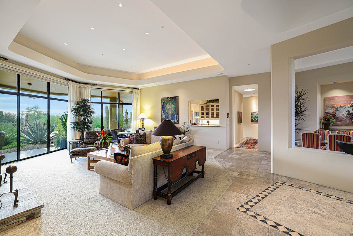Beautiful Southwest Contemporary inspired home in guard gated Glenn Moor at Troon Village is ready for the next homeowner! Enjoy views of Troon Mountain and Pinnacle Peak from the front and McDowell mountains out the back from this well positioned home. The southern exposure backyard has a large covered patio for multiple lounge and dining spaces, a large rectangular heated lap pool, separate spa, travertine and cool deck surfaces, and mature landscaping including fruit trees. Pride of ownership from the original owners is showcased throughout the 4,242 square feet of well laid out living space. The primary suite features a large walk-in closet with built-ins, exterior access, and a spa-like bath with soaking tub, dual vanities, separate shower, and a private water closet with bidet.