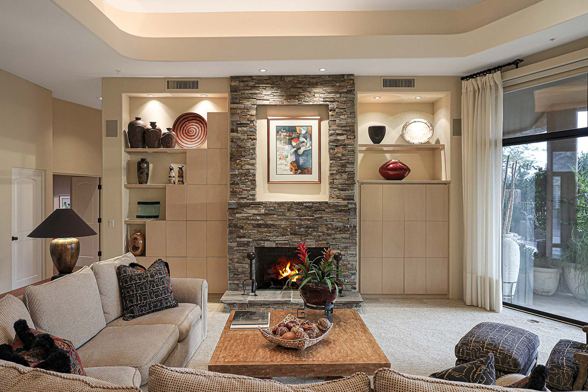 The heart of the home is the living and dining spaces, with large view windows, centerpiece stacked stone gas fireplace, entry foyer, and overlooks the wet bar leading to the kitchen. The open kitchen and family room space is flanked by a breakfast nook overlooking the backyard and a cozy gas fireplace in the family room. Stainless steel appliances, center island, wet bar with wine fridge, walk-in pantry, and ample cabinet and counter space are highlights of the kitchen.