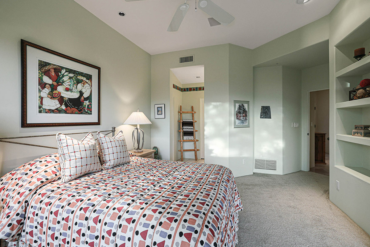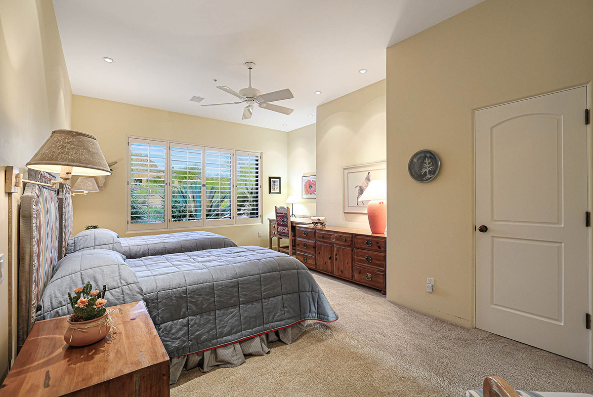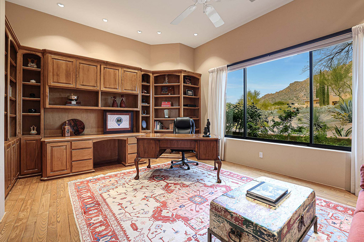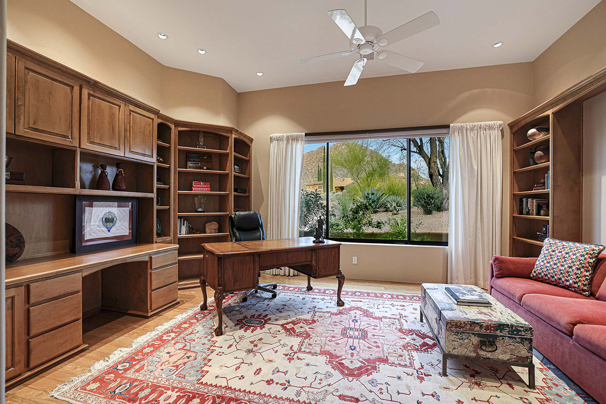 Adjacent to the primary bedroom is an office/den that could easily be used as an additional guest bedroom, with up close views of Troon Mountain, library built-ins and a closet.