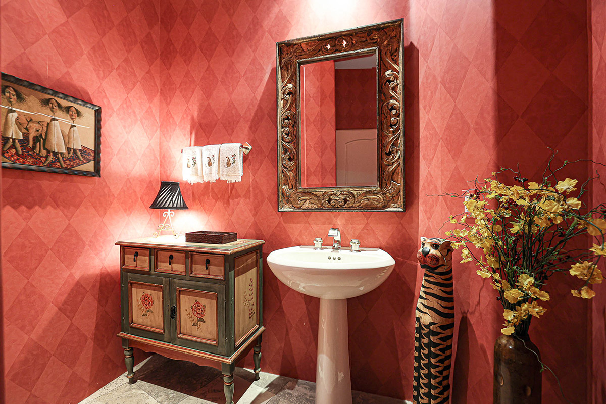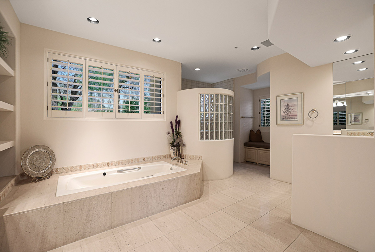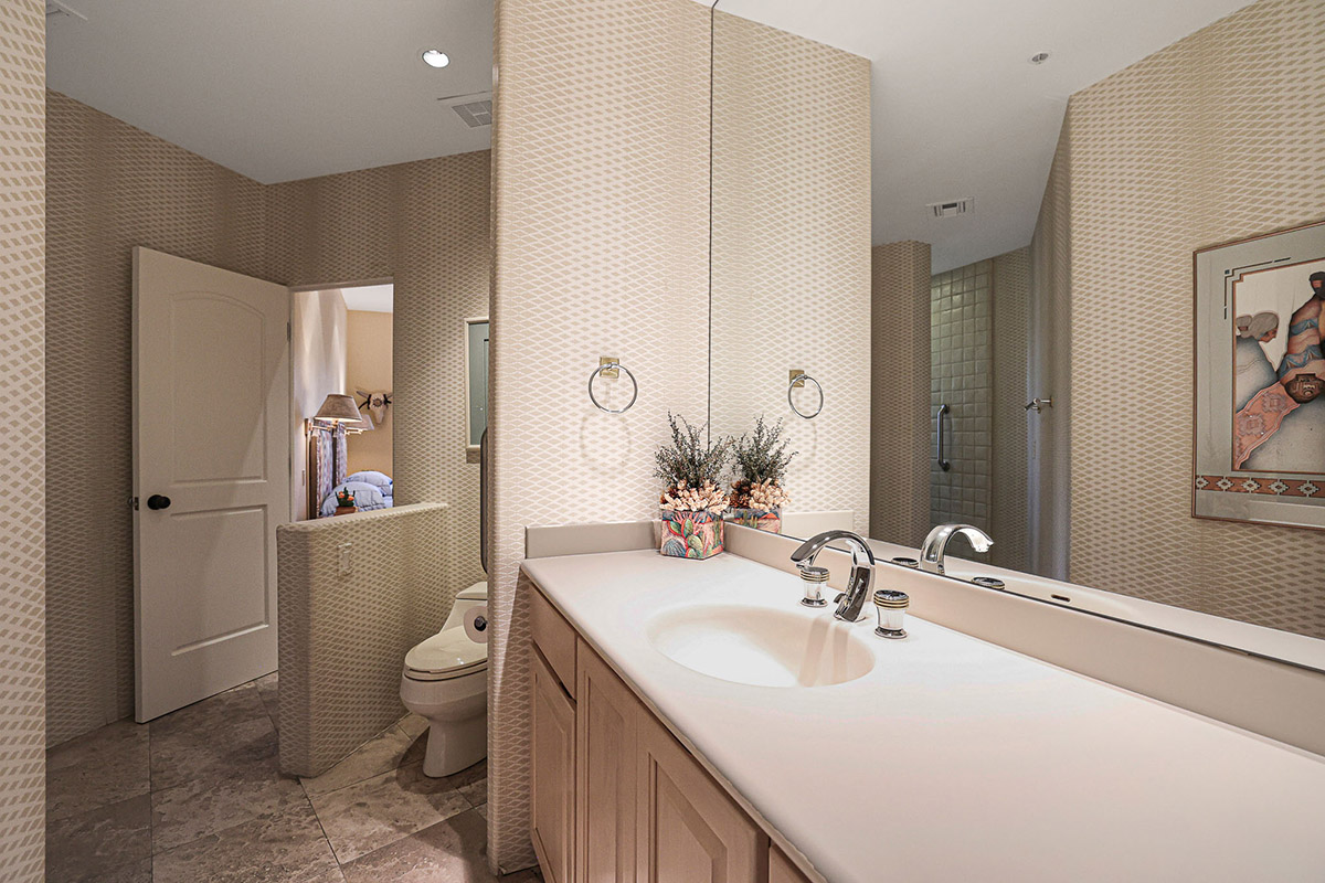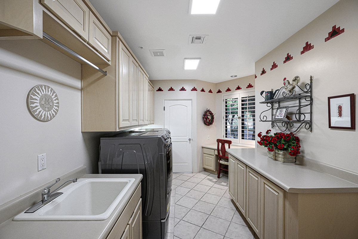 On the other wing of the home are two additional guest bedrooms. One designed as a junior primary suite with exterior access, and large bathroom also serving as a pool bath. The third guest room also has a walk-in closet and a jack’n’jill bath opening to the hall. The laundry room has a built-in desk, views out front, and an additional storage room which served as a dark room for the owner. A three car side entry garage with epoxy floors and additional storage along with a half circle drive for guests complete this wonderful property!