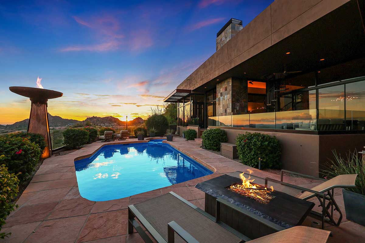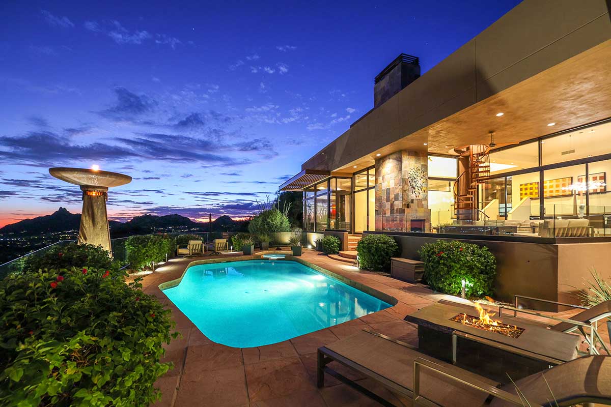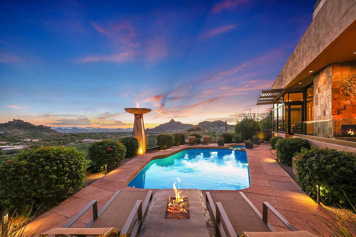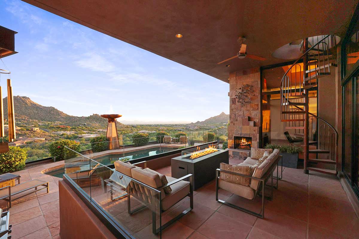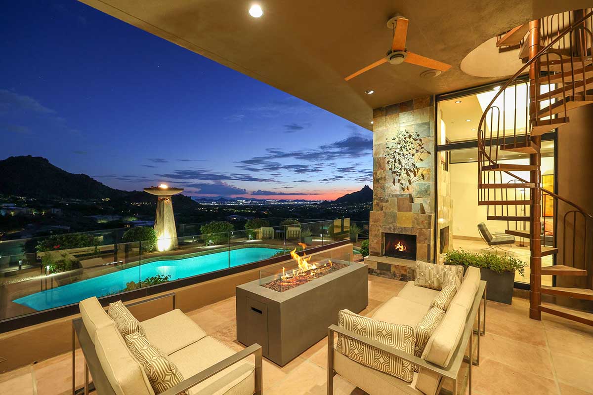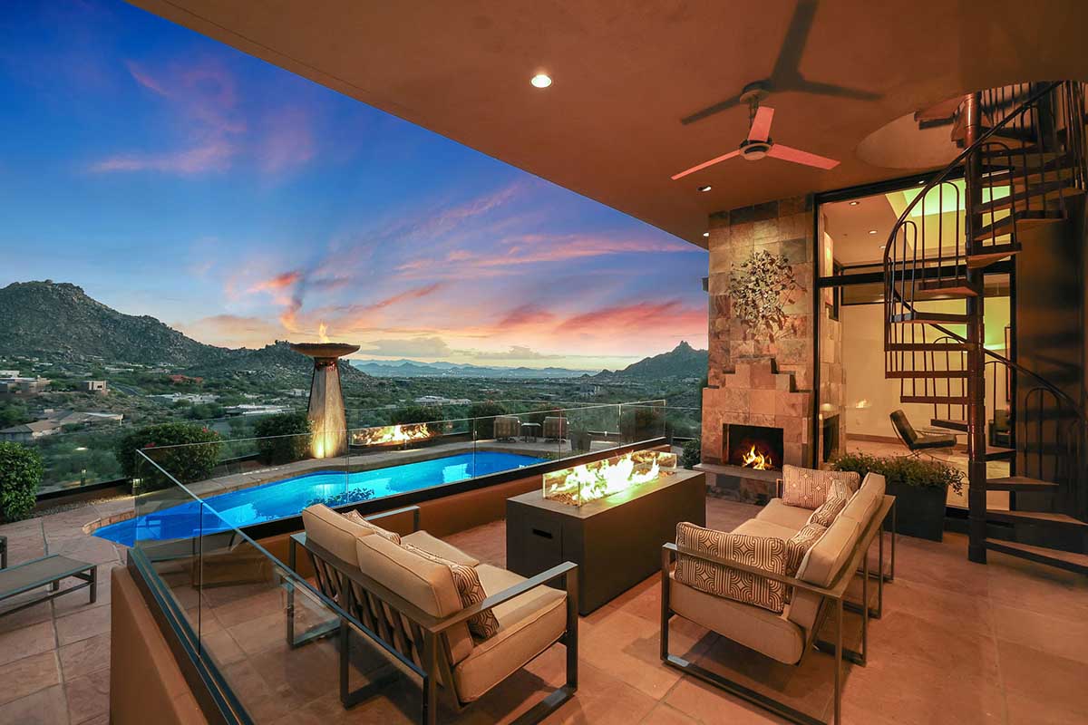 This exquisite Southwest contemporary estate is situated on 5.1 private acres in a stunning one-of-a-kind hilltop location. The home is accessed by approximately 2,000 feet of paved private driveway bordered by elegant perimeter fencing. Rarely does an opportunity to own such a premier home and lot become available which includes nearly 360° unobstructed panoramic views of Pinnacle Peak, city lights, the Four Peaks, Troon Mountain, Piestewa Peak, the Superstition Mountains, Tonto Hills, and Black Mountain.