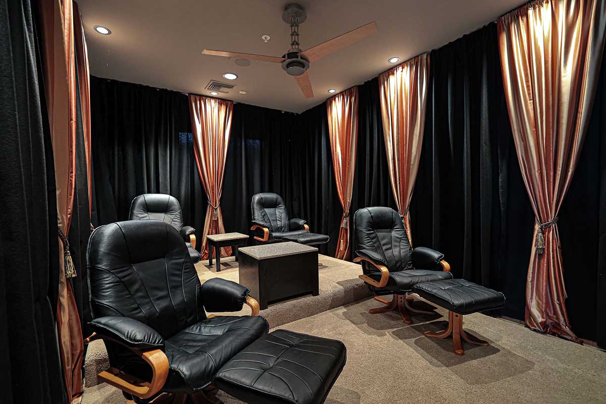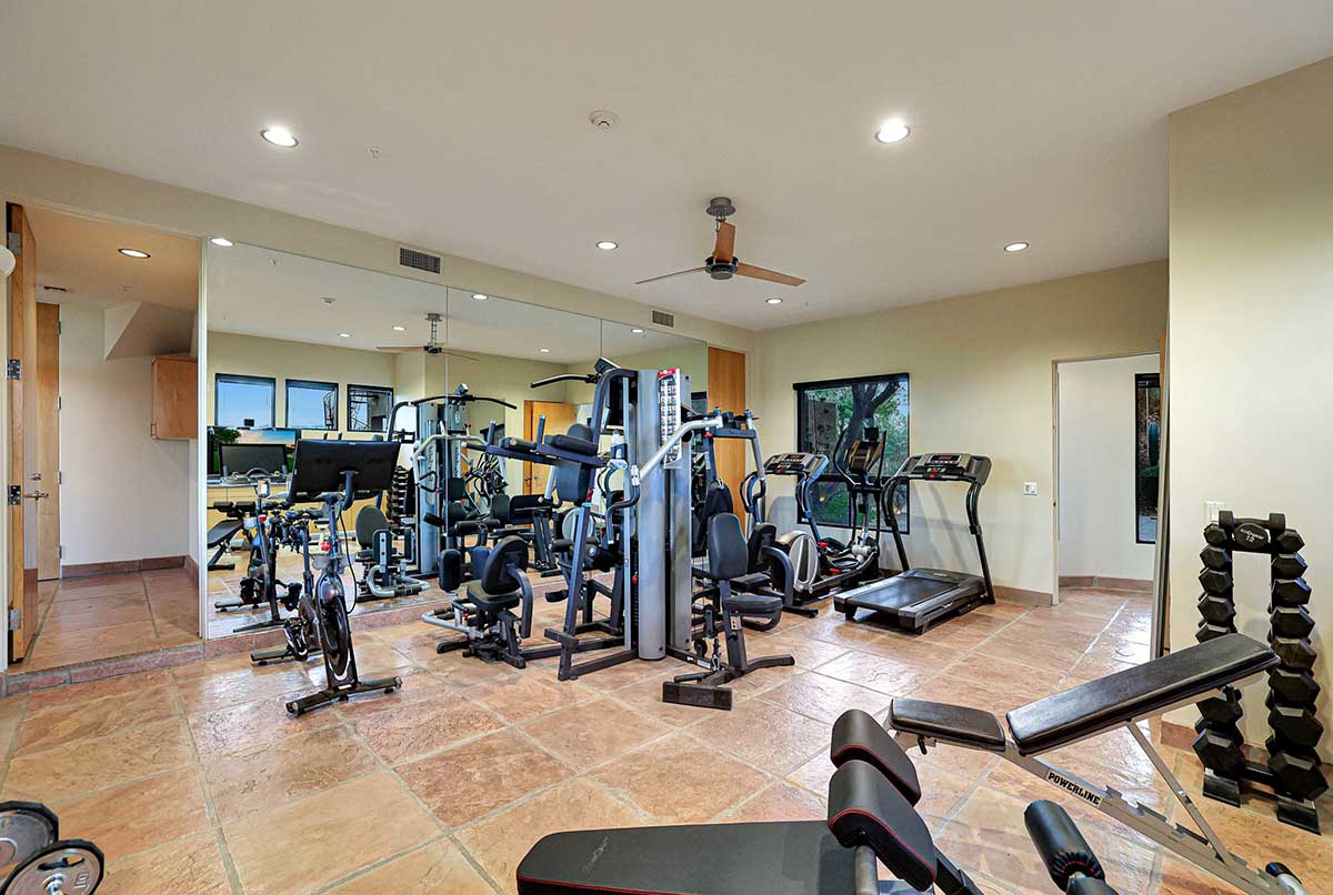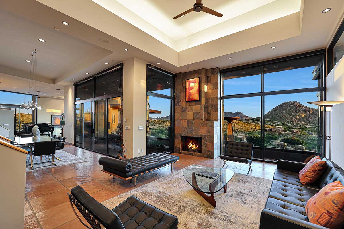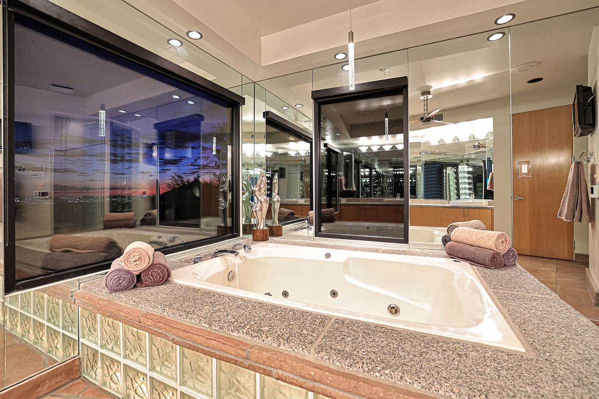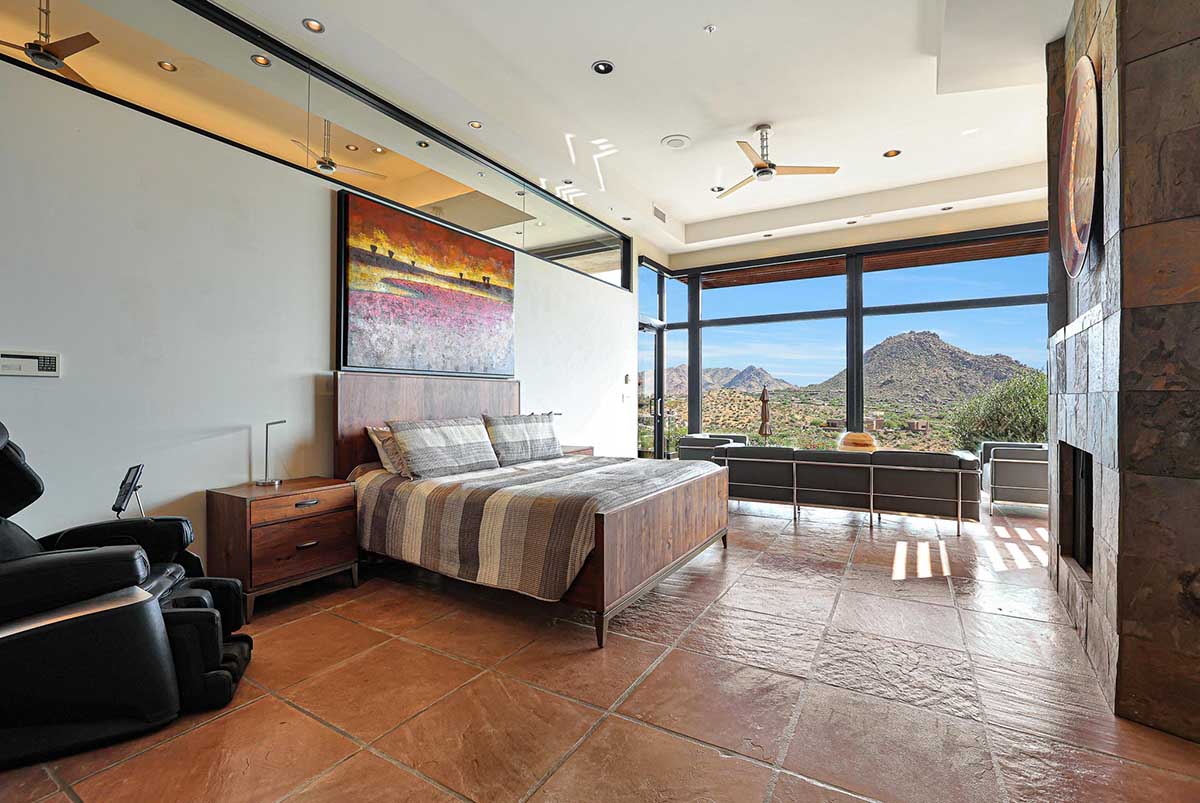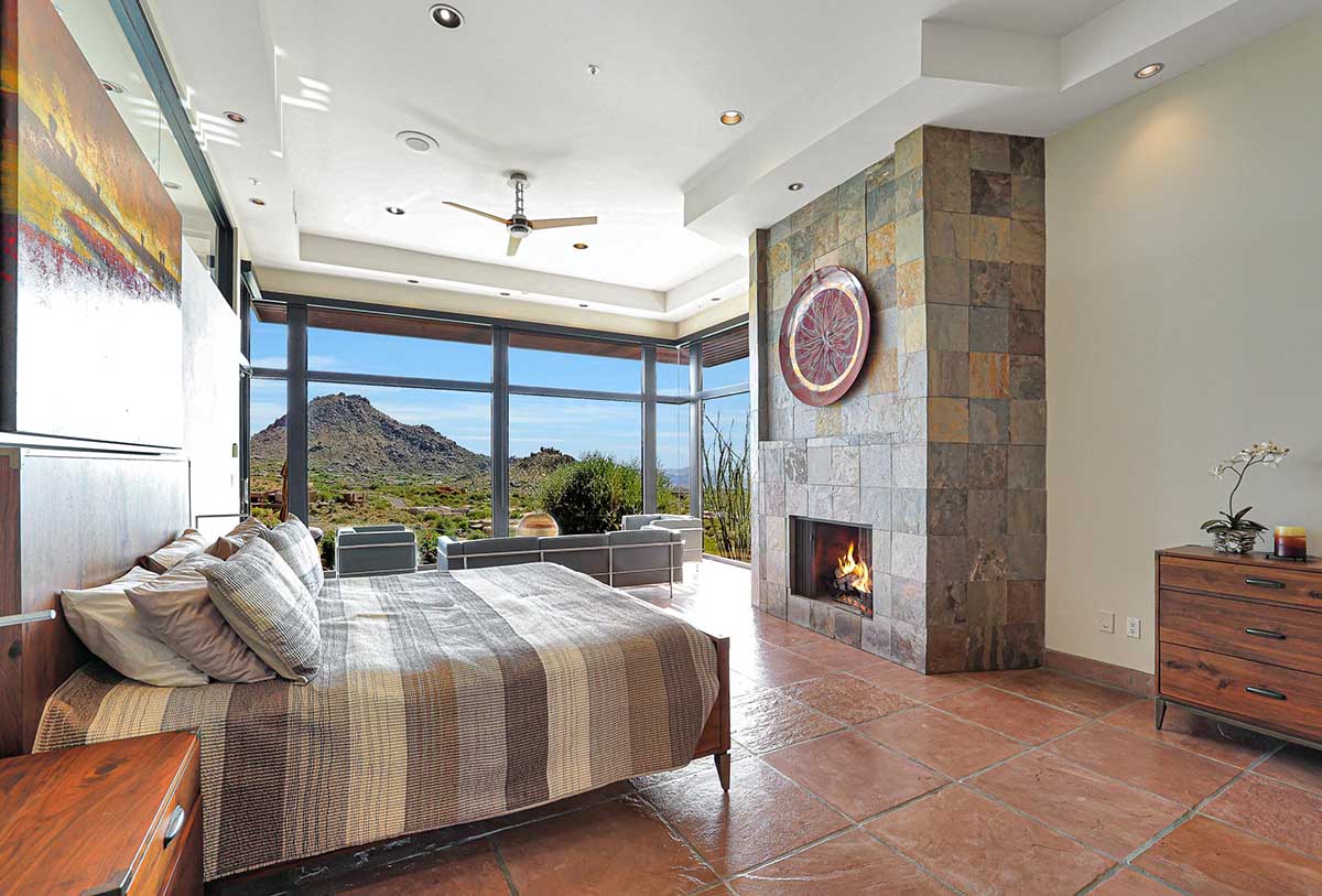 The master suite is positioned to highlight the amazing views with soaring ceilings, floor to ceiling glass walls, centerpiece fireplace and an ensuite bath with natural stone finishes, oversized corner tub, commercial grade Amerec wet sauna, walk-in closet and private water closet.
