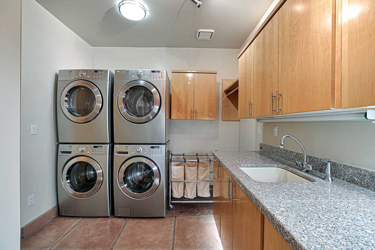 The attached guest quarters can be accessed privately as well as from the main home and include a complete kitchen, bedroom/bath, stackable washer/dryer, extended balcony, and security system; a great retreat for extended family or nanny’s quarters. The four-car extended bay garage has a full bathroom, temperature control (cooling) system, aluminum, dual pane glass automated doors, epoxy floors, aluminum/steel workbench and storage, and an extra garage door at the back of garage opens to large covered/open storage behind the garage.