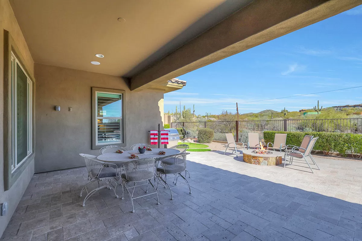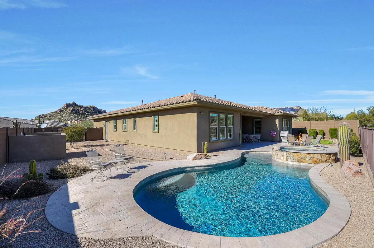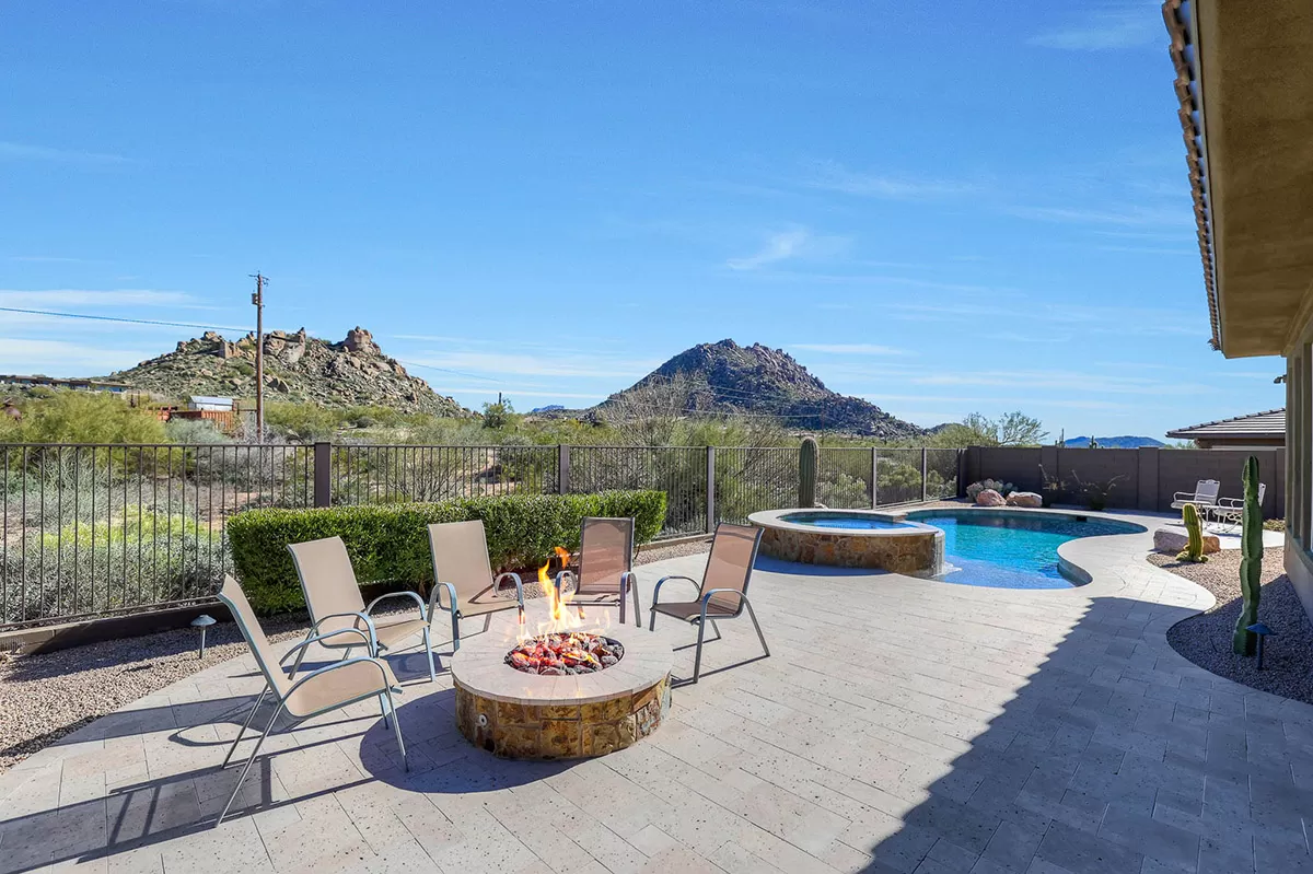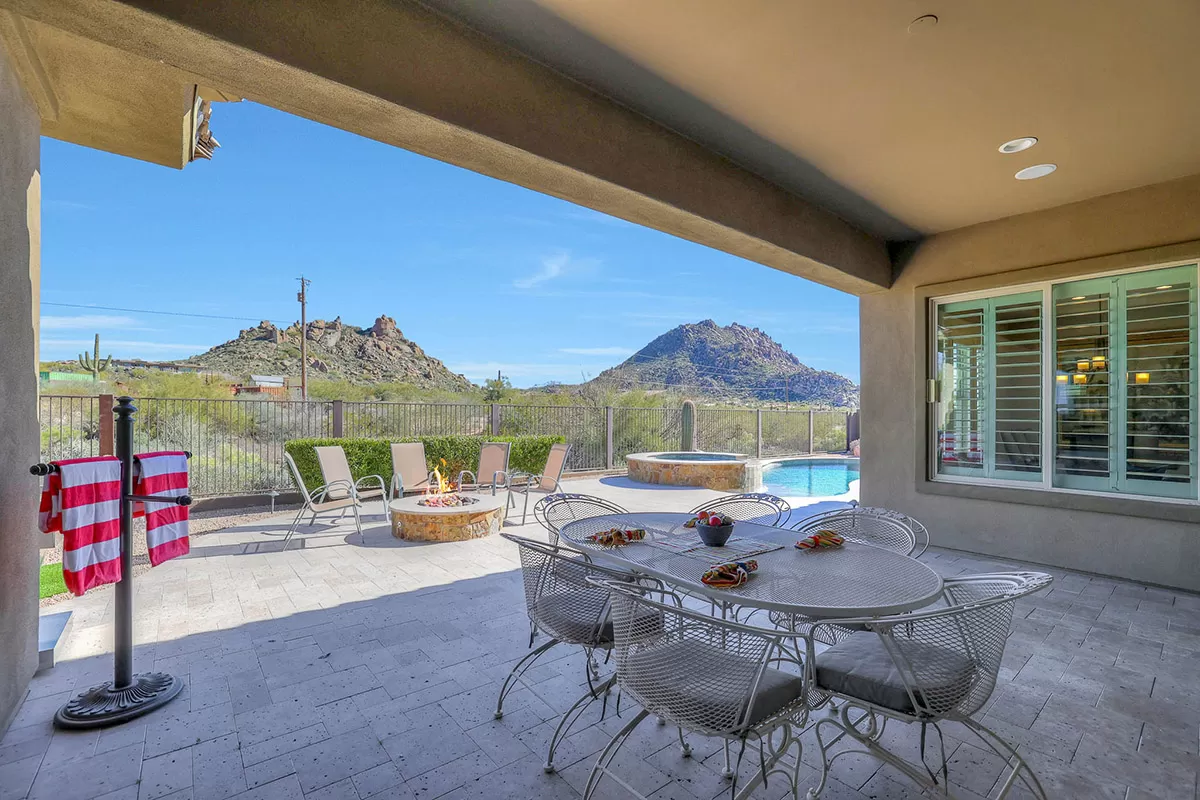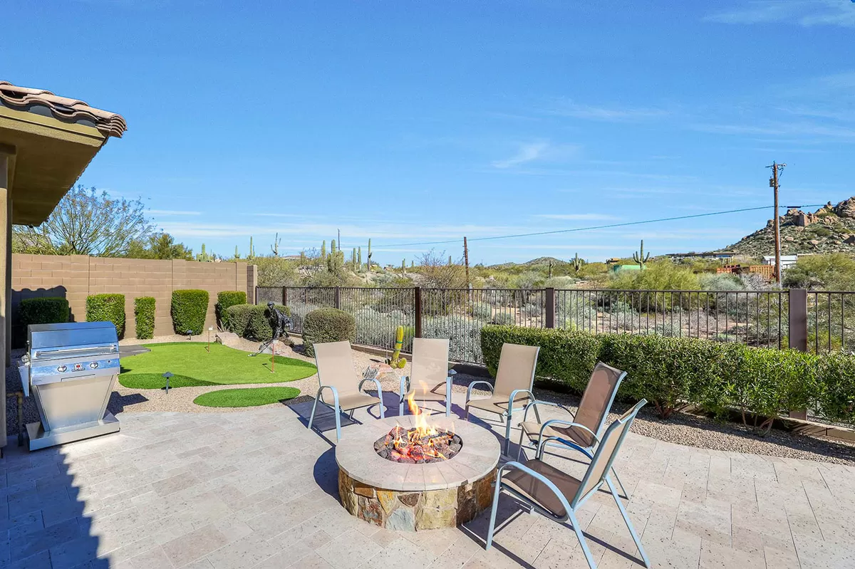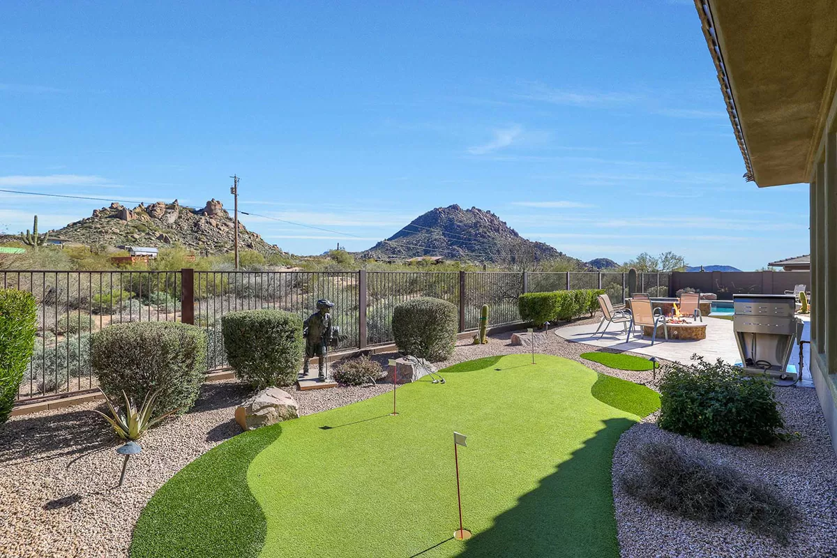 Step outside and you’ll find a true oasis in your own spacious, open backyard. The pool with an elevated spa is the centerpiece of the space, surrounded by low maintenance landscaping and plenty of room to lounge and soak up the sun. The covered patio is the perfect spot for outdoor dining and entertaining and has Eastern afternoon shade. A three hole artificial turf putting green, firepit, and two large side yards round out the backyard with direct views of Troon Mountain and boulder formations.