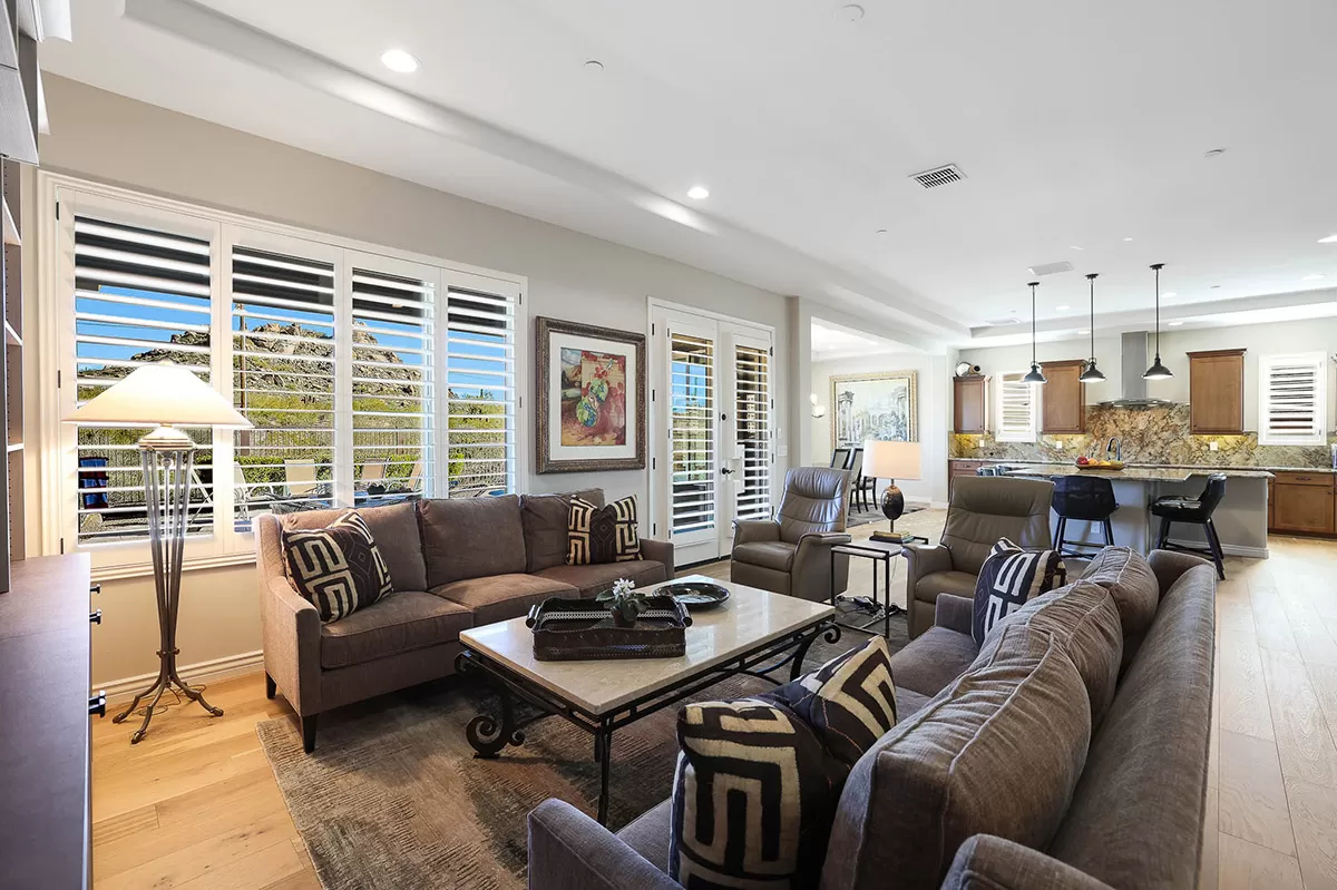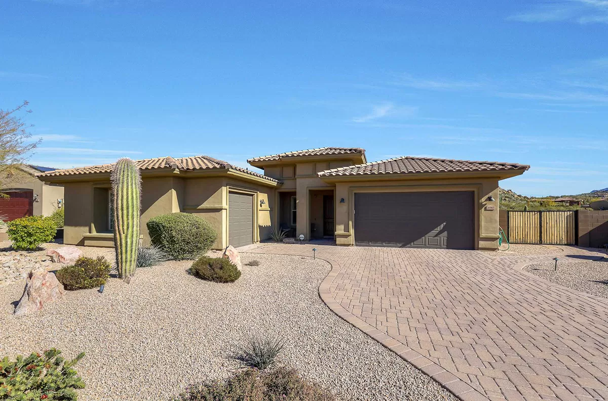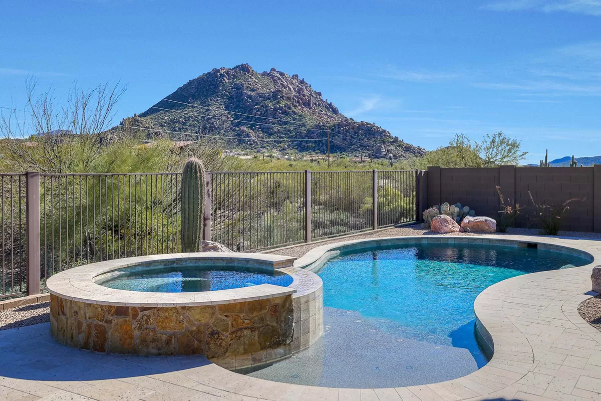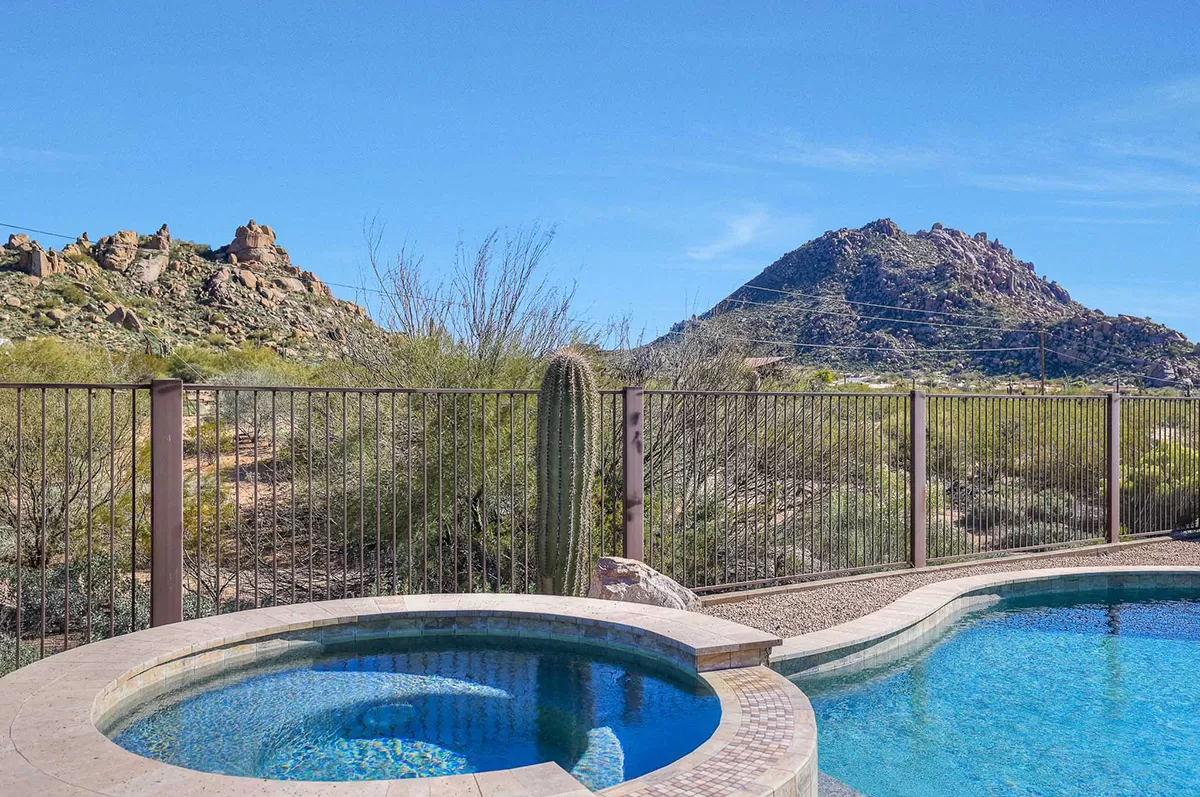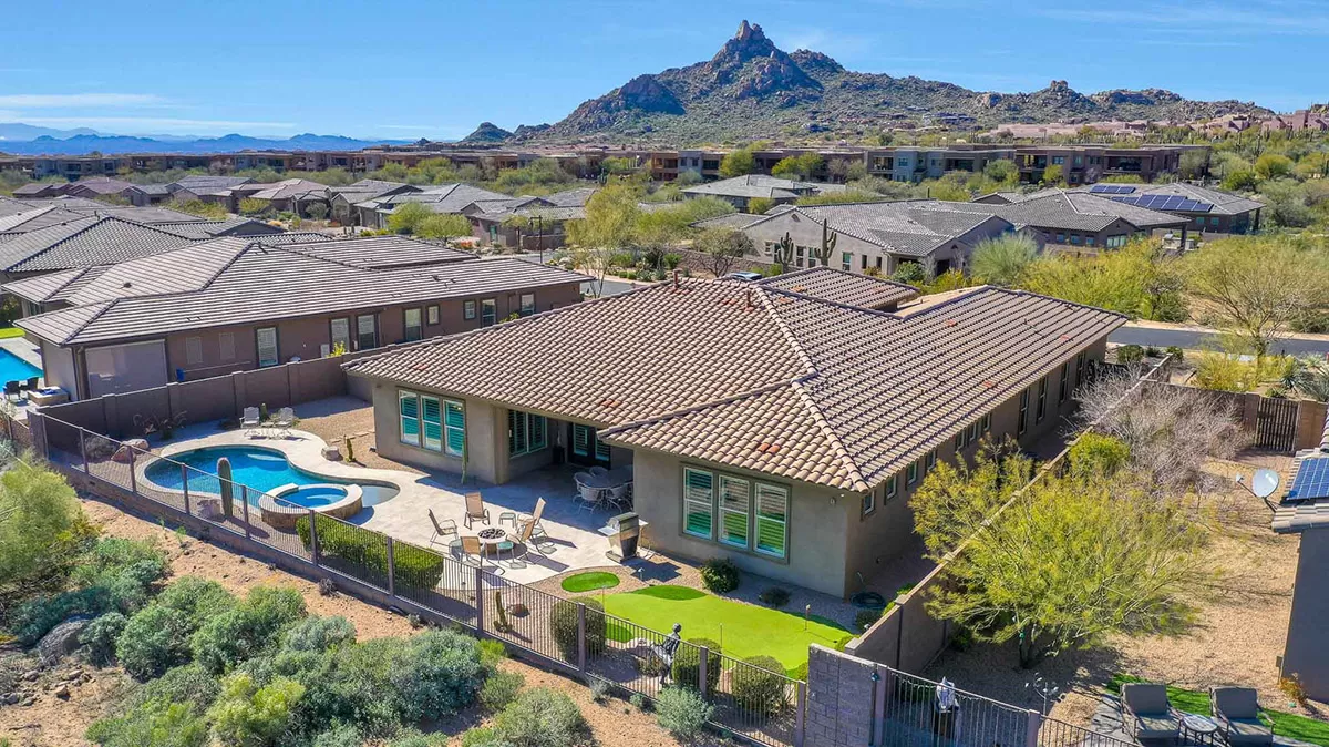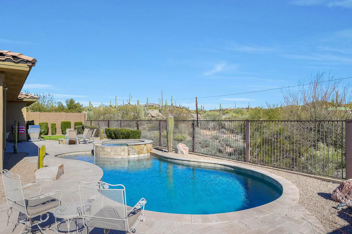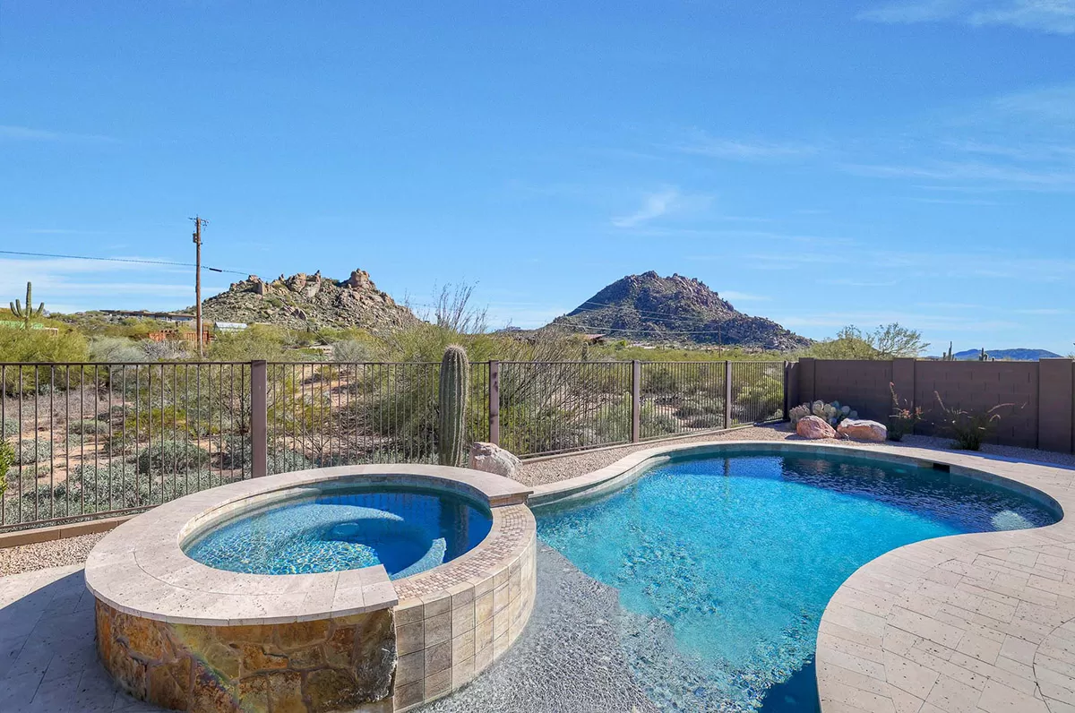 Step outside and you’ll find a true oasis in your own spacious, open backyard. The pool with an elevated spa is the centerpiece of the space, surrounded by low maintenance landscaping and plenty of room to lounge and soak up the sun. The covered patio is the perfect spot for outdoor dining and entertaining and has Eastern afternoon shade. A three hole artificial turf putting green, firepit, and two large side yards round out the backyard with direct views of Troon Mountain and boulder formations.