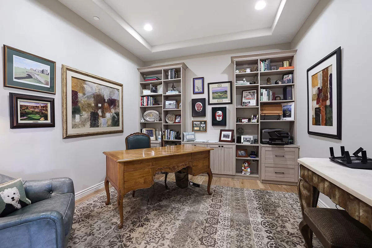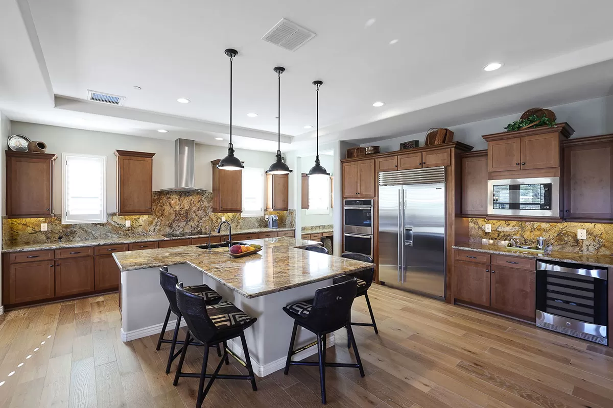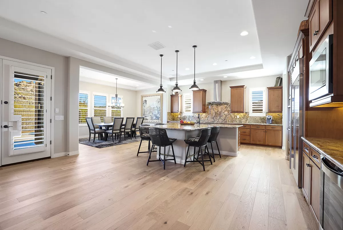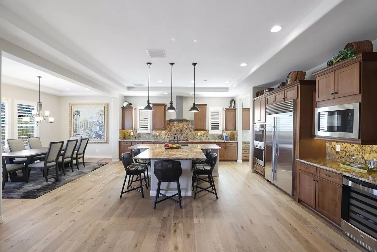 The kitchen is a cook’s dream, with granite counters and matching backsplash, stainless steel appliances including a built-in microwave, beverage fridge, cooktop and double wall ovens, and a large center island that doubles as a breakfast bar with plenty of seating. The adjacent dining room is perfect for hosting dinners. The garage entry leads to a large laundry room with sink, mud room entry, walk-in pantry and built-in desk with additional counter and cabinet space.