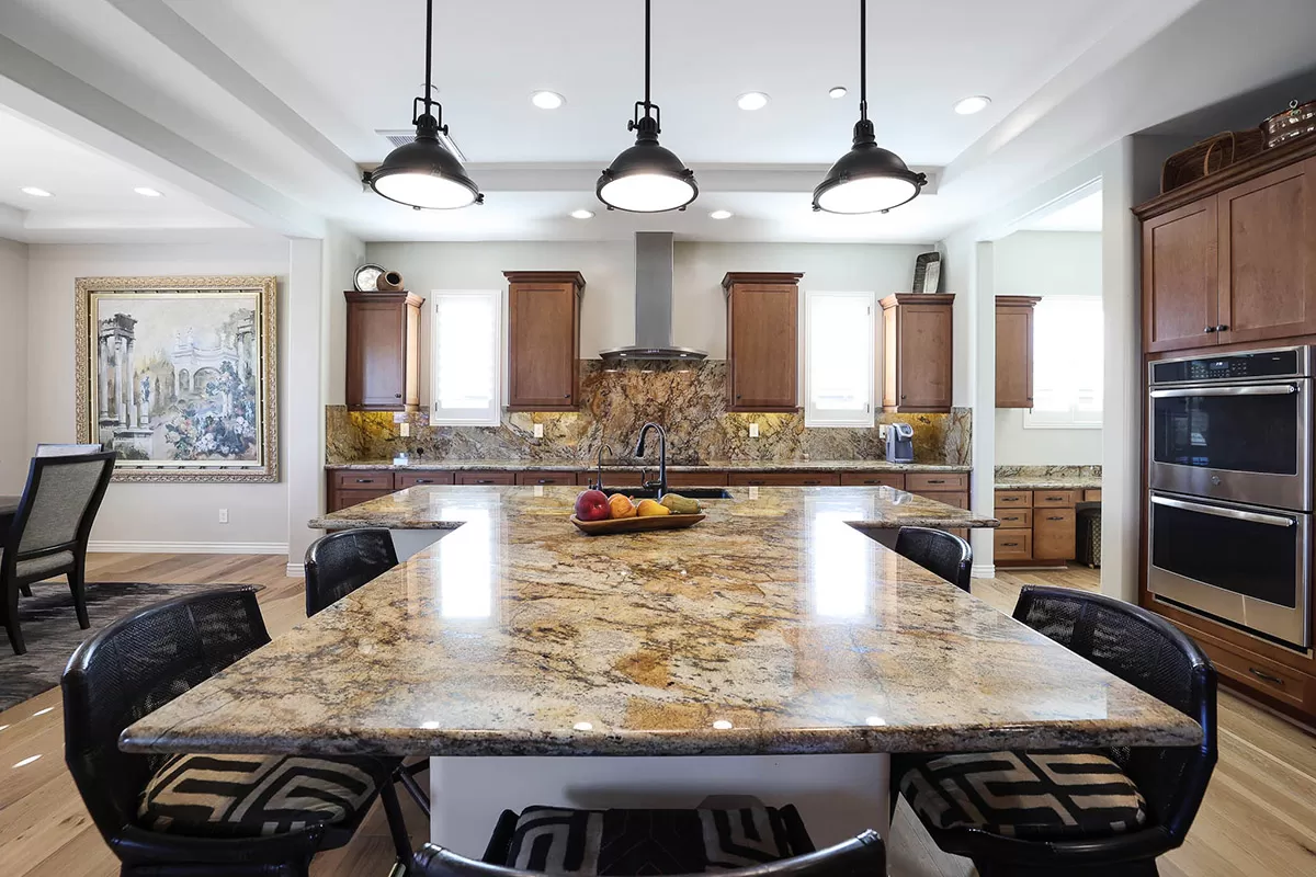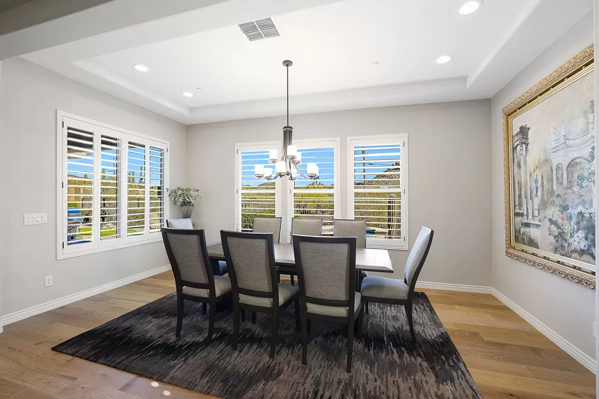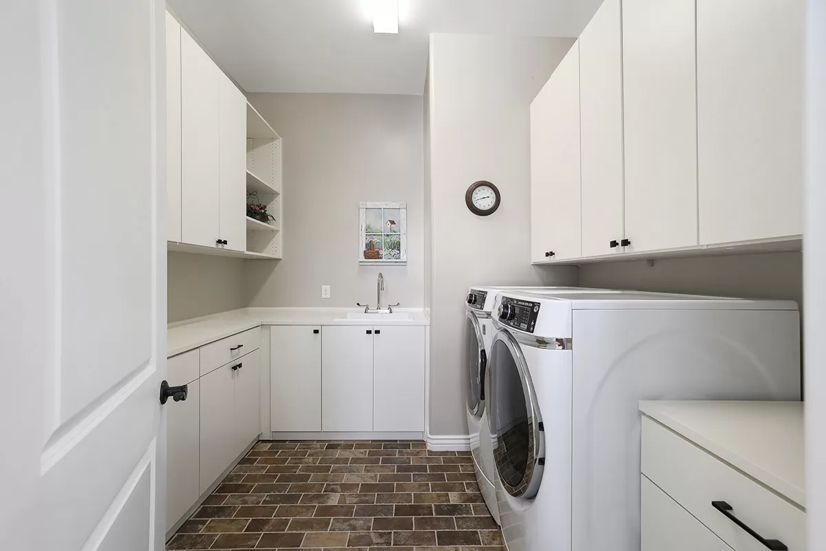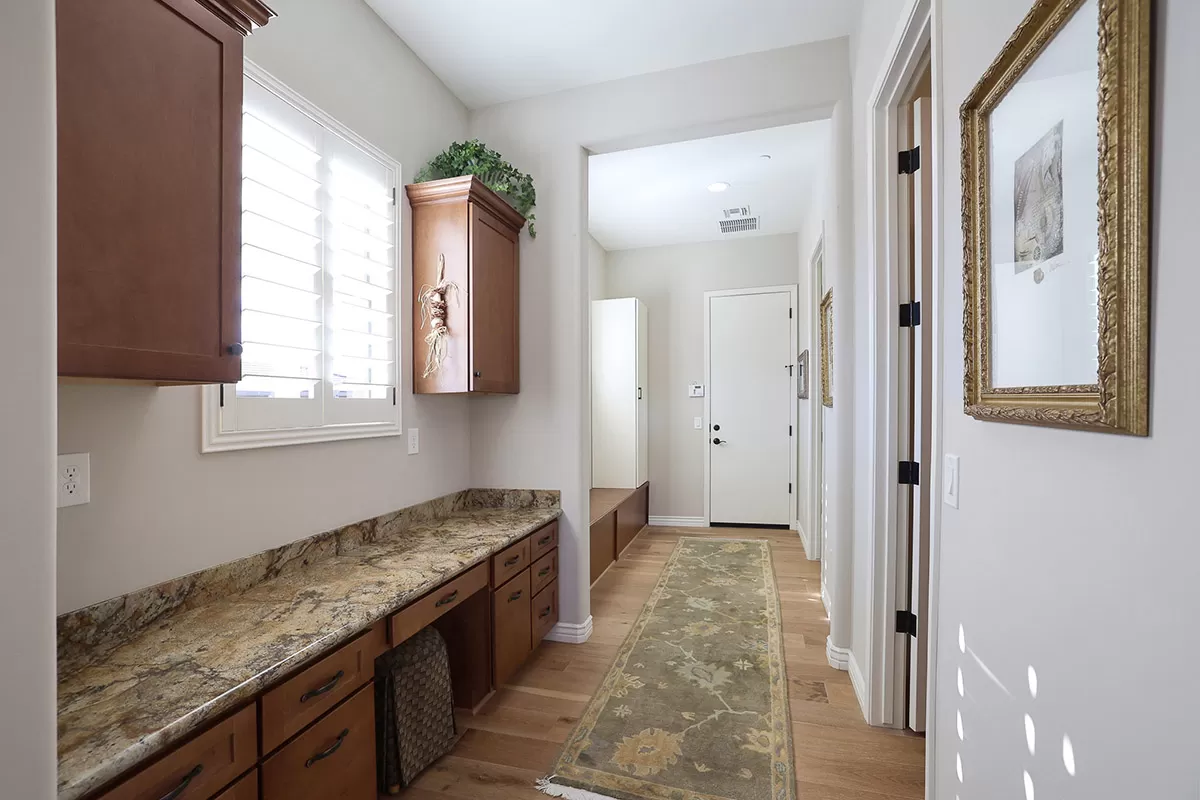 The kitchen is a cook’s dream, with granite counters and matching backsplash, stainless steel appliances including a built-in microwave, beverage fridge, cooktop and double wall ovens, and a large center island that doubles as a breakfast bar with plenty of seating. The adjacent dining room is perfect for hosting dinners. The garage entry leads to a large laundry room with sink, mud room entry, walk-in pantry and built-in desk with additional counter and cabinet space.