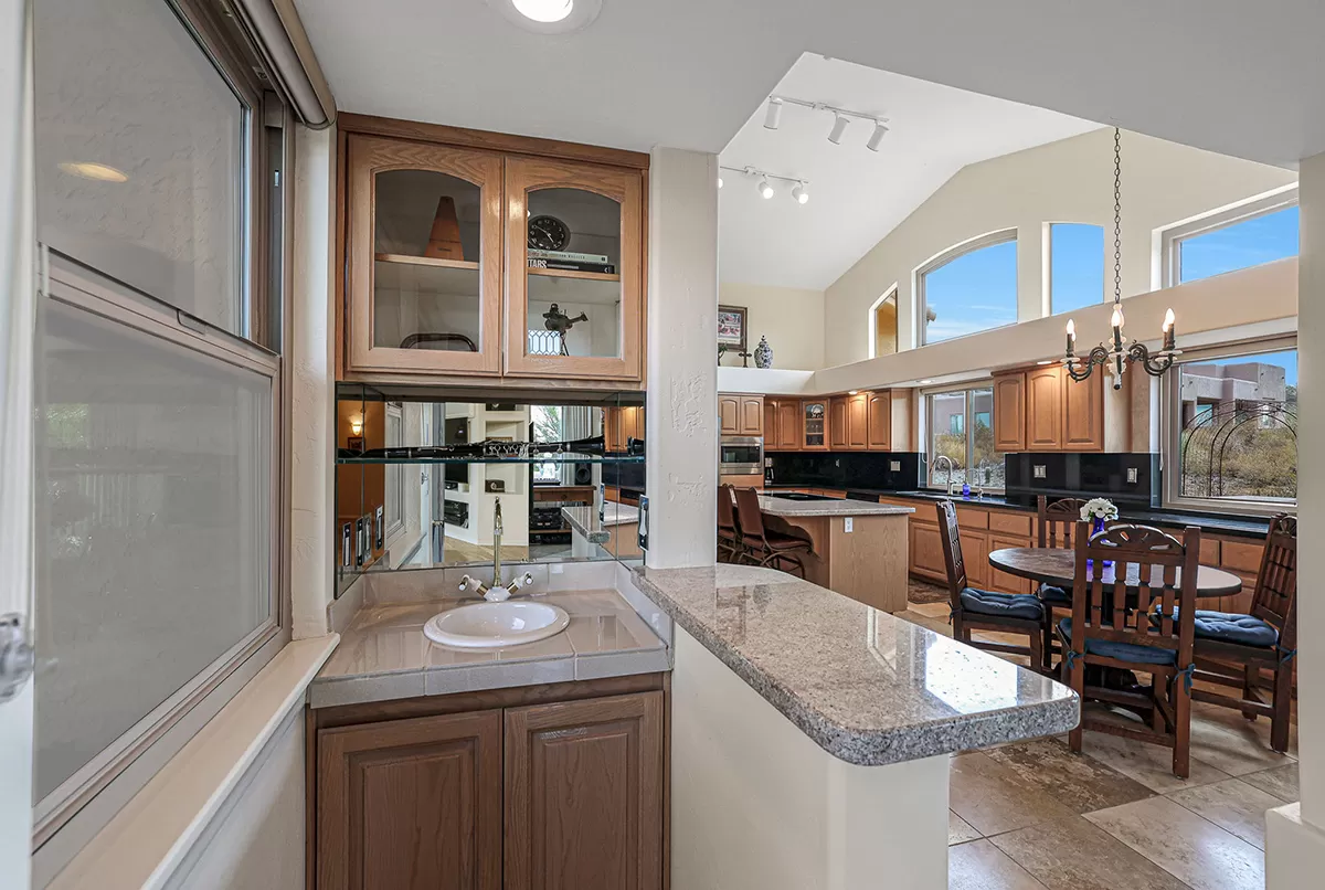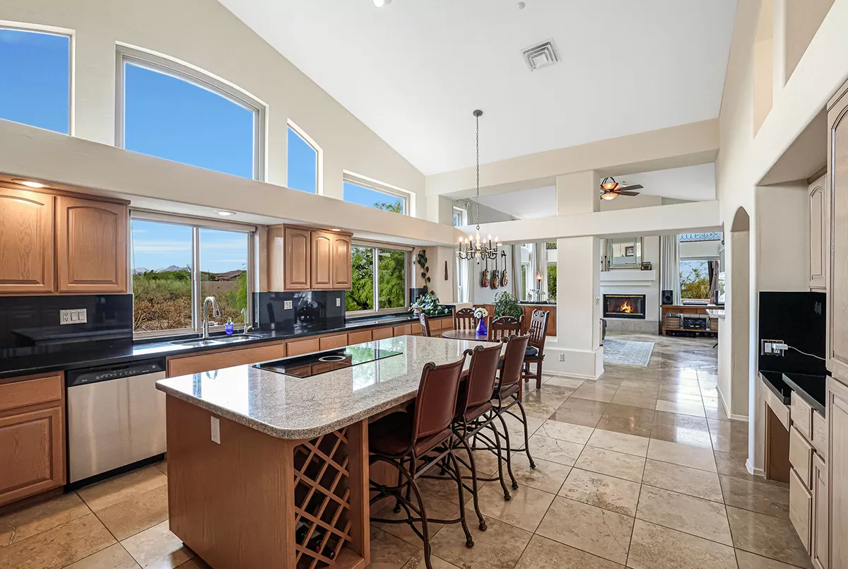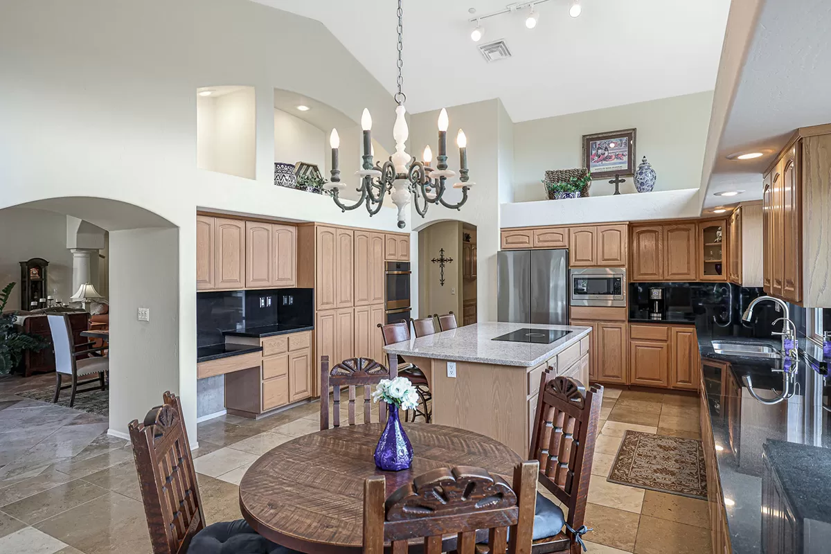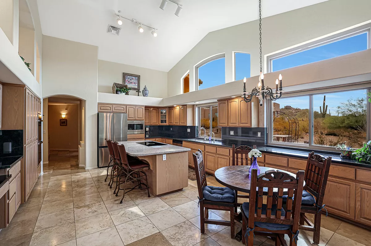The kitchen is light and bright with clerestory windows, granite counters, center island, and eat-in breakfast area. Culinary enthusiasts will delight in the state-of-the-art Italian induction cooktop with downdraft venting as well as a new microwave, double convection oven, and refrigerator installed in 2023.