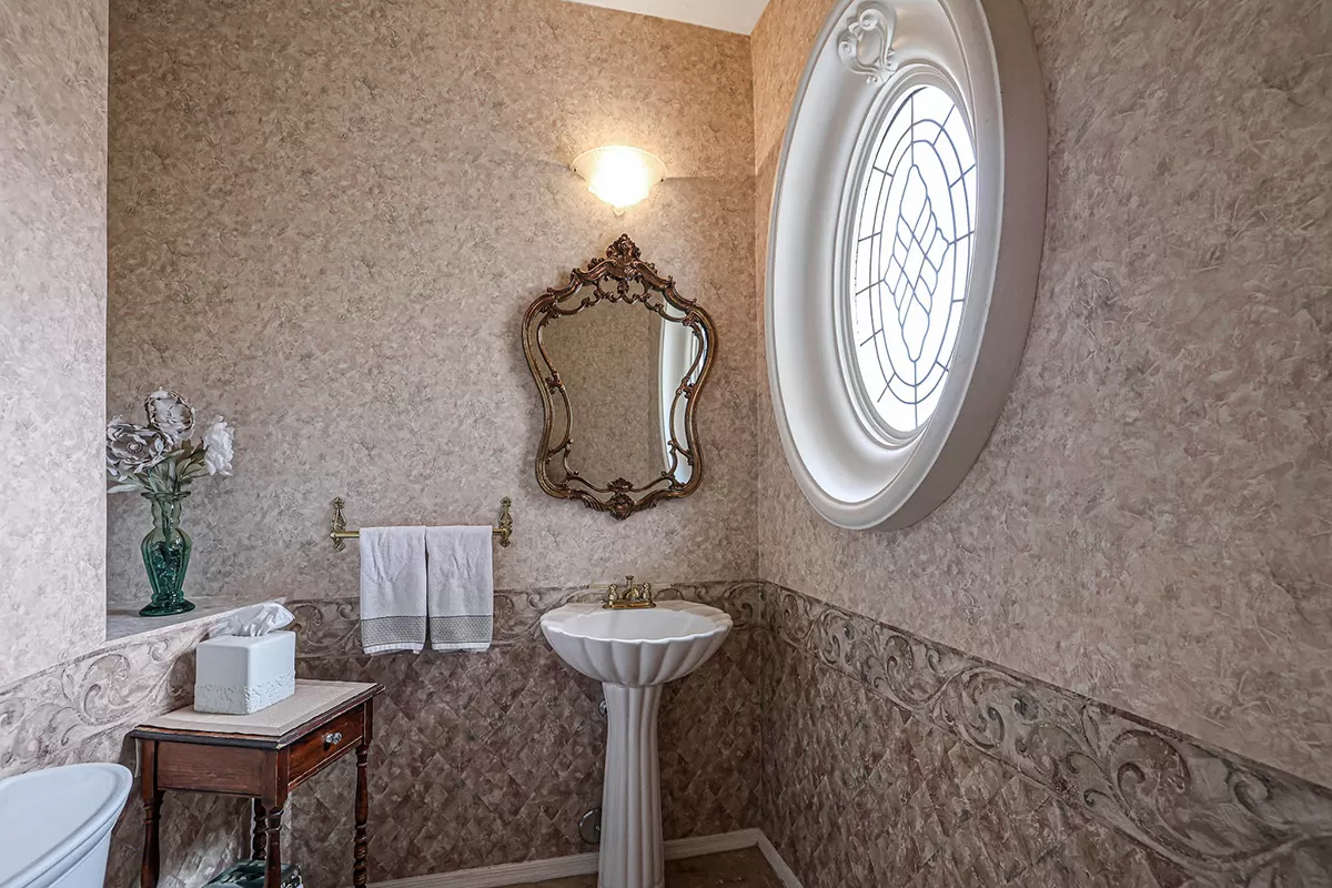 Other living spaces include the family room (open to the kitchen and breakfast area), formal living/dining spaces, private office overlooking the winding driveway (with closet!), primary bedroom with ensuite bath, two guest rooms, a hall bath with exterior pool access, and a powder bath for guests.