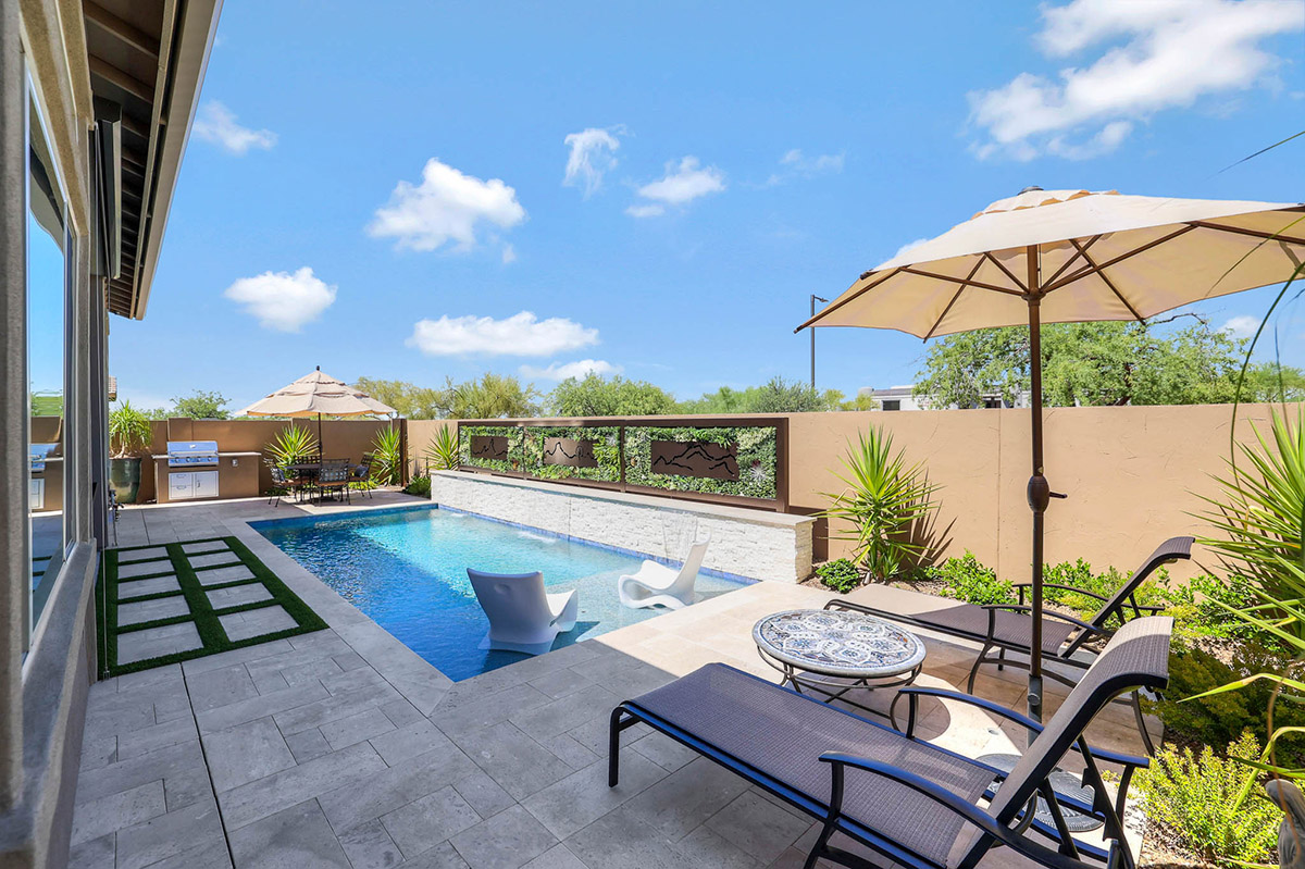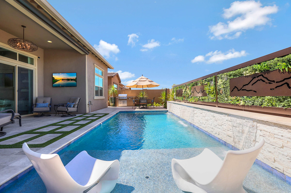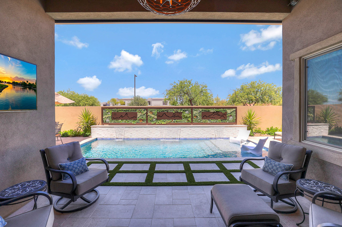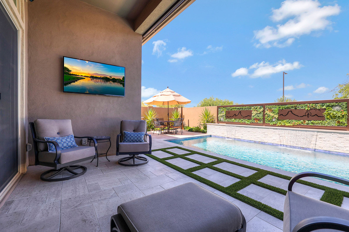 The backyard serves as a haven of relaxation, designed for low-maintenance enjoyment. Its inviting hardscape surroundings provide the ideal setting for leisure, while a sparkling pool with a soothing water feature creates a serene ambiance. Additionally, an exterior TV is thoughtfully placed under the covered patio, allowing for outdoor entertainment and enjoyment.