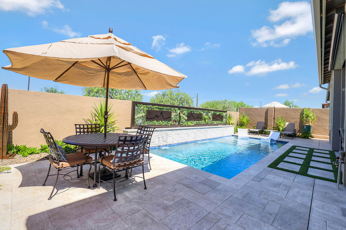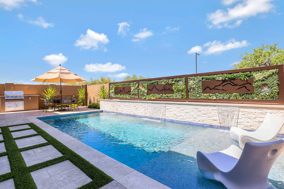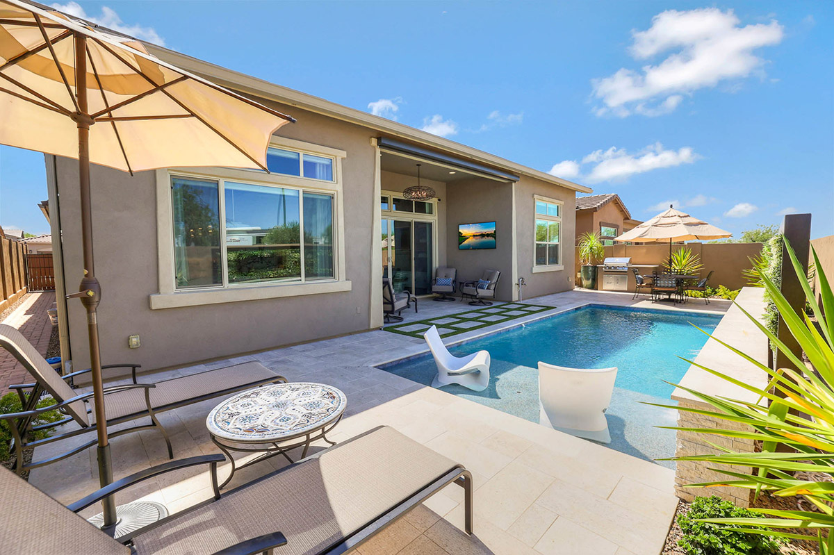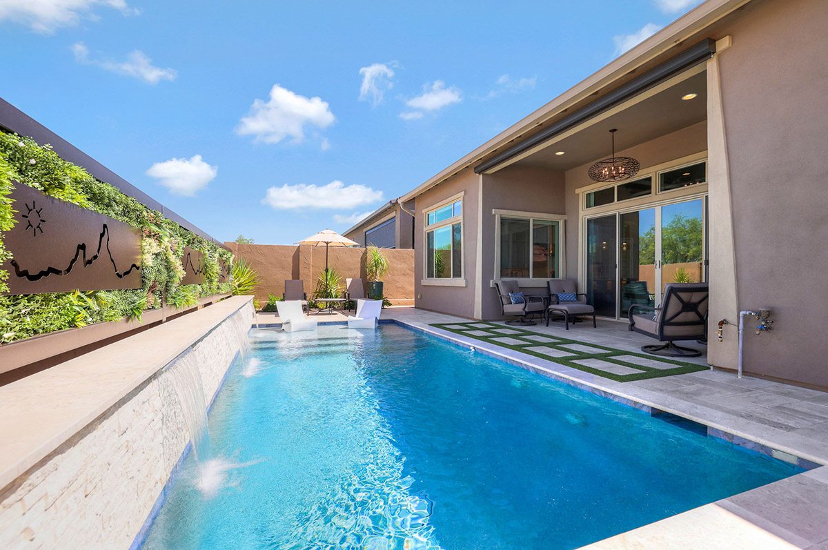 The backyard serves as a haven of relaxation, designed for low-maintenance enjoyment. Its inviting hardscape surroundings provide the ideal setting for leisure, while a sparkling pool with a soothing water feature creates a serene ambiance. Additionally, an exterior TV is thoughtfully placed under the covered patio, allowing for outdoor entertainment and enjoyment.