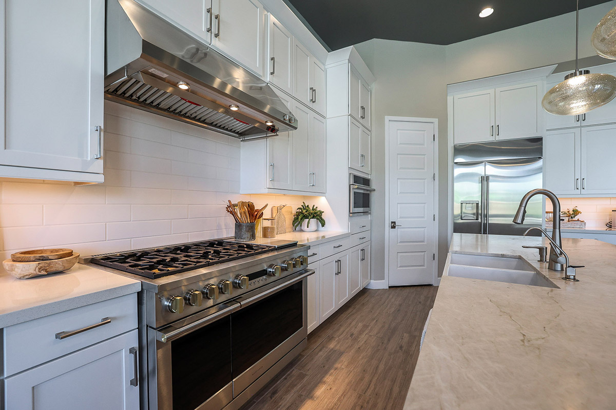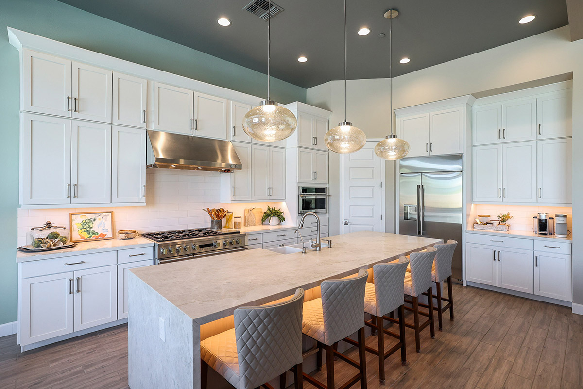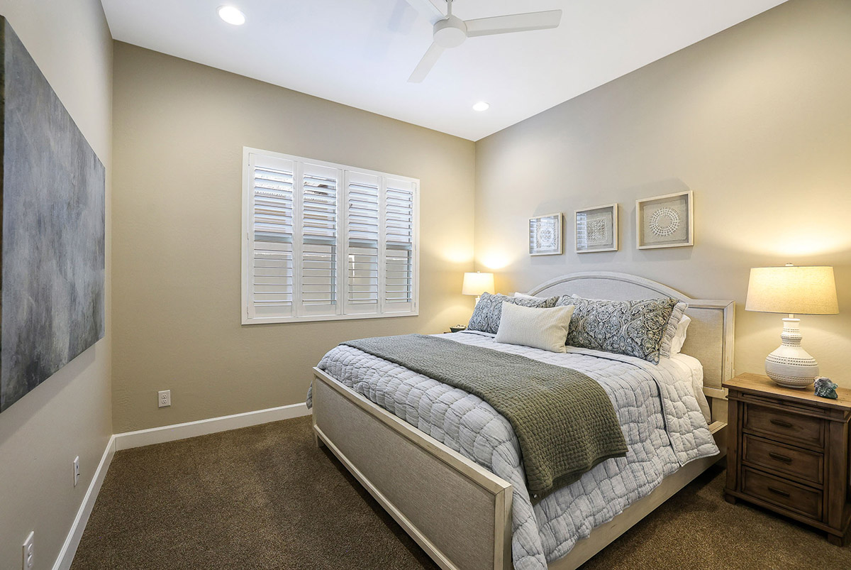 The kitchen exudes elegance and practicality with stainless steel appliances, a spacious center island, white cabinetry, and a walk-in pantry, catering to the culinary enthusiast. Custom electronic shades grace the great room, enhancing privacy and light control. Each sleeping space features plantation shutters.