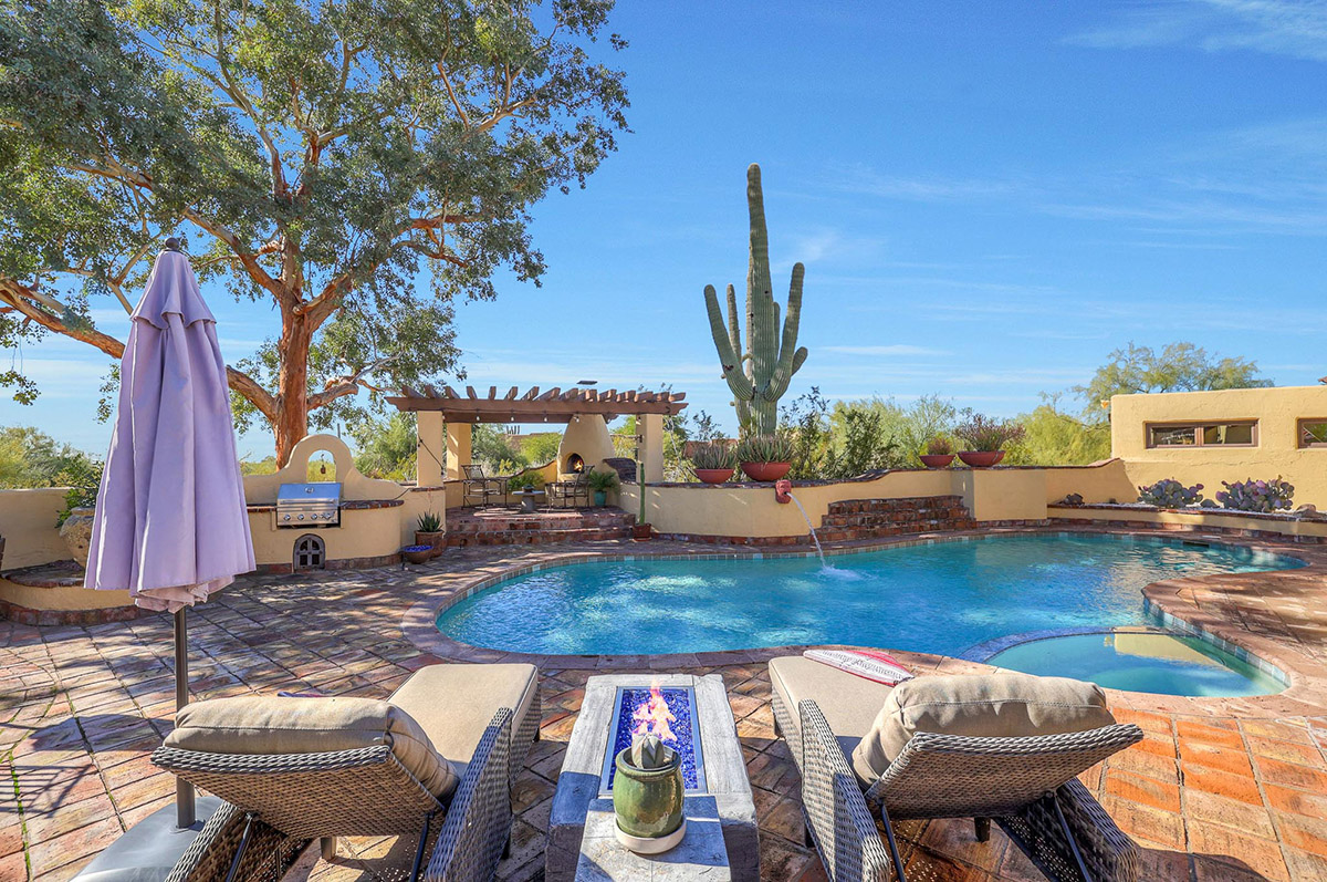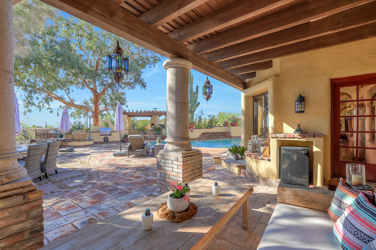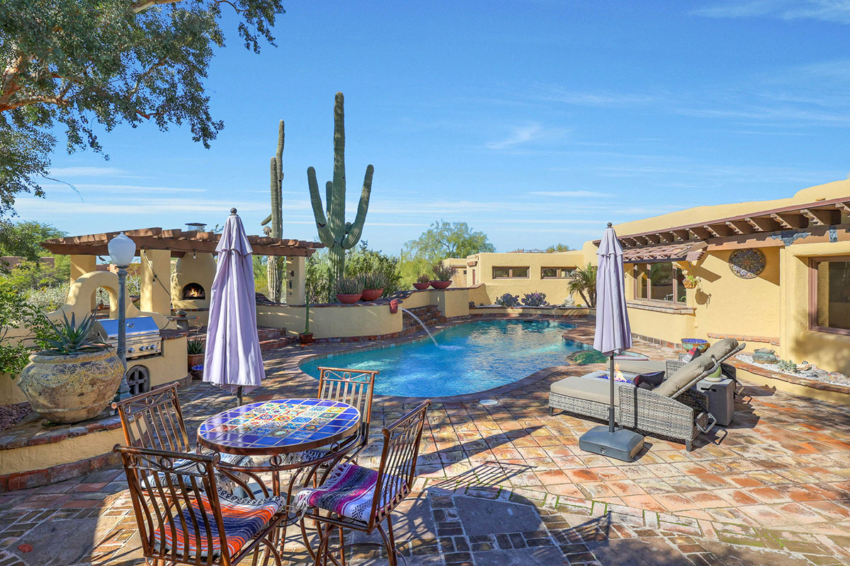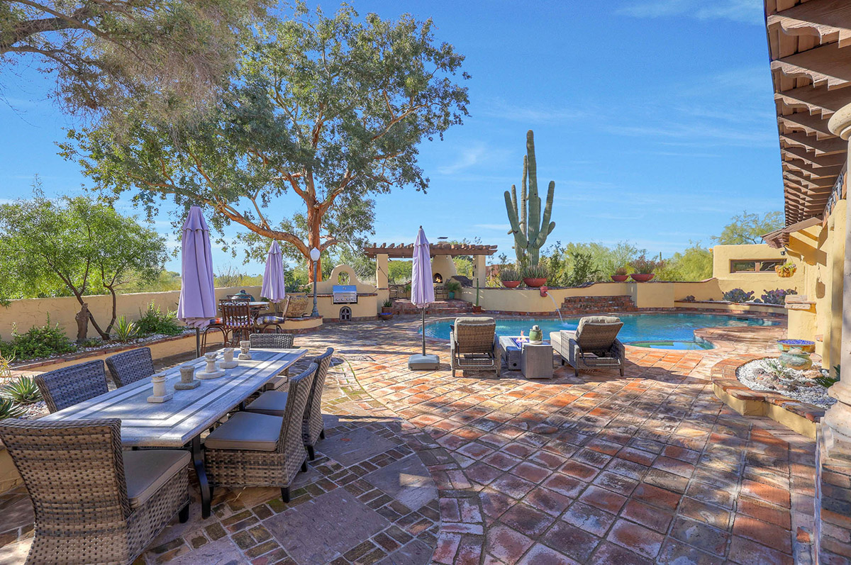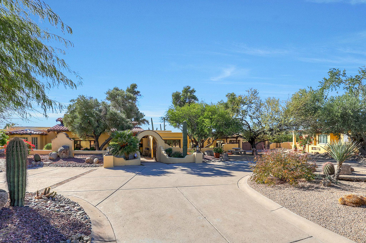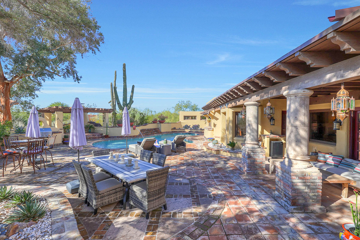 Spacious 2.4 acre cul-de-sac lot estate in gated Pinnacle Paradise features 5,238 square foot, three bedrooms and three baths in the main home with a 710 square foot, one bedroom and one bath detached guest house for a grand total of 5,948 square feet. Enjoy beautifully crafted custom features throughout including Saltillo floors, hand-hewn wood beamed ceilings, custom cabinetry, and numerous private outdoor spaces to enjoy the Arizona outdoor lifestyle.