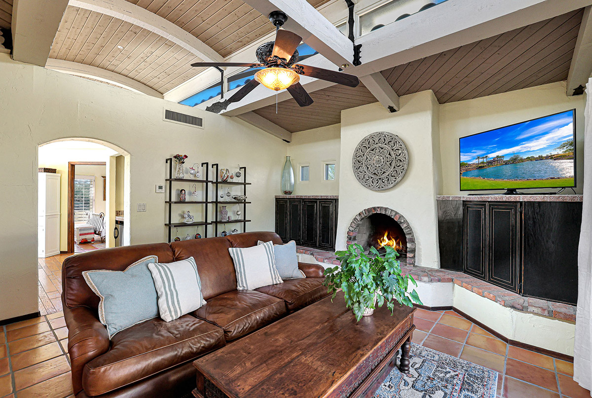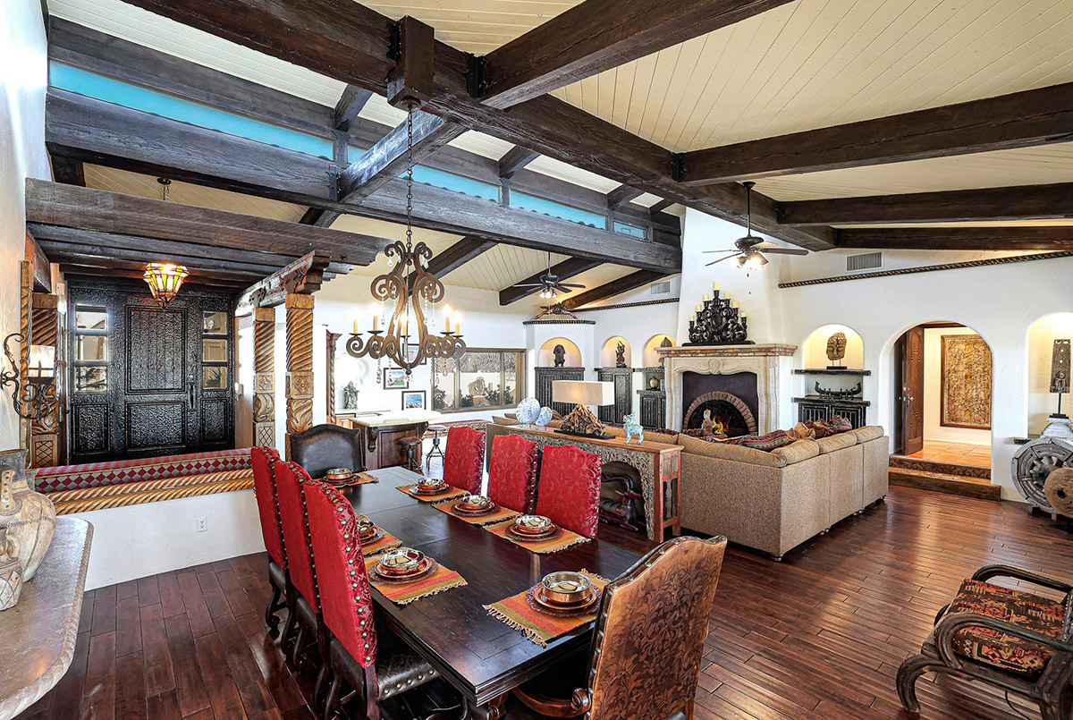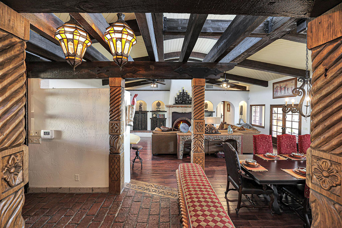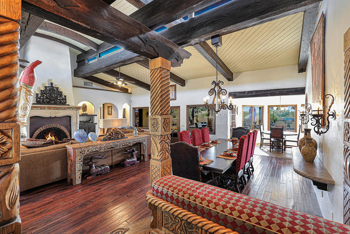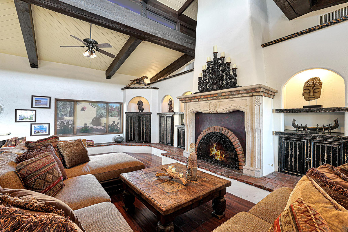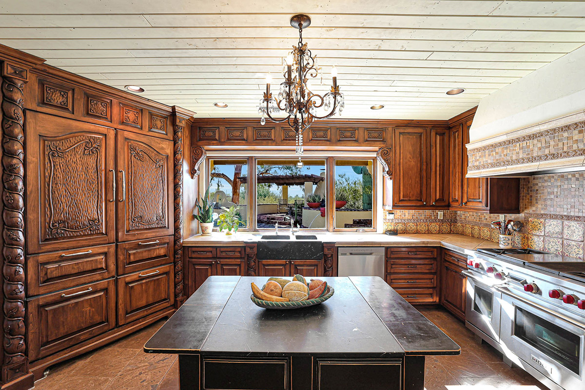 Upon entry take note of the custom details and finishes throughout. The open dining and living room spaces include a center piece grand fireplace, clerestory windows in the center vault for added natural light, a built-in bar, and dedicated entry way. The kitchen is in the heart of the home and connects the living spaces while featuring exquisite custom cabinetry with wood carved details, built-in display cabinet, gas cooktop, walk-in pantry, granite sink, mosaic tile surround, and a furniture grade center prep island.