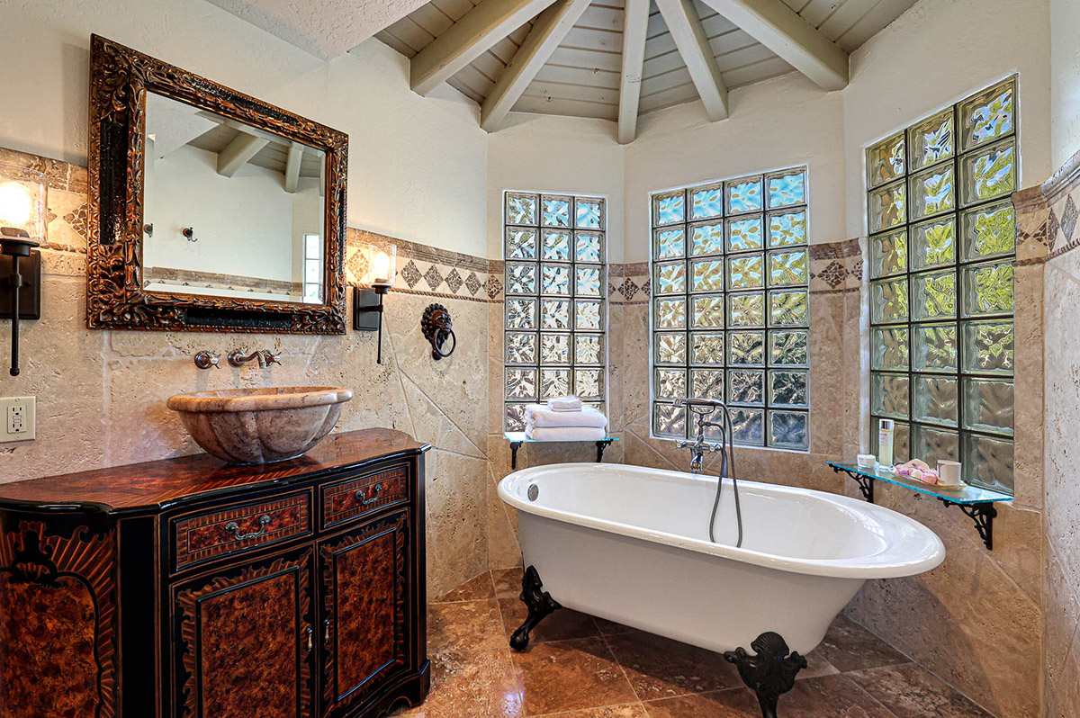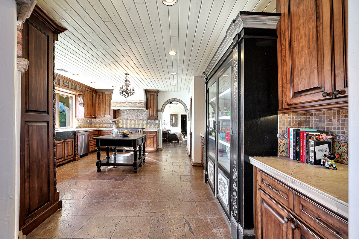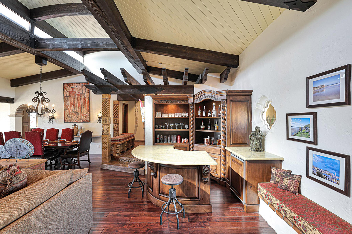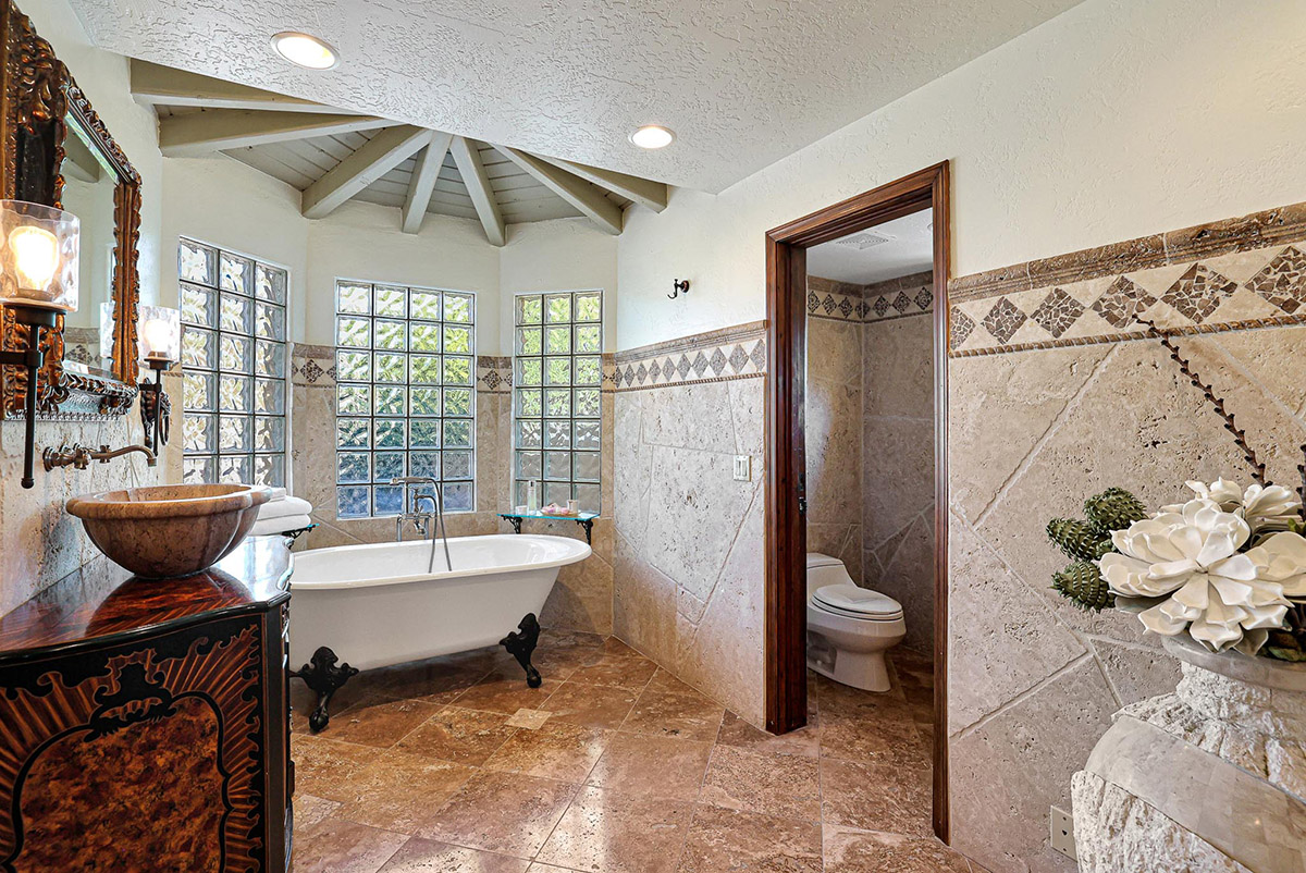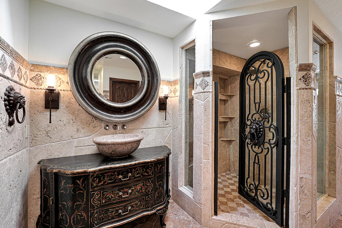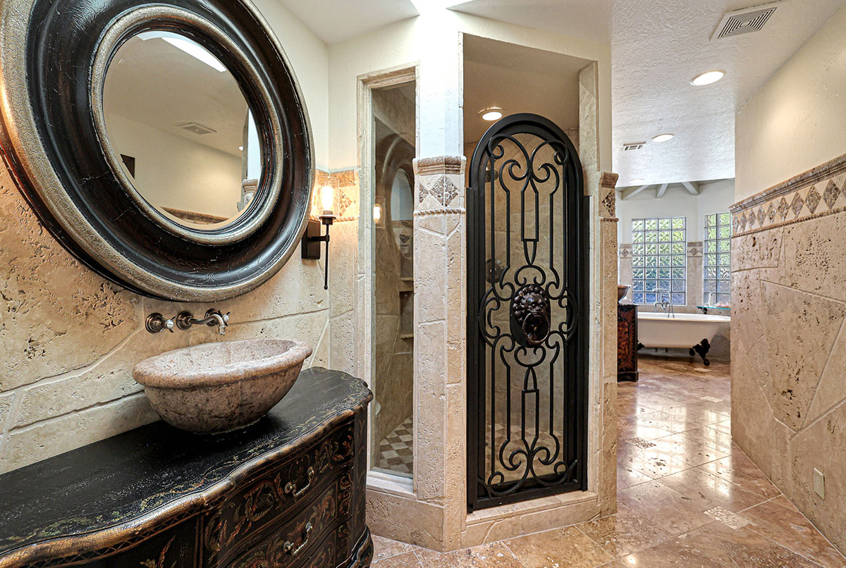 The master bedroom includes a separate sitting room, custom wood cabinetry built-ins, and a spa-like bath with separate sinks and furniture quality vanities, walk-in shower with wrought iron entry door, Canterra clad wall accents, claw foot tub, and private water closet. Other spaces include two main home guest bedrooms with a Jack’n’Jill hall bath, family room with attached bath (steam shower!), wine display room, bonus room currently furnished as a pub, breakfast nook overlooking the pool, and an oversized laundry room with additional storage space. The guest house includes a living room, kitchenette with seating space, a private bedroom and bath.
