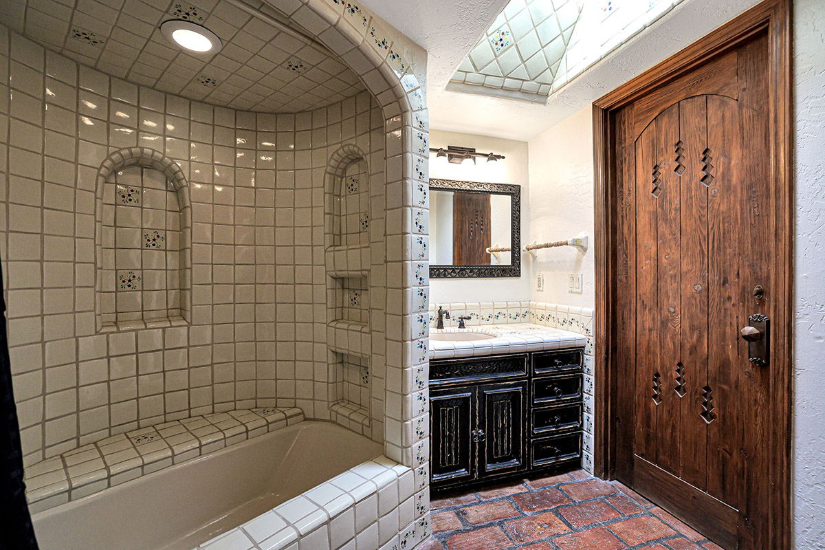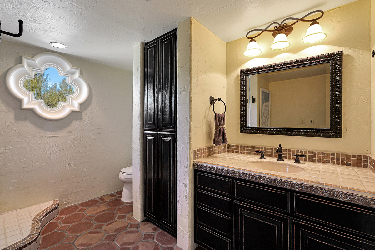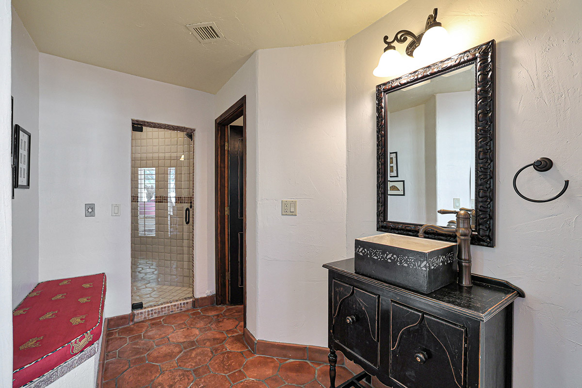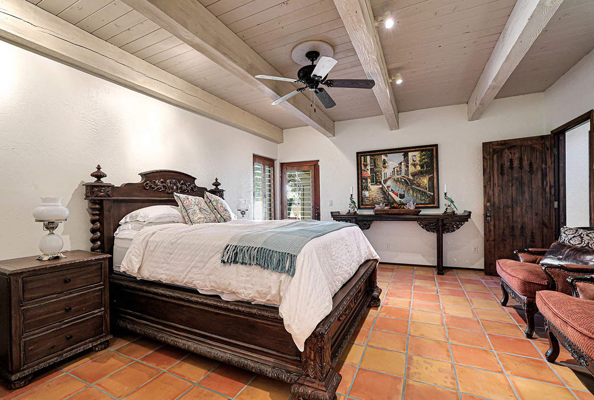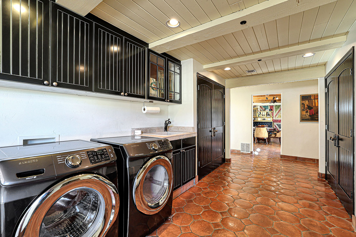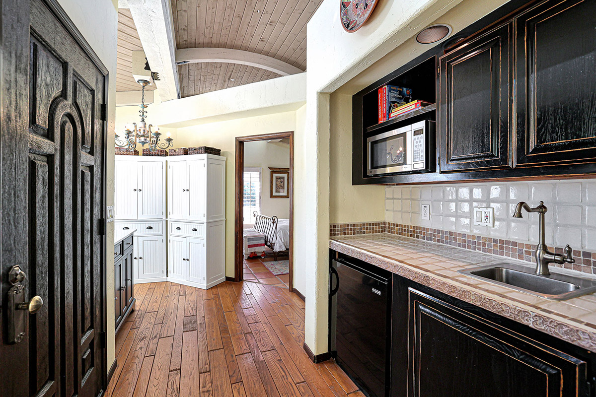 The master bedroom includes a separate sitting room, custom wood cabinetry built-ins, and a spa-like bath with separate sinks and furniture quality vanities, walk-in shower with wrought iron entry door, Canterra clad wall accents, claw foot tub, and private water closet. Other spaces include two main home guest bedrooms with a Jack’n’Jill hall bath, family room with attached bath (steam shower!), wine display room, bonus room currently furnished as a pub, breakfast nook overlooking the pool, and an oversized laundry room with additional storage space. The guest house includes a living room, kitchenette with seating space, a private bedroom and bath.