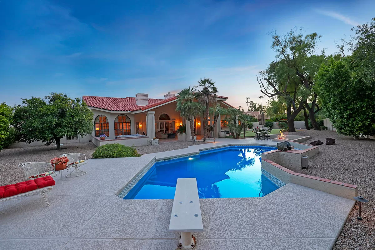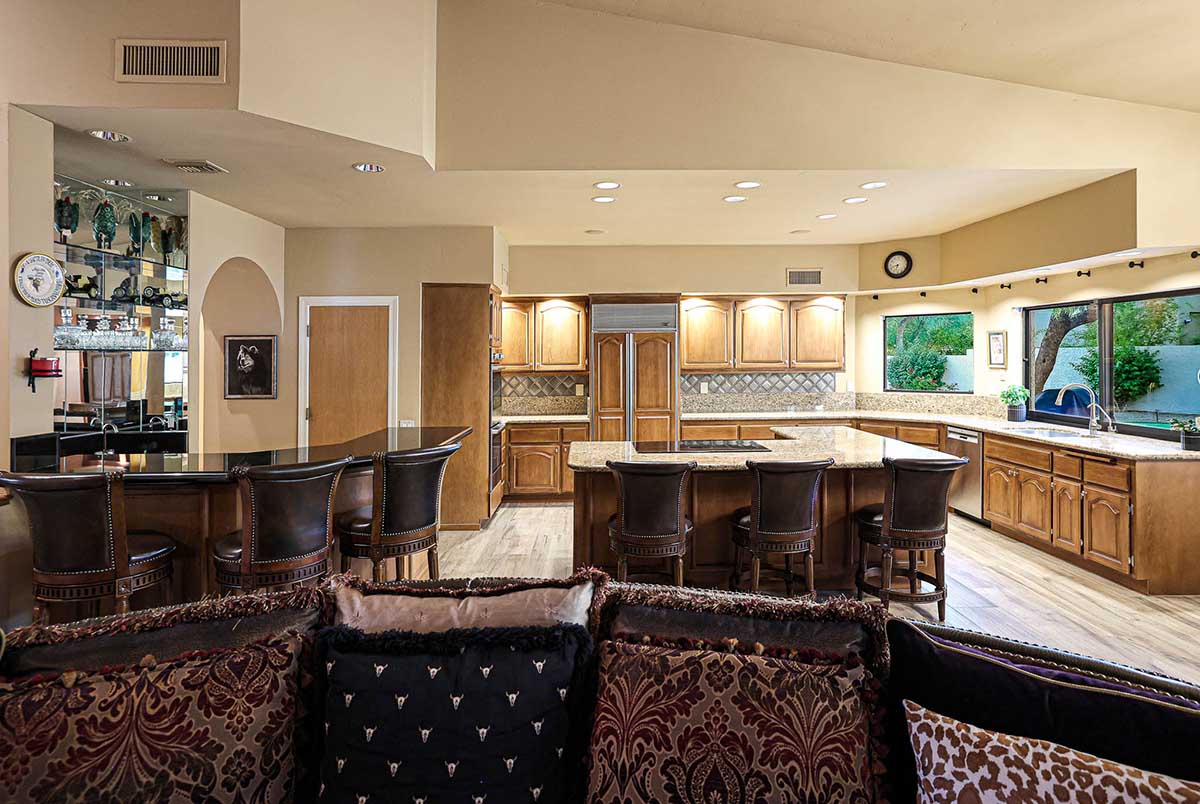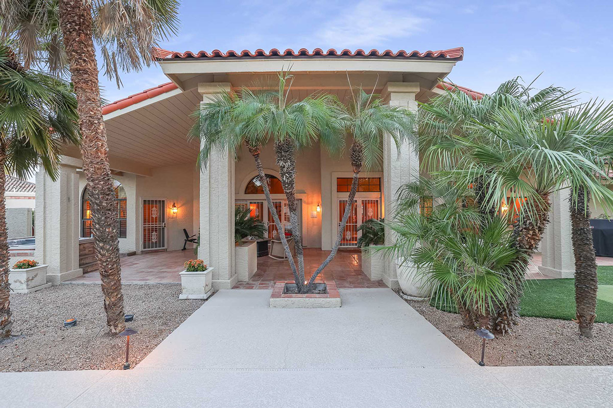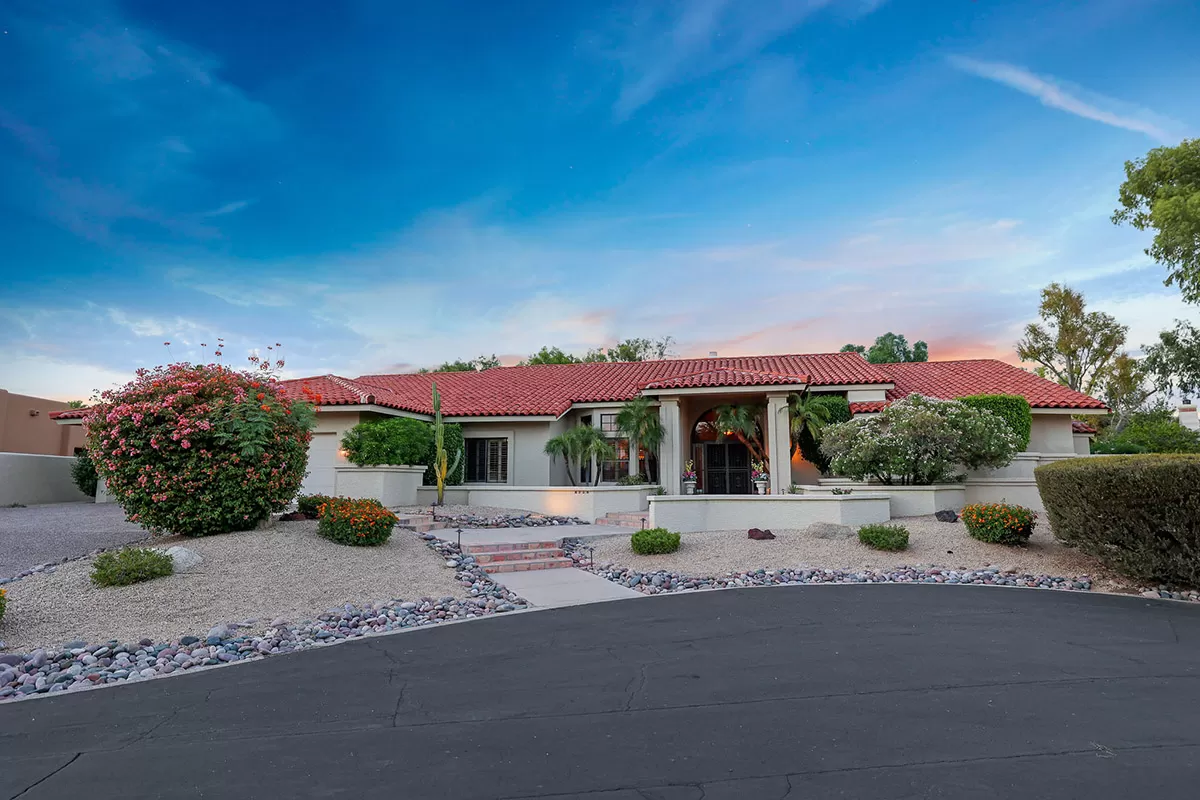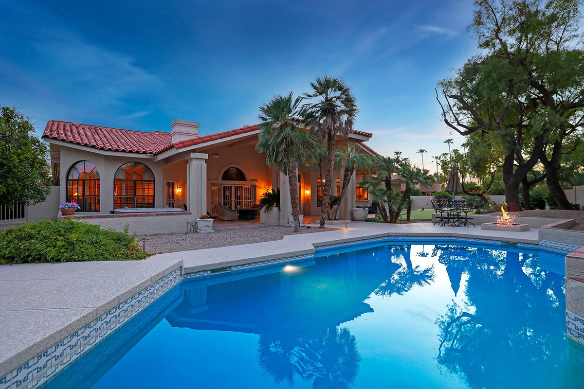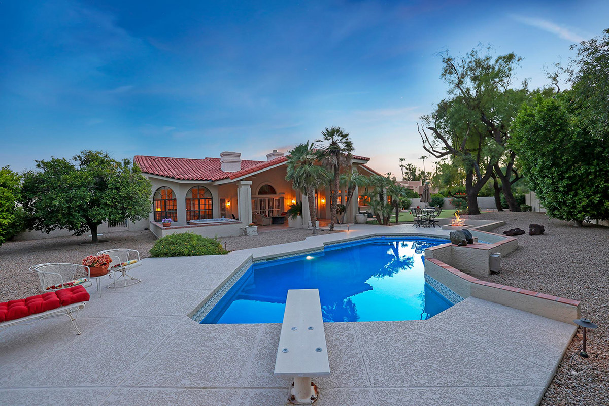 Pinnacle Peak Country Club custom home with a large half acre lot has the perfect yard for entertaining. Backing to the 14th Fairway of Pinnacle Peak Country Club’s private course, enjoy guard gated living from the over 3600 square foot home. Located on a cul-de-sac, the elevated entry has a private feel along with a three car garage for ample parking. Once inside, take note of the high ceilings and the great room floor plan.