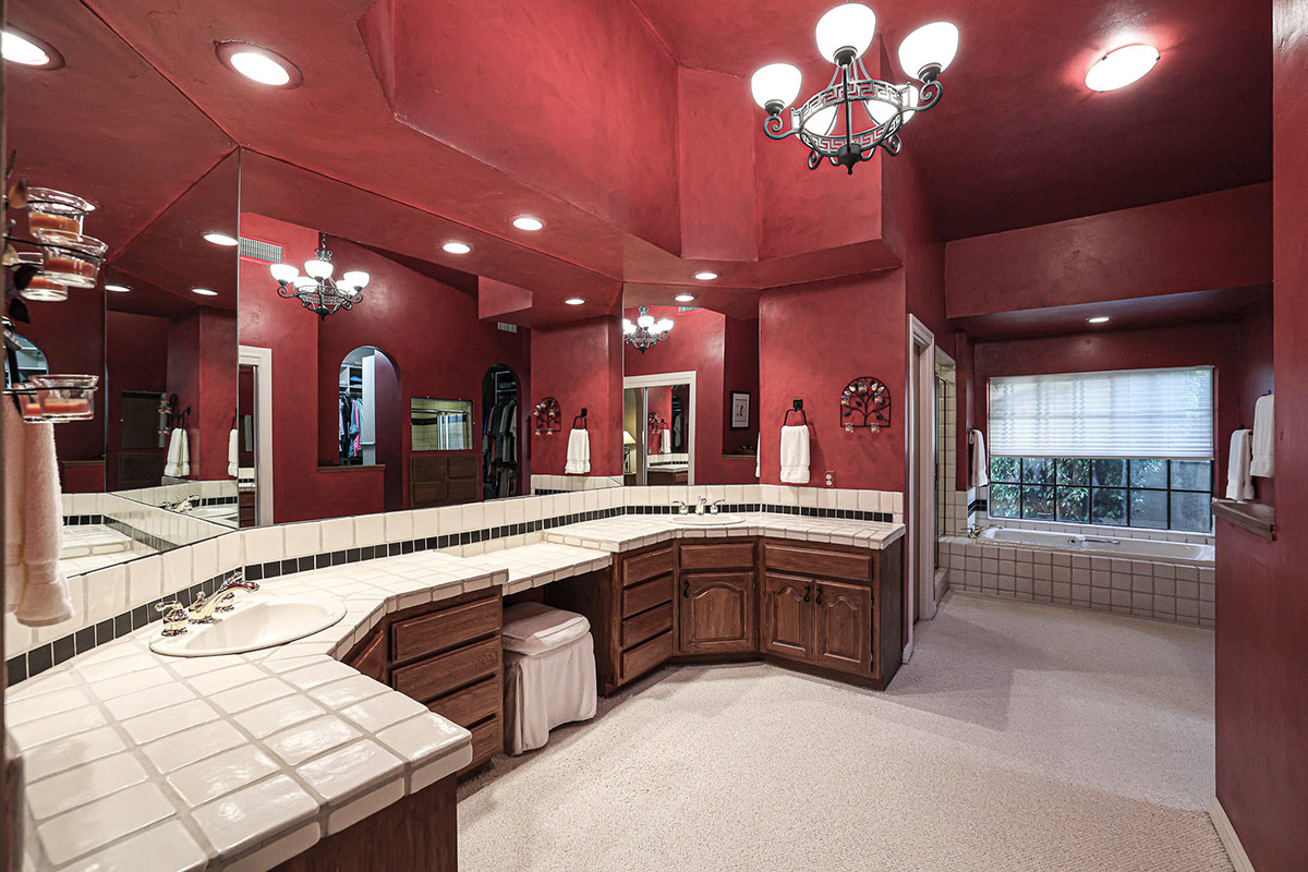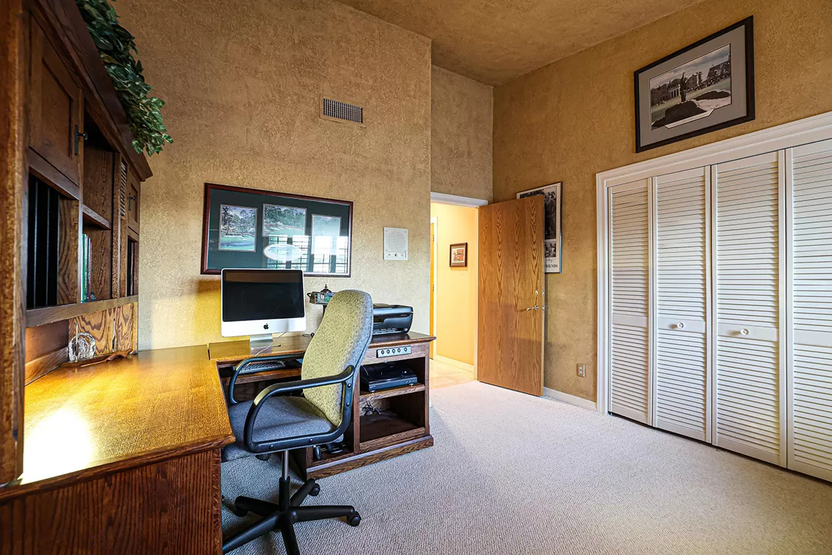 Three bedrooms include a main master and a jr. master, on opposite wings of the home, along with an ensuite guest room currently used as a private office with adjacent full bath. The family room, which features a cozy fireplace and a centerpiece wet bar, opens to both the formal dining room and the large kitchen.