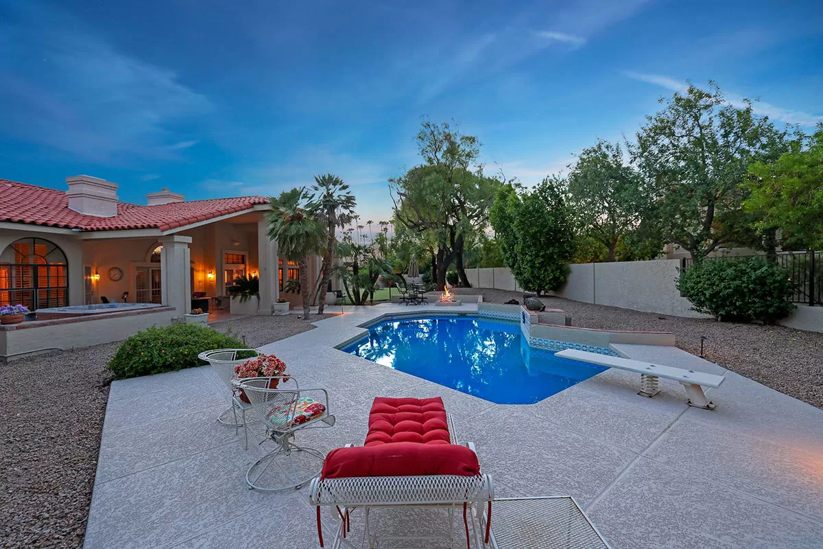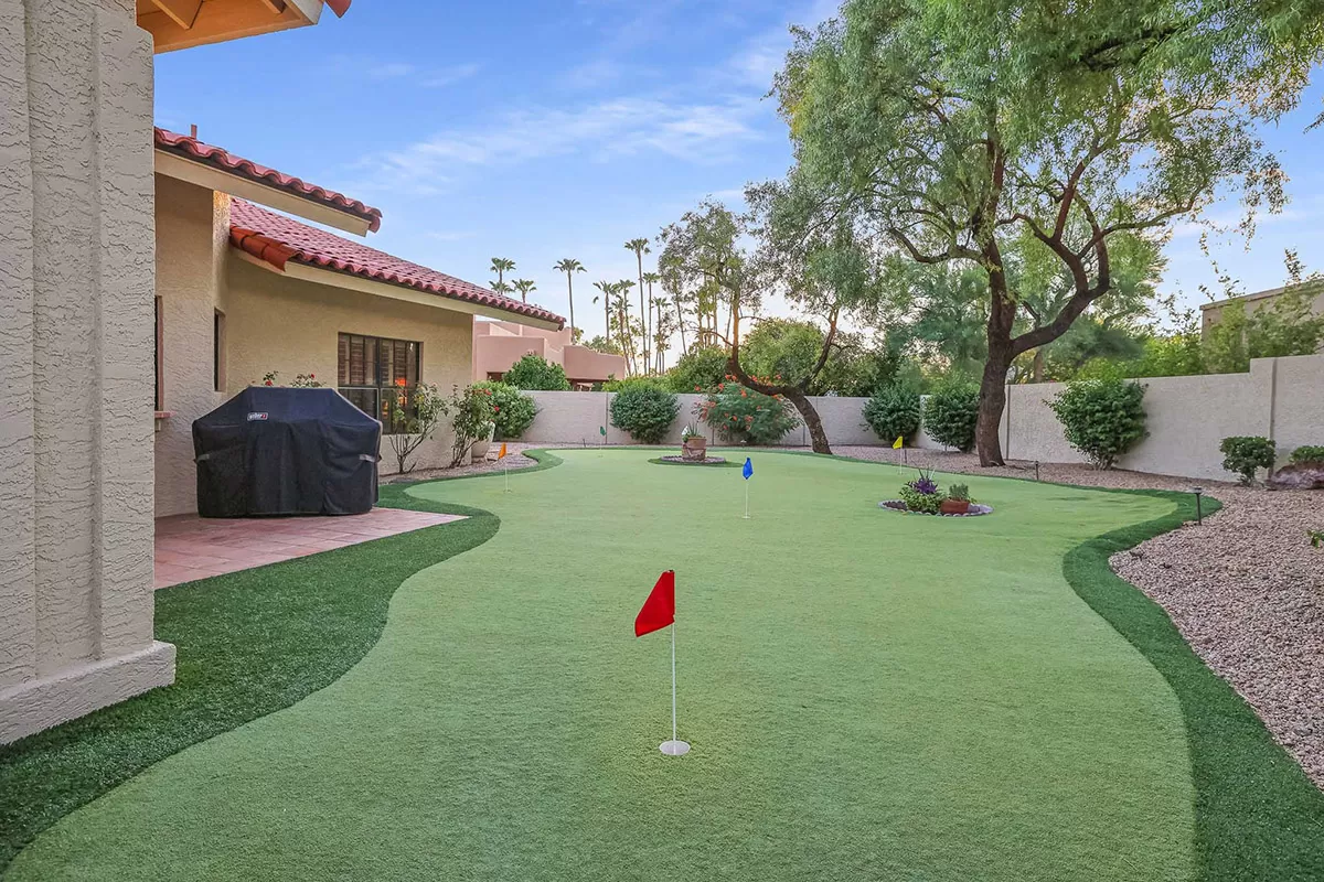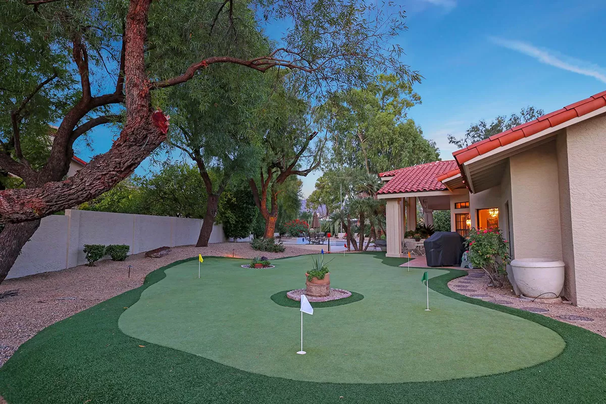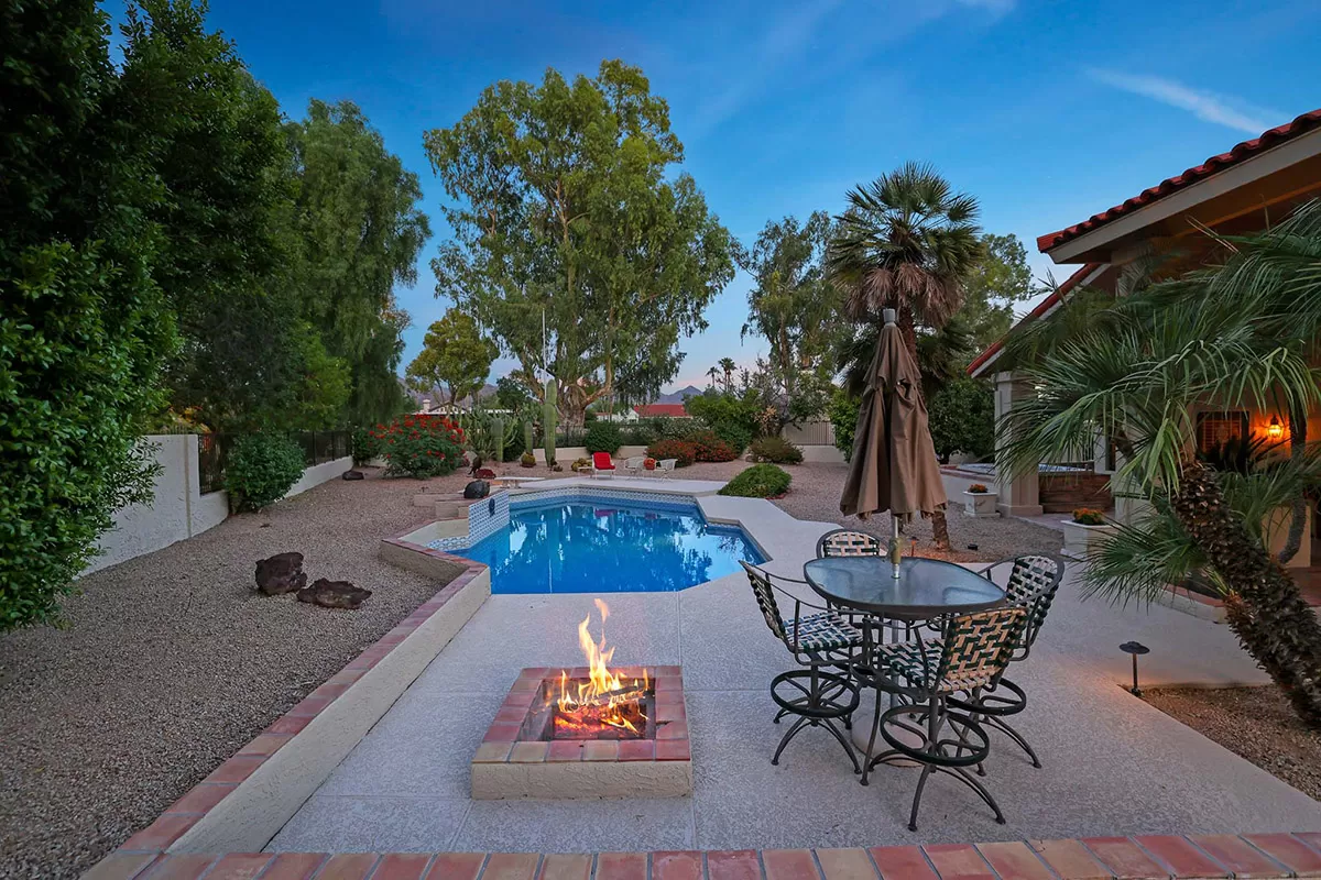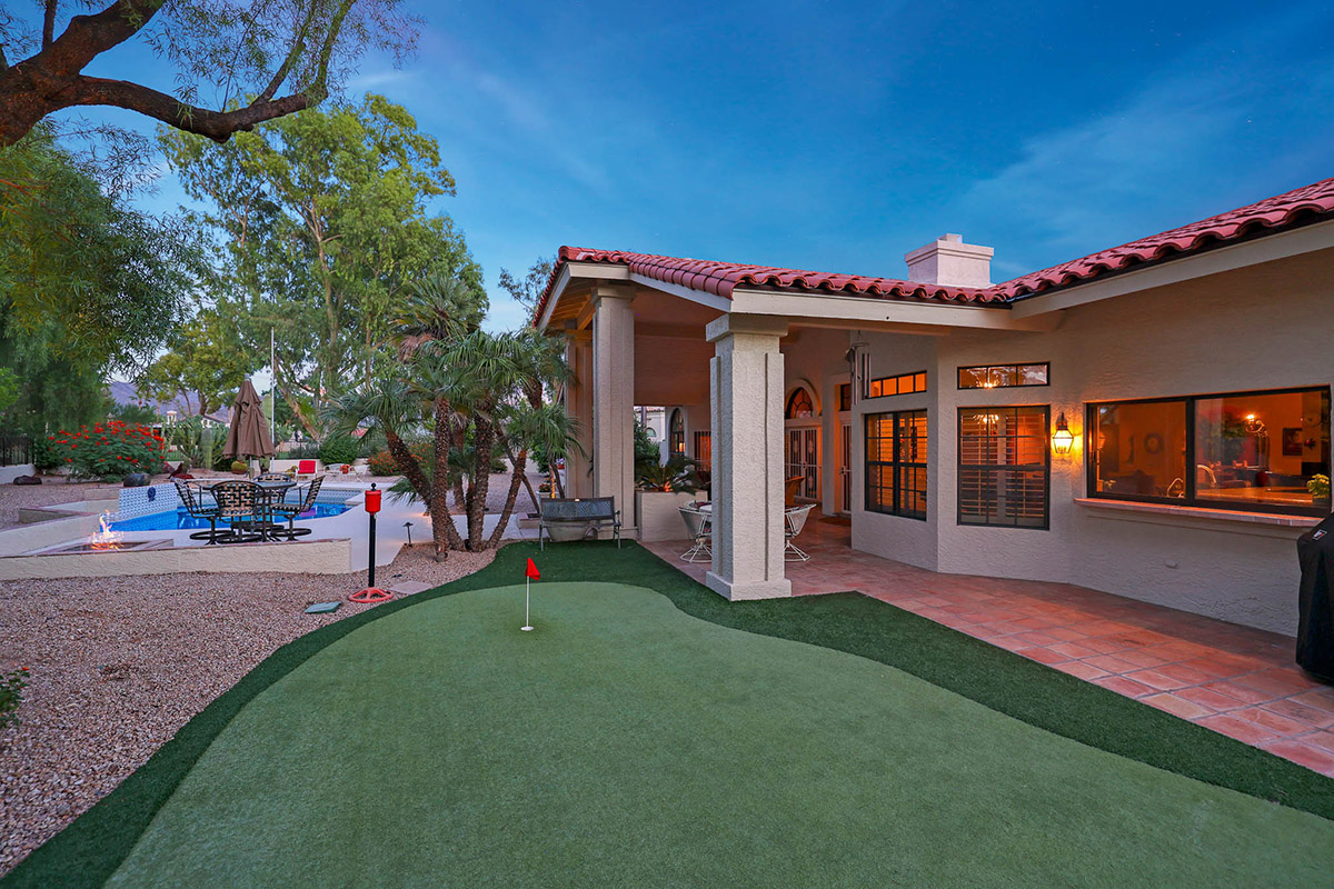 The backyard has a six hole artificial turf putting green, Pebble Tec salt water diving pool, spa in its own private courtyard, large covered patio, ample side yards, a private gate to the golf course, fire pit, and views of the McDowell Mountains and the large trees that line the golf course for a private feel.